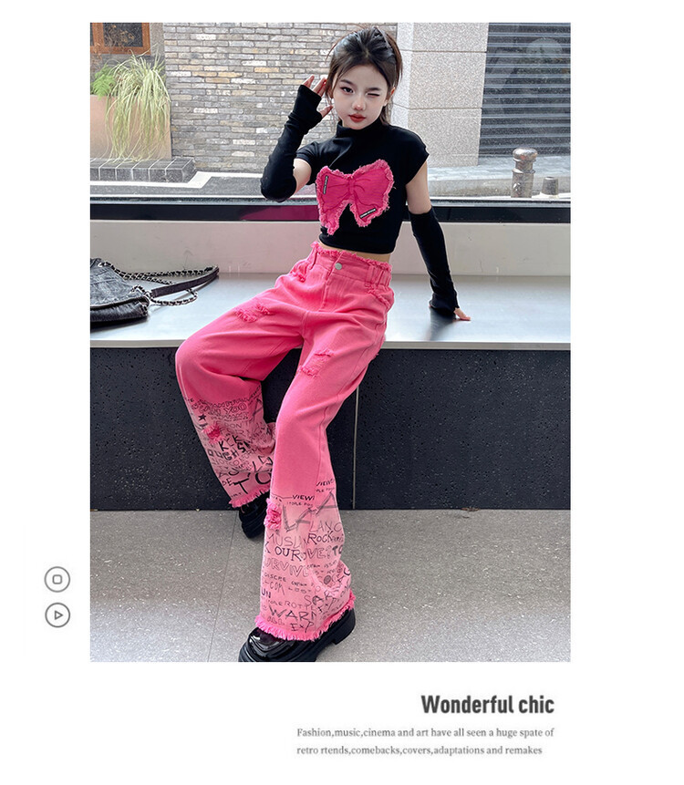 대외 무역 타이드 퀴어 아동복 소녀 점진적 변화 세트 한 팬 Zhong Da 어린이 유행 깨진 소매 티셔츠 와이드 레그 바지 투피스 세트