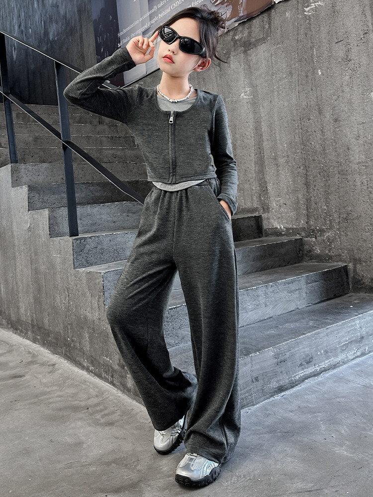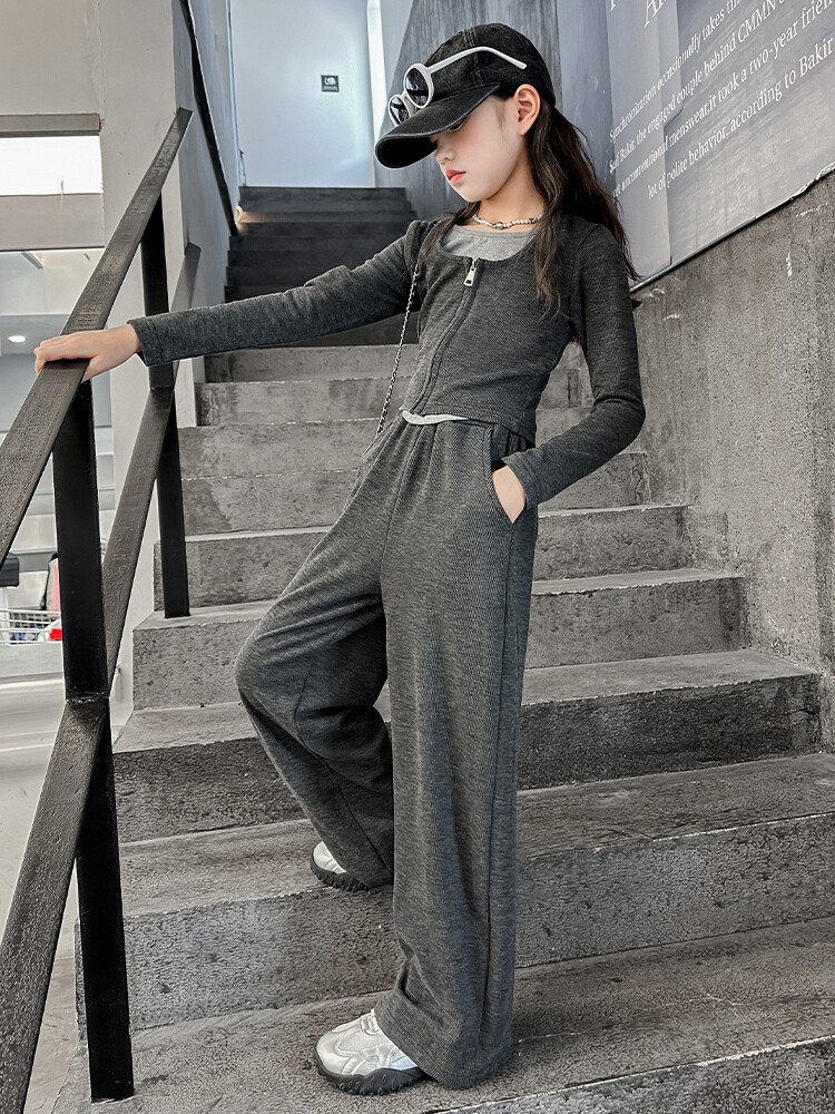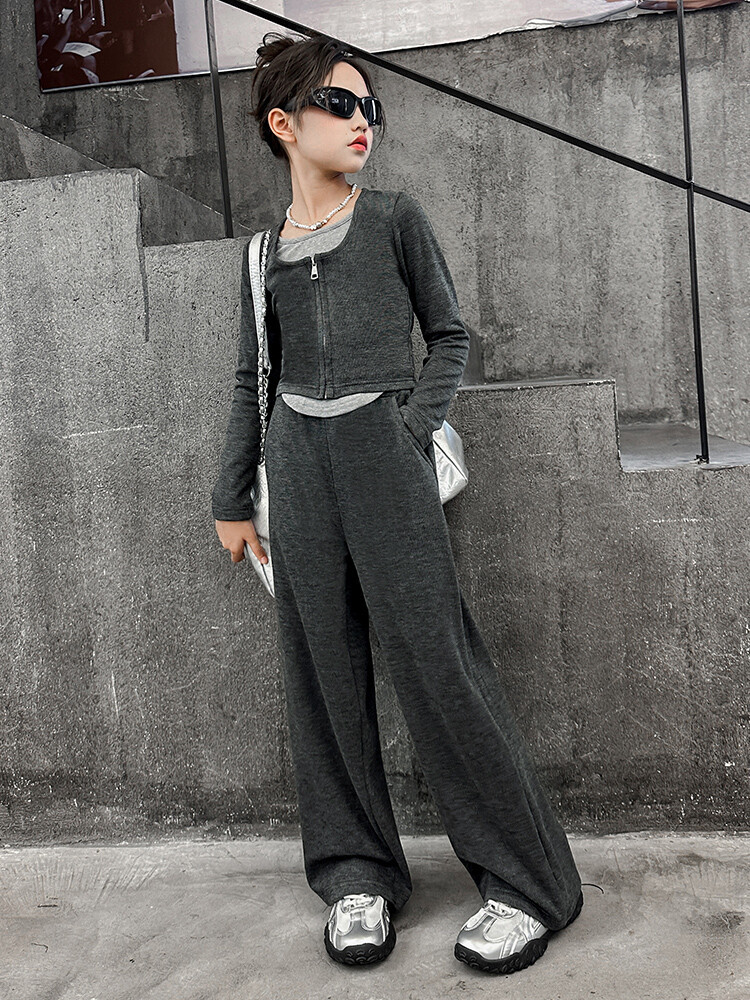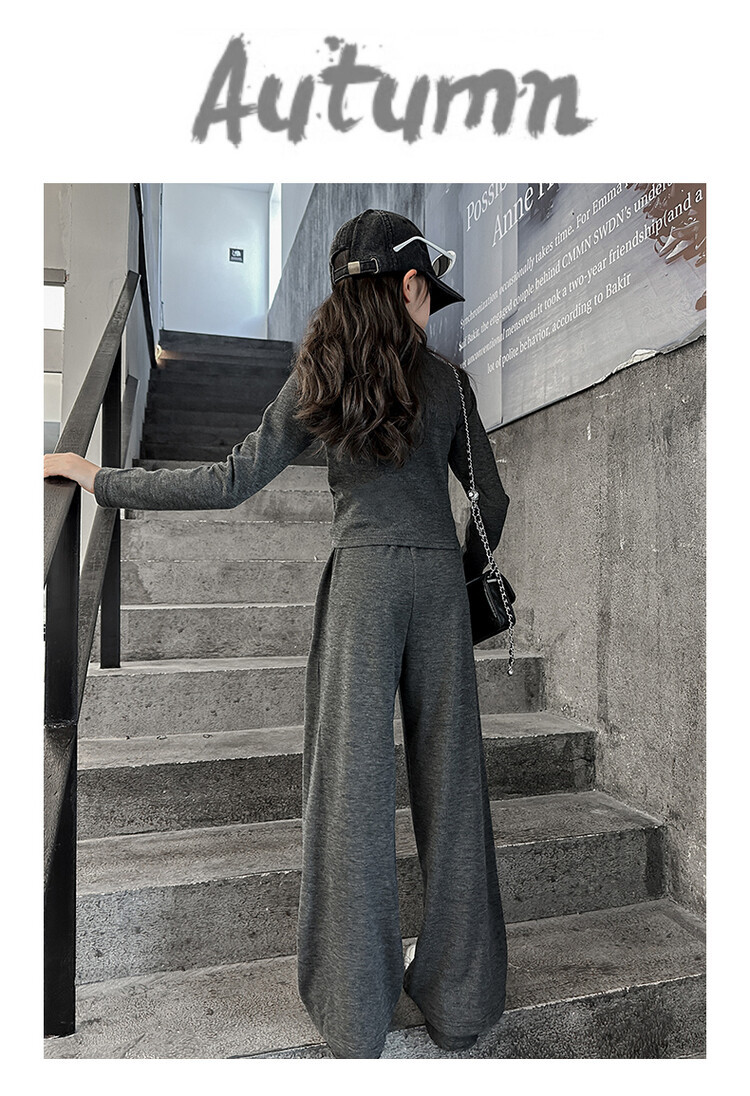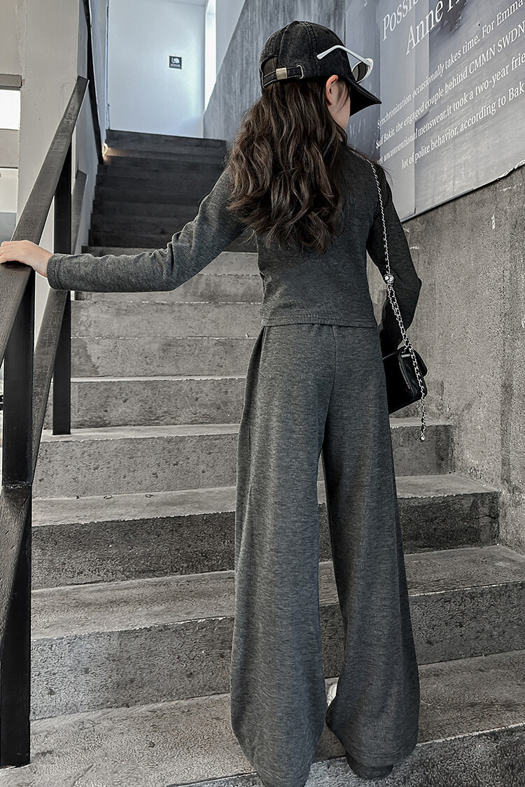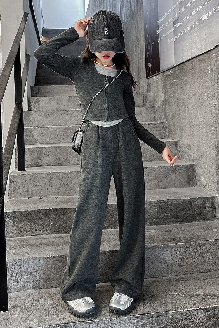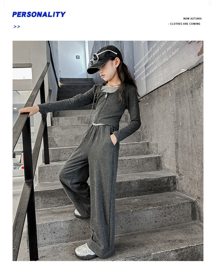 어린이 캐주얼 가짜 투피스 탑 와이드 레그 바지 니트 스포츠 투피스 세트 소녀 2024 가을 세트 새로운