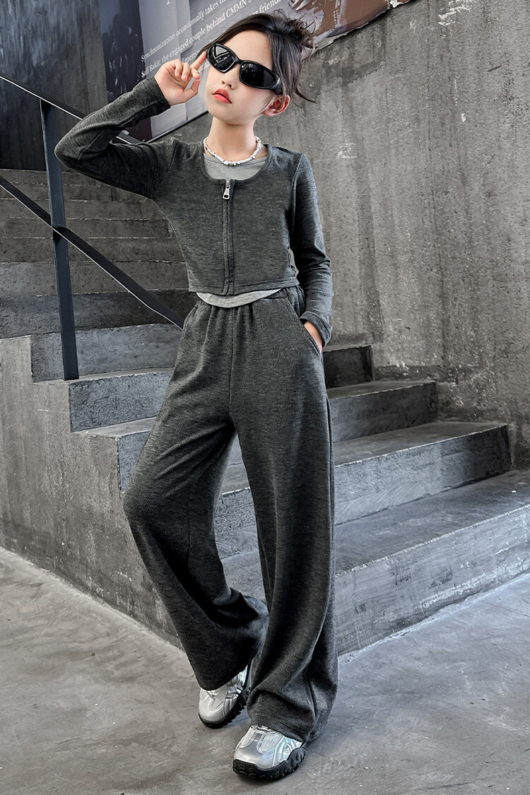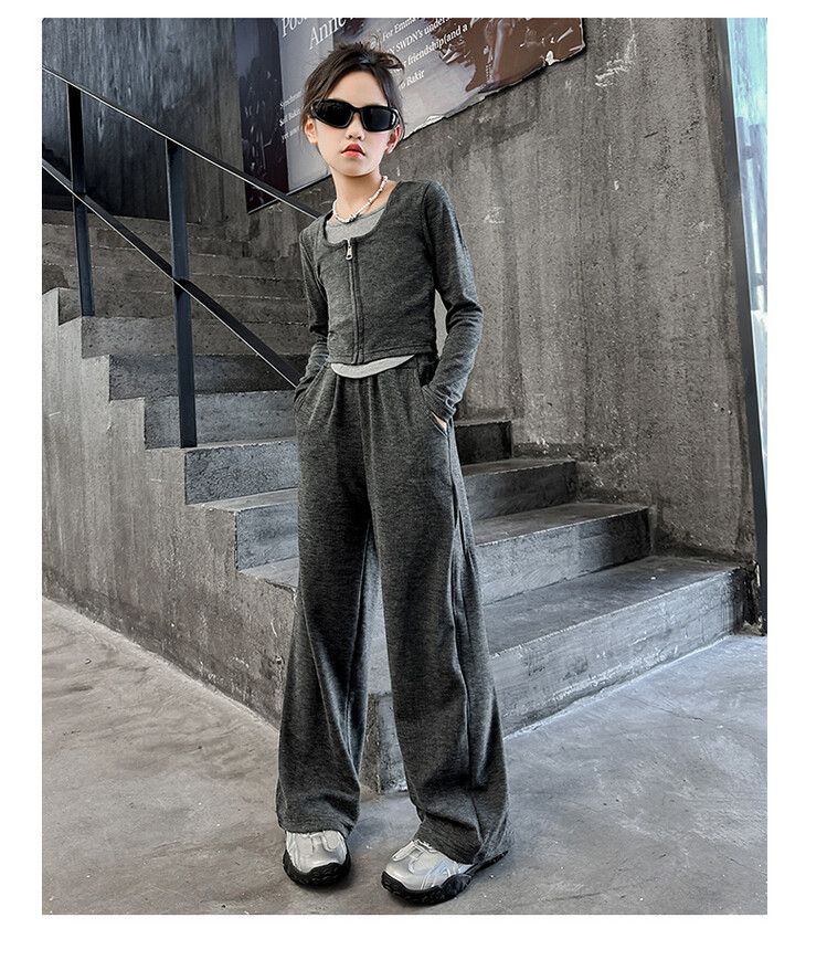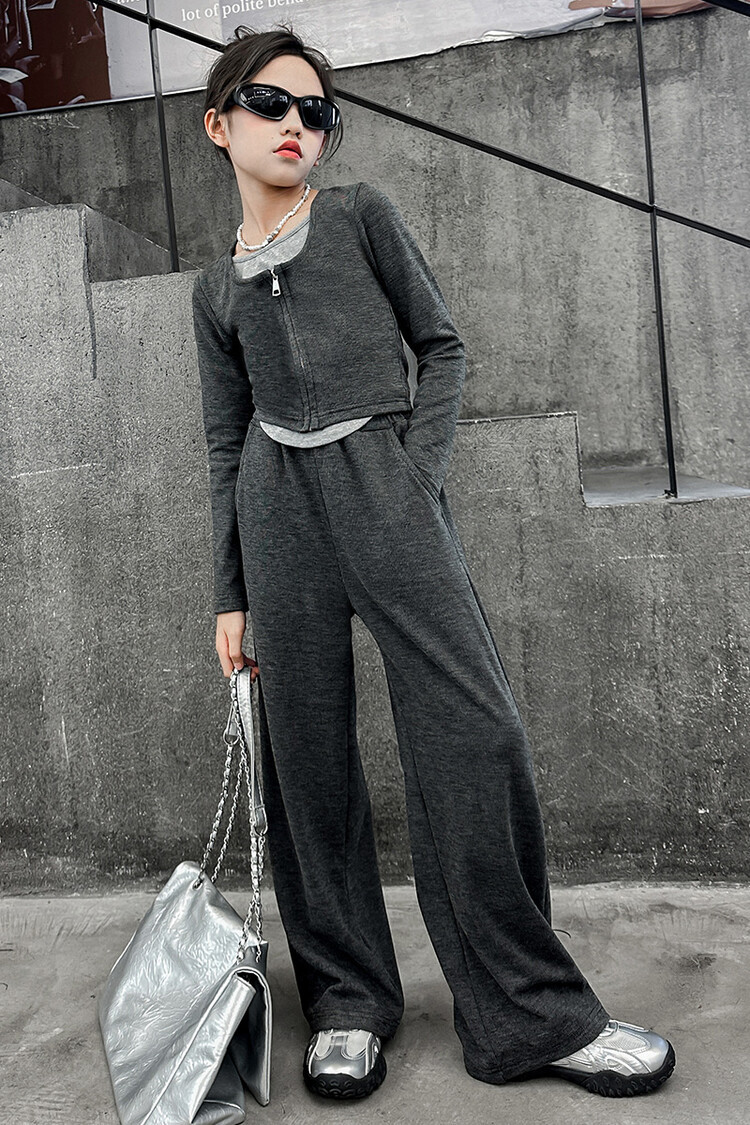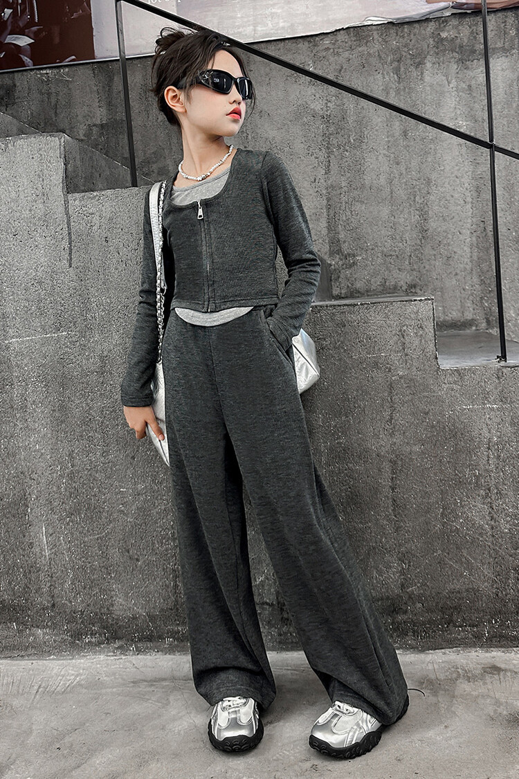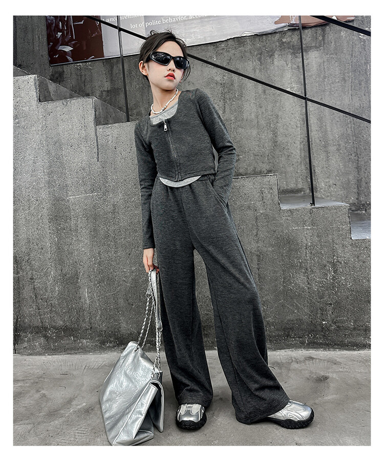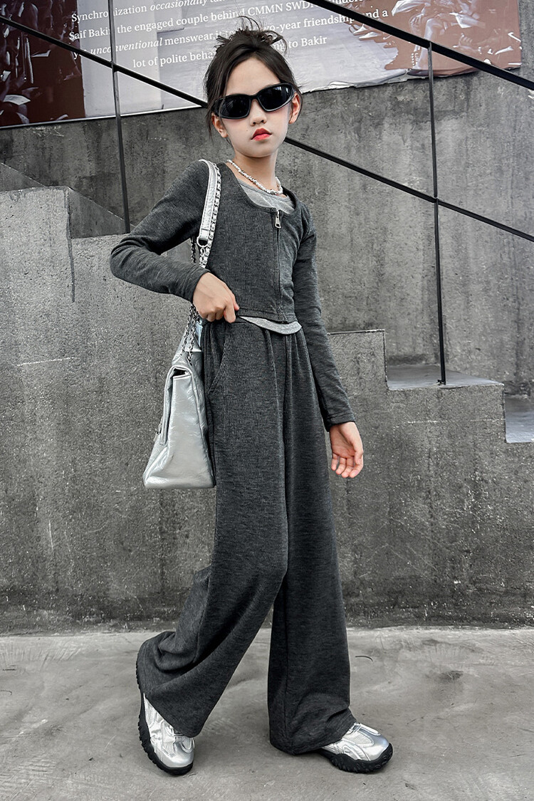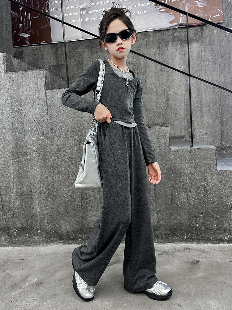 어린이 캐주얼 가짜 투피스 탑 와이드 레그 바지 니트 스포츠 투피스 세트 소녀 2024 가을 세트 새로운