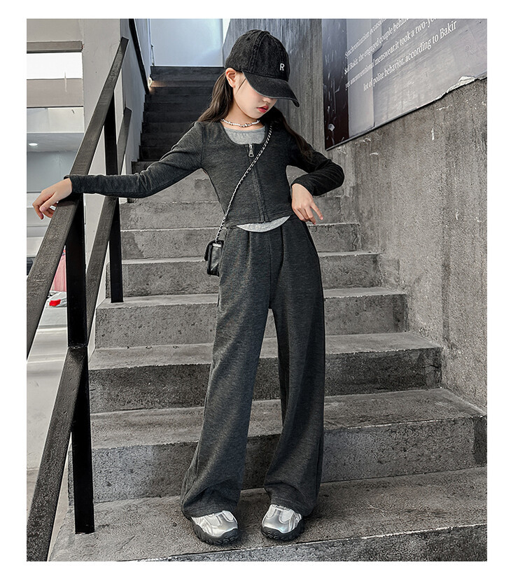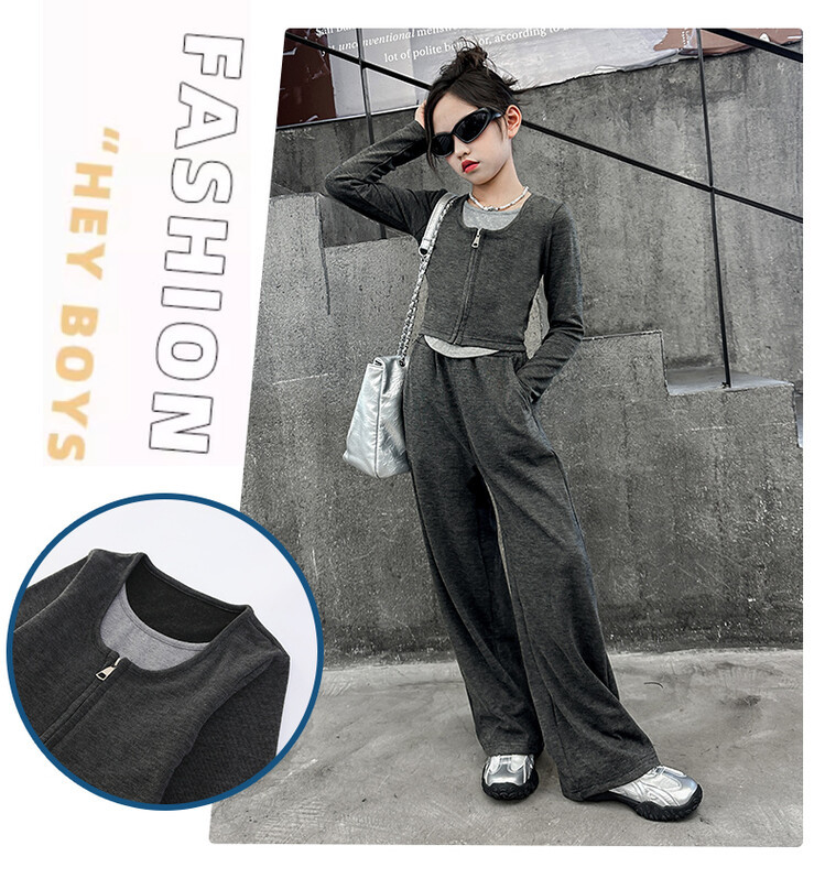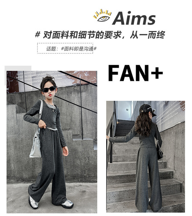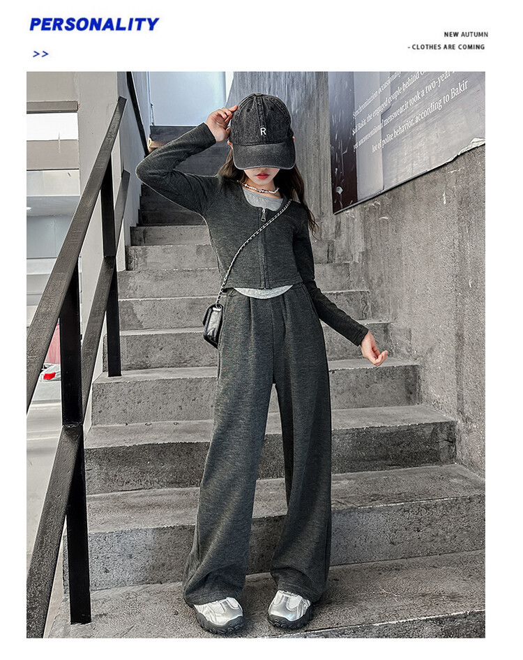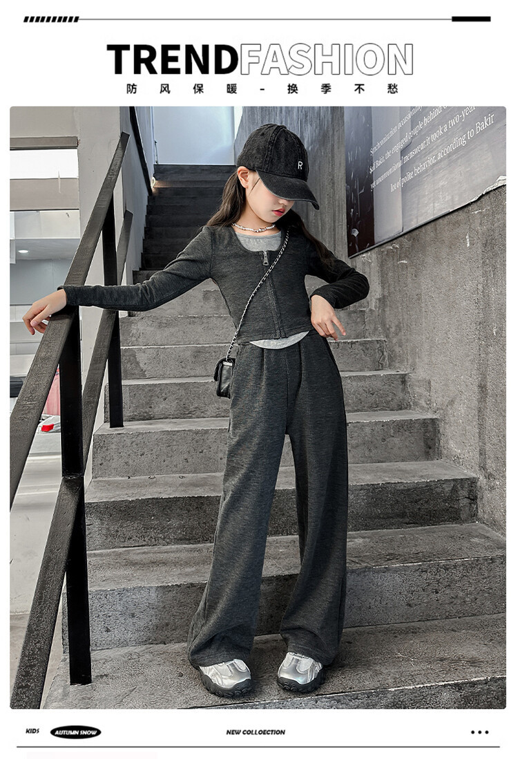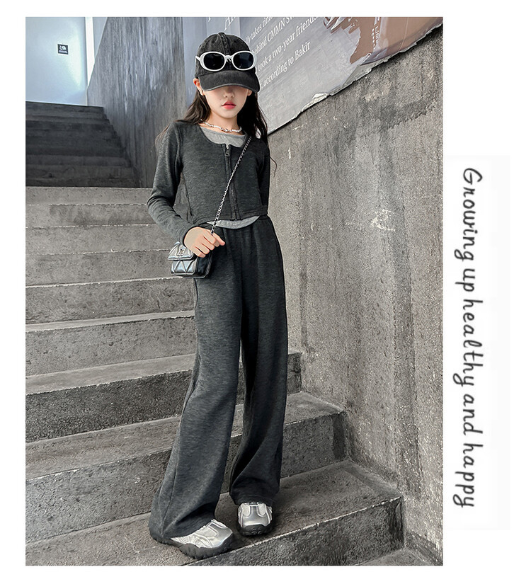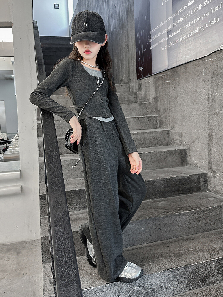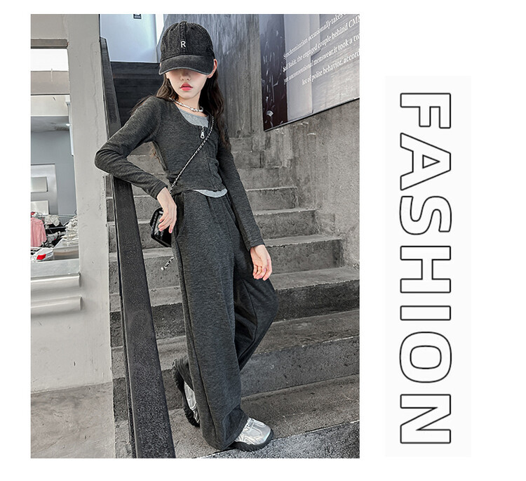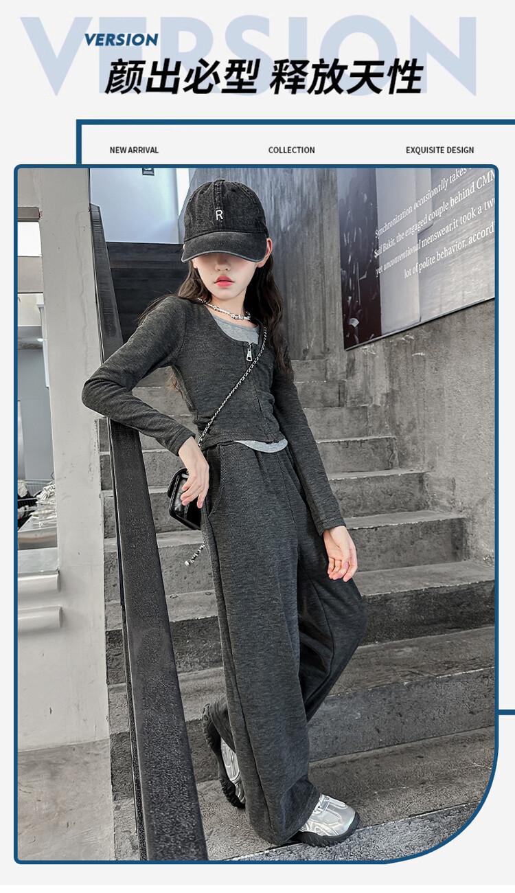 어린이 캐주얼 가짜 투피스 탑 와이드 레그 바지 니트 스포츠 투피스 세트 소녀 2024 가을 세트 새로운스토어 가기