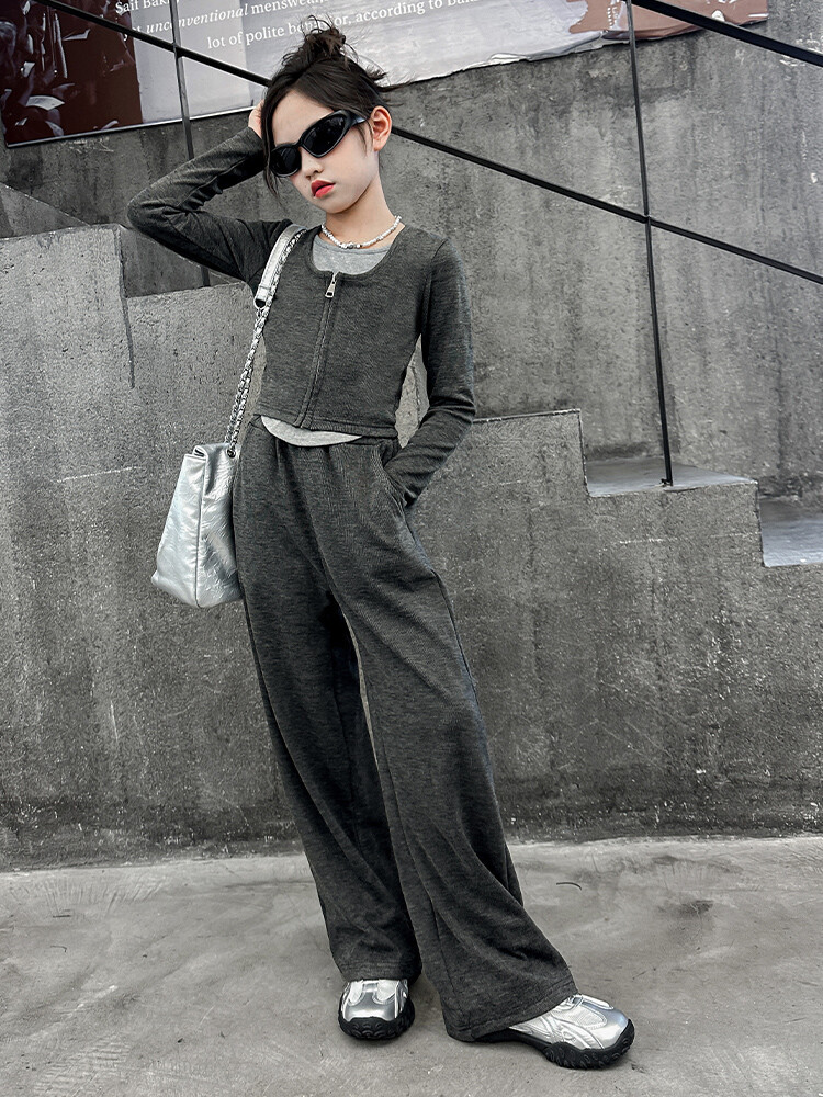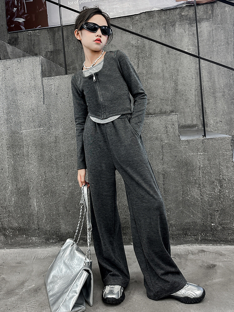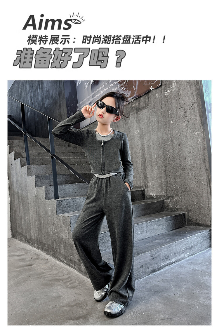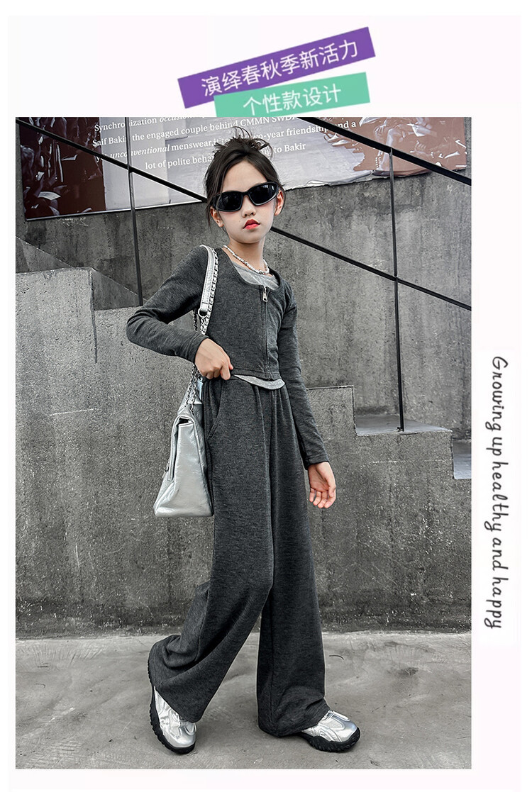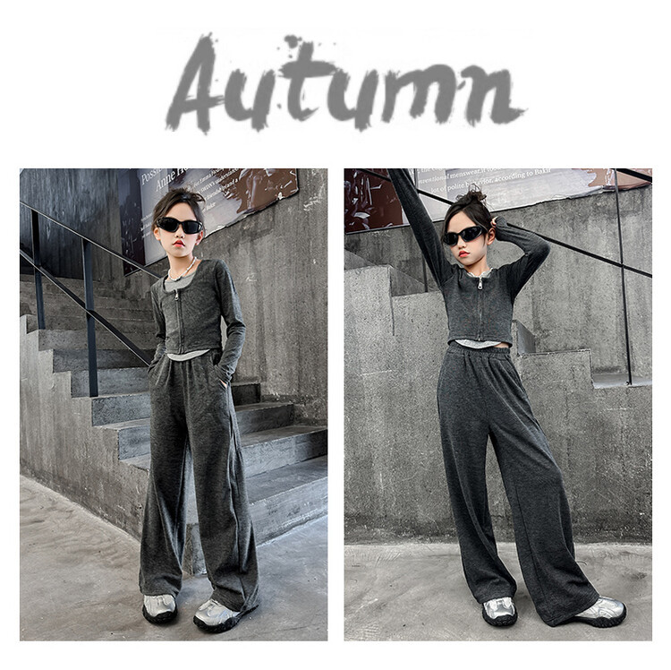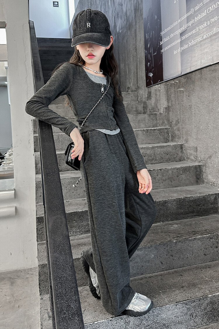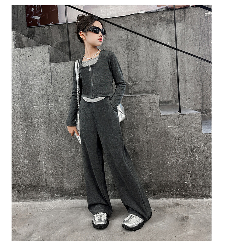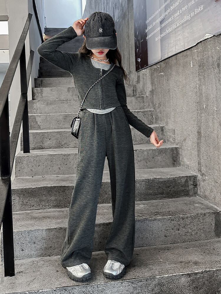 어린이 캐주얼 가짜 투피스 탑 와이드 레그 바지 니트 스포츠 투피스 세트 소녀 2024 가을 세트 새로운스토어 가기