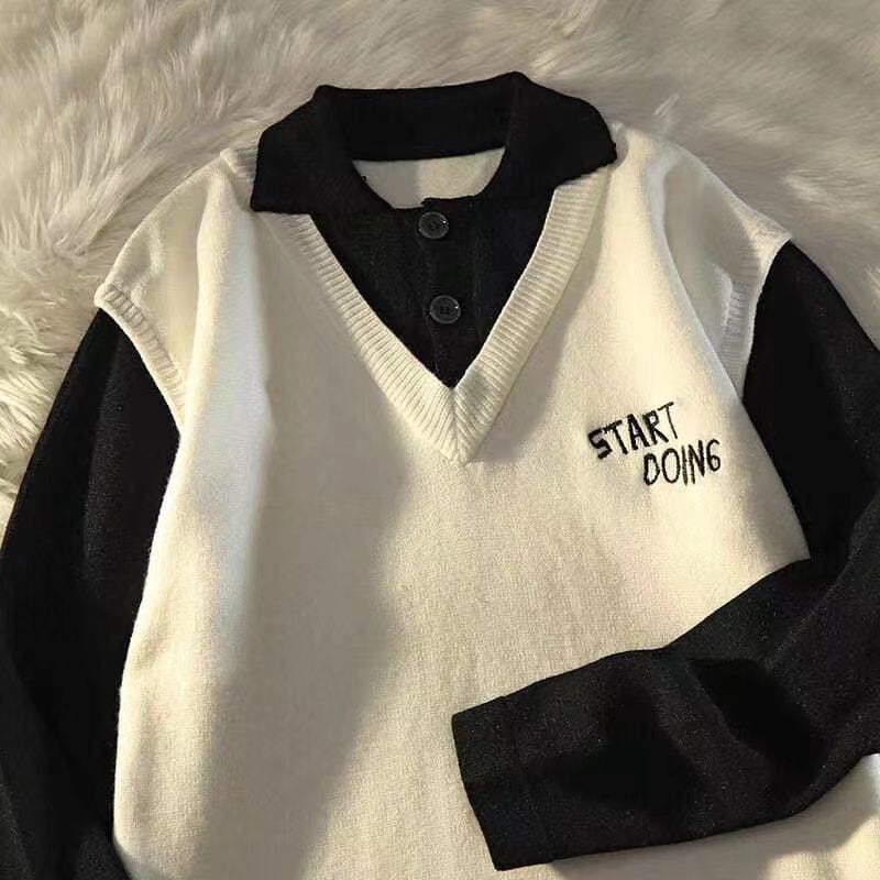 아카데미 스타일의 가짜 투피스 스티칭 스웨터 남자 봄과 가을 In 한국식 V-넥 보토밍 스웨터 루즈 핸섬 재킷스토어 가기