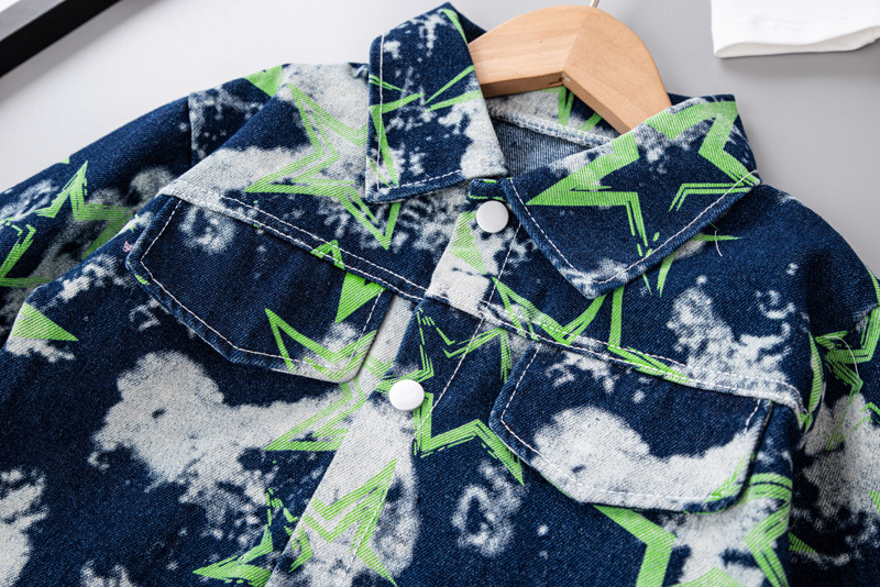 어린이 봄 가을 옷 세트 2024 새 소년 아기 잘 생긴 넥타이-염료 스타 데님 재킷 3 피스 세트