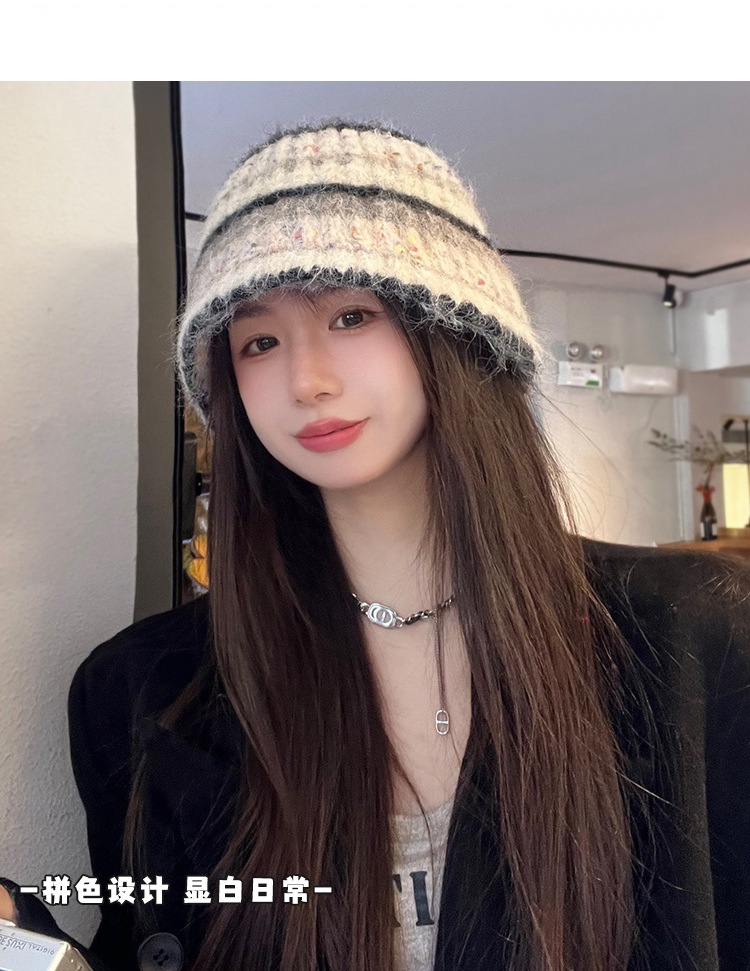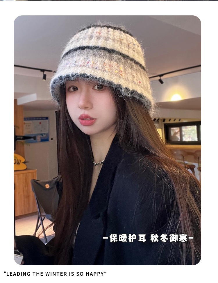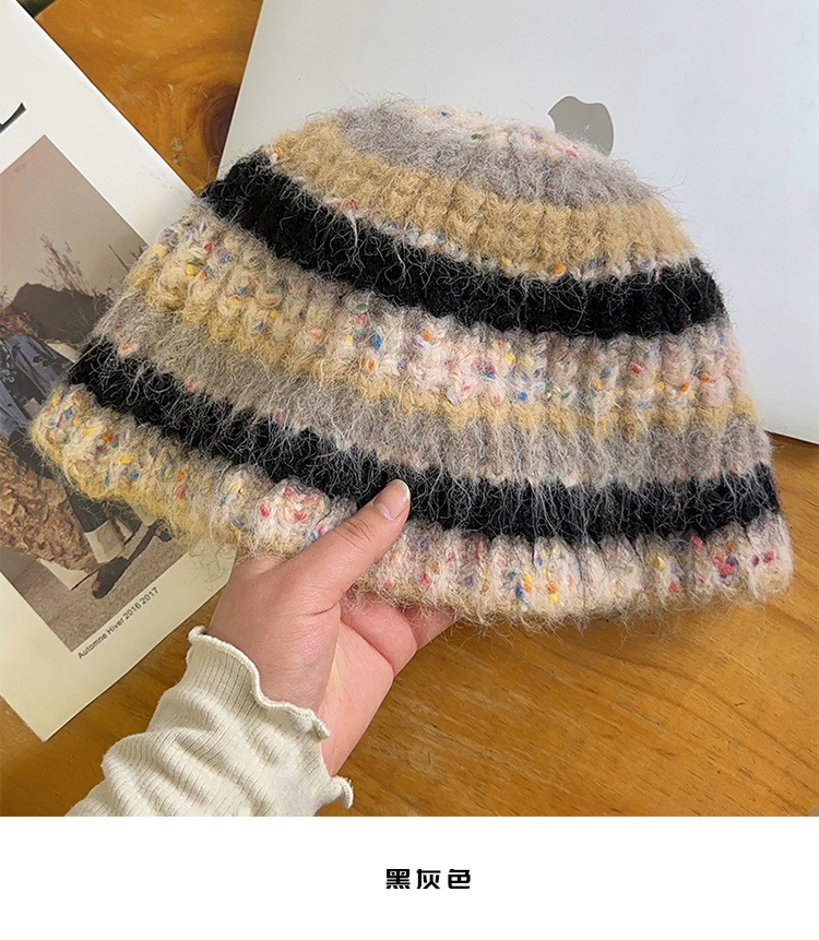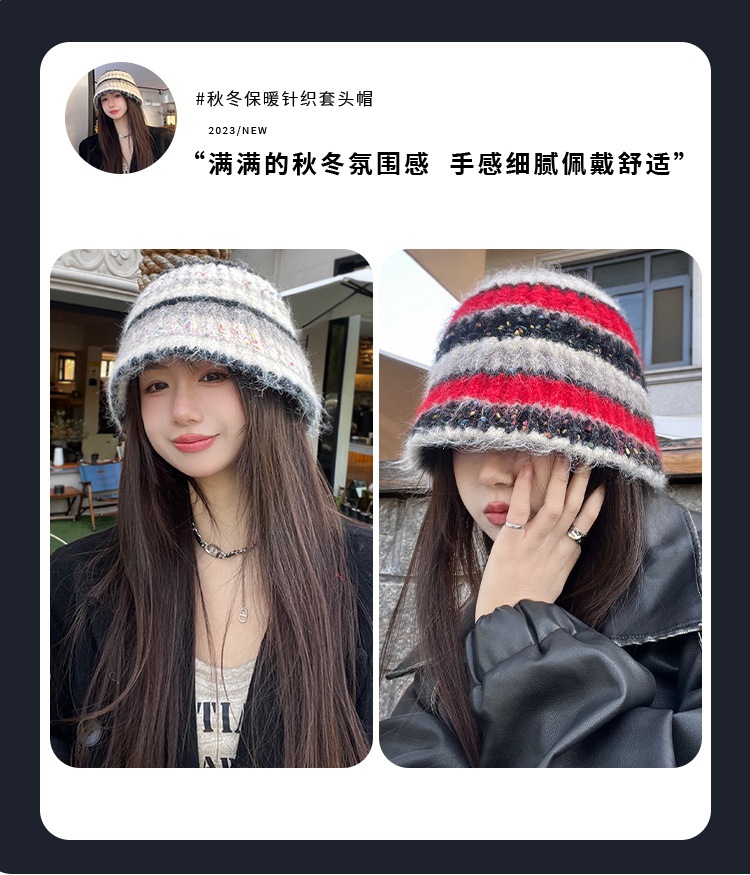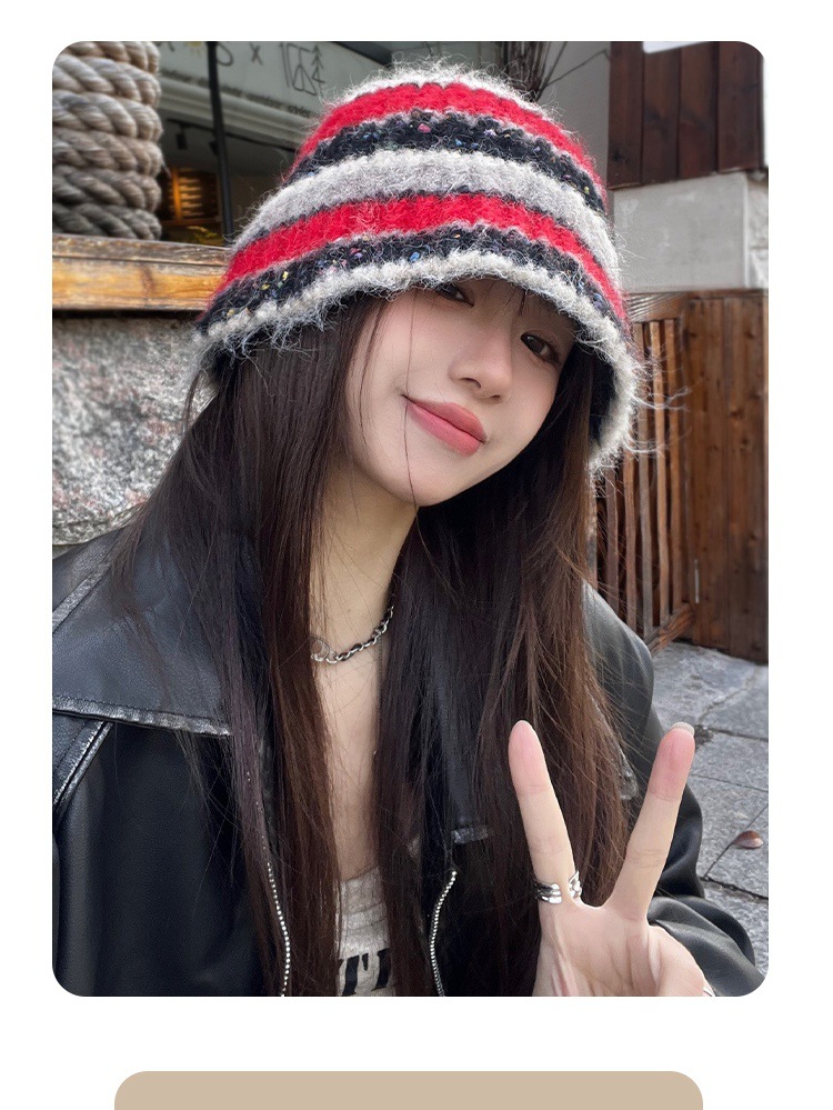 2023 새로운 줄무늬 분지 모자 겨울 따뜻한 니트 봉제 어부 모자 한국식 올매치 양모 양털 모자 여성스토어 가기