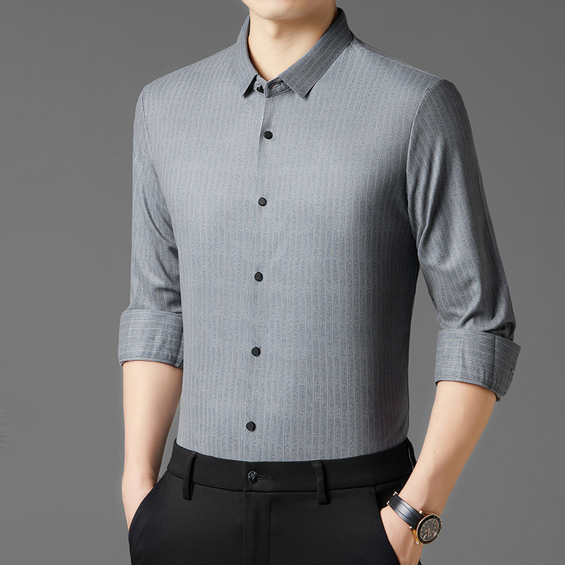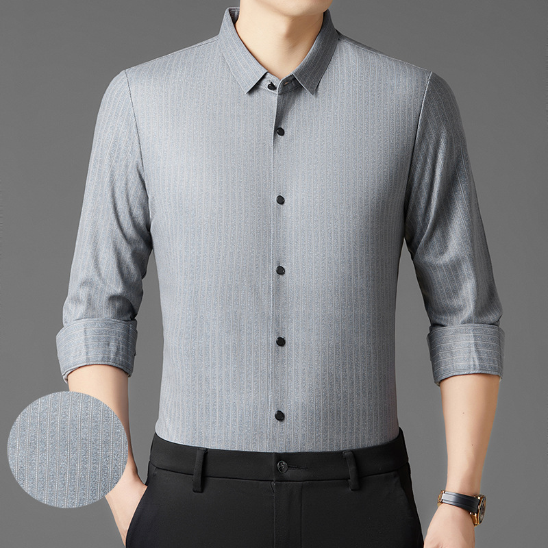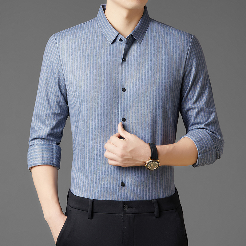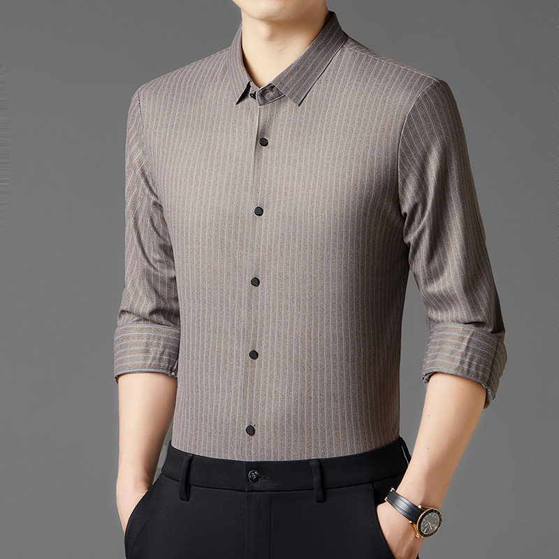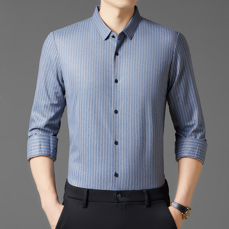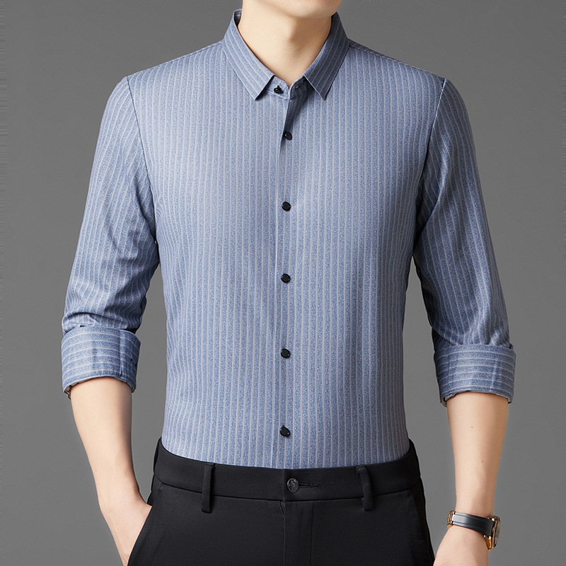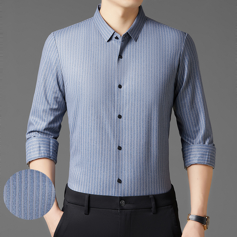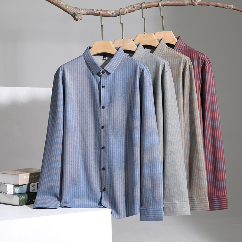 봄과 가을 남성 줄무늬 긴팔 셔츠 중년 비즈니스 캐주얼 양모 비 주름 방지 탄성 비 표시 셔츠