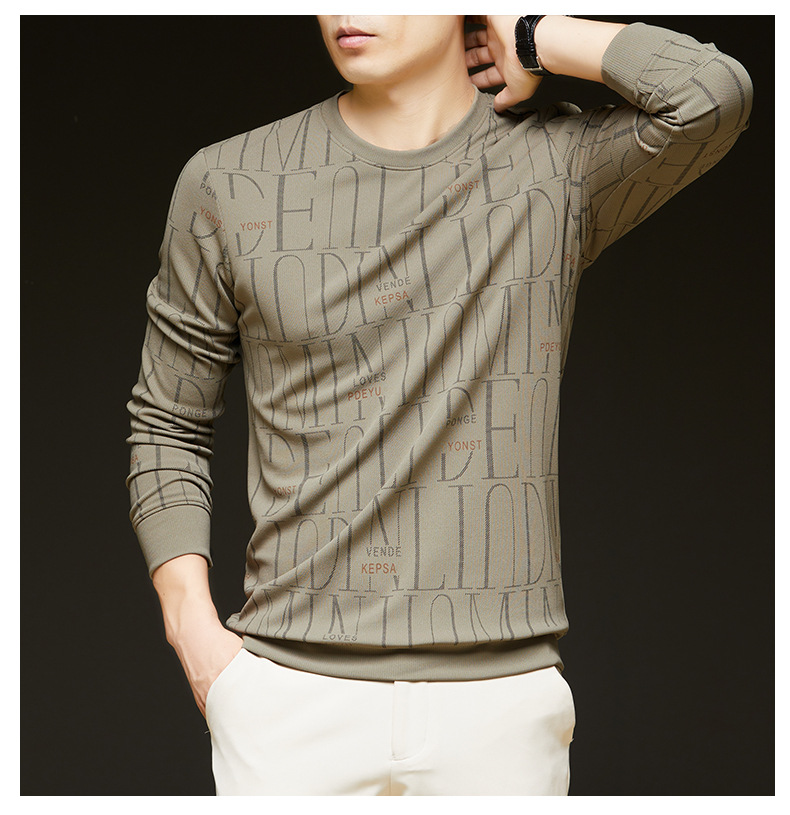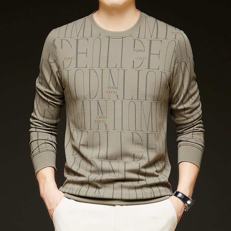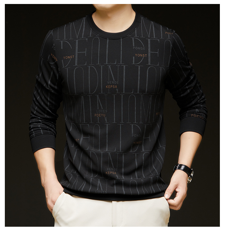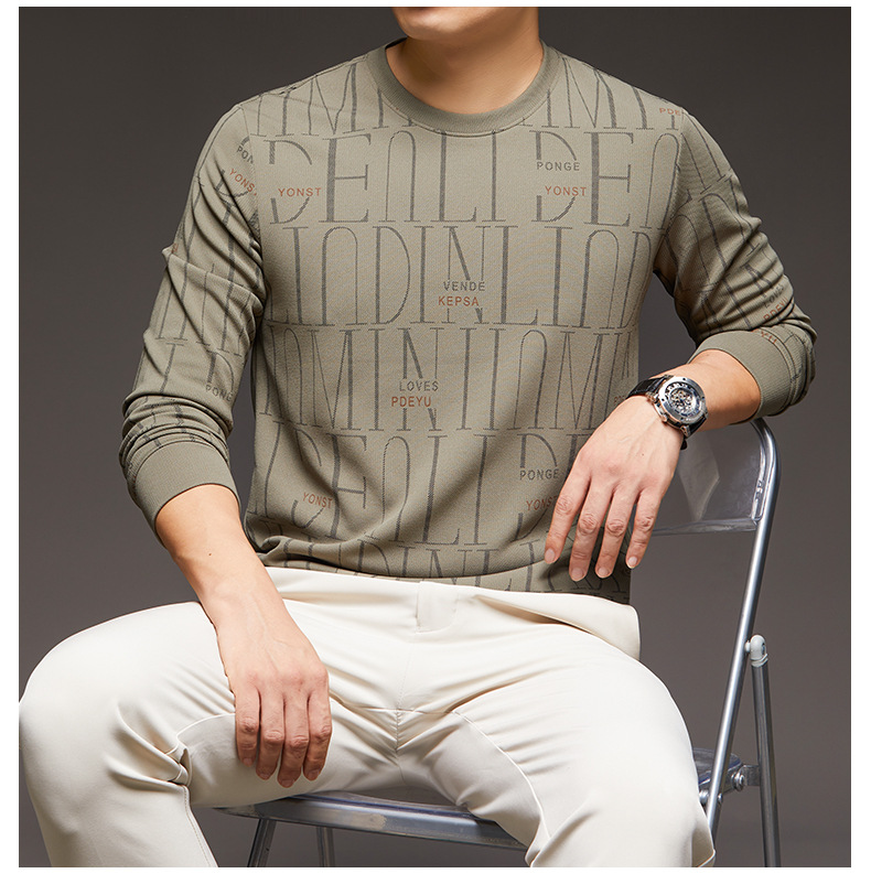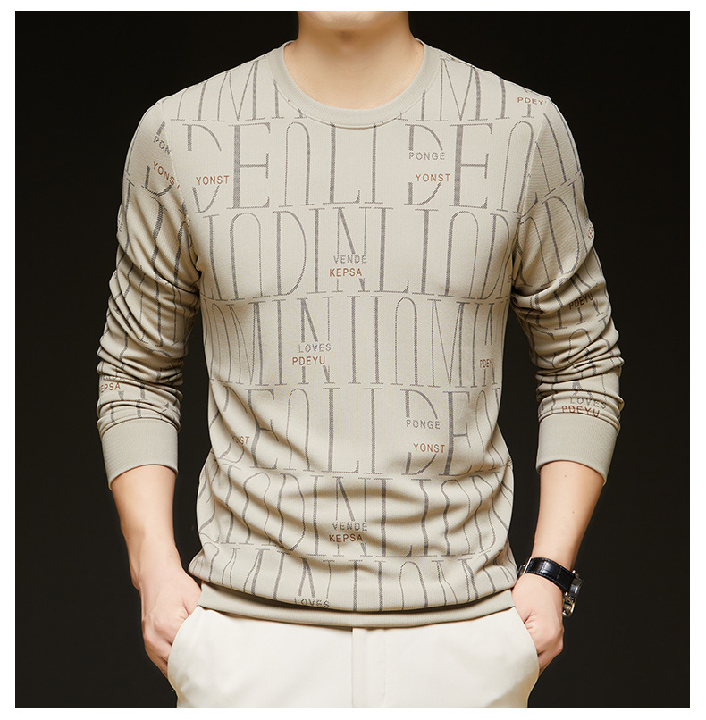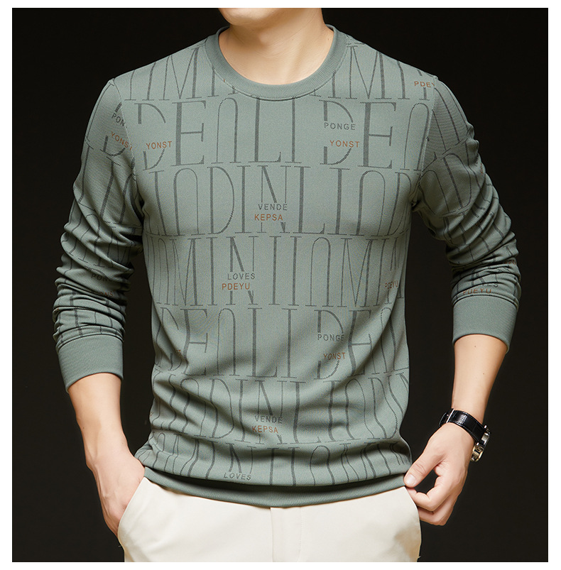 가을 새 남성 긴팔 둥근 목 스웨터 젊고 중년 캐주얼 코튼 프린트 티셔츠 피부 친화적 인 편안한베이스 셔츠