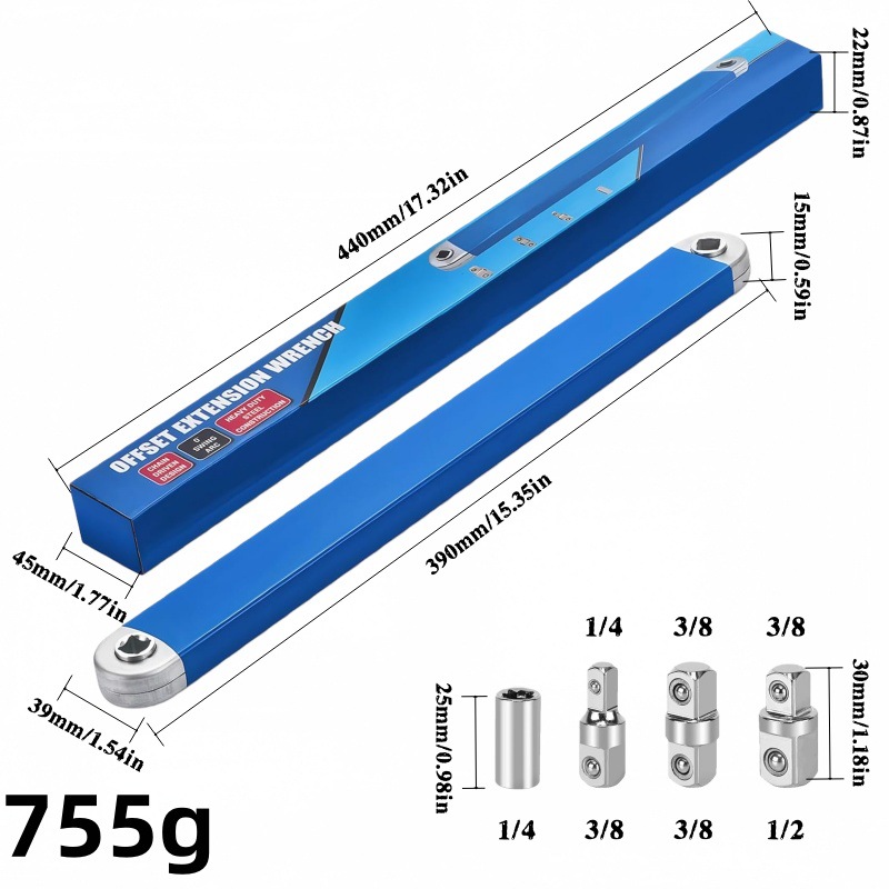 • 긴 연장 렌치 + 액세서리 4개, 컬러 박스 포장 [755g]