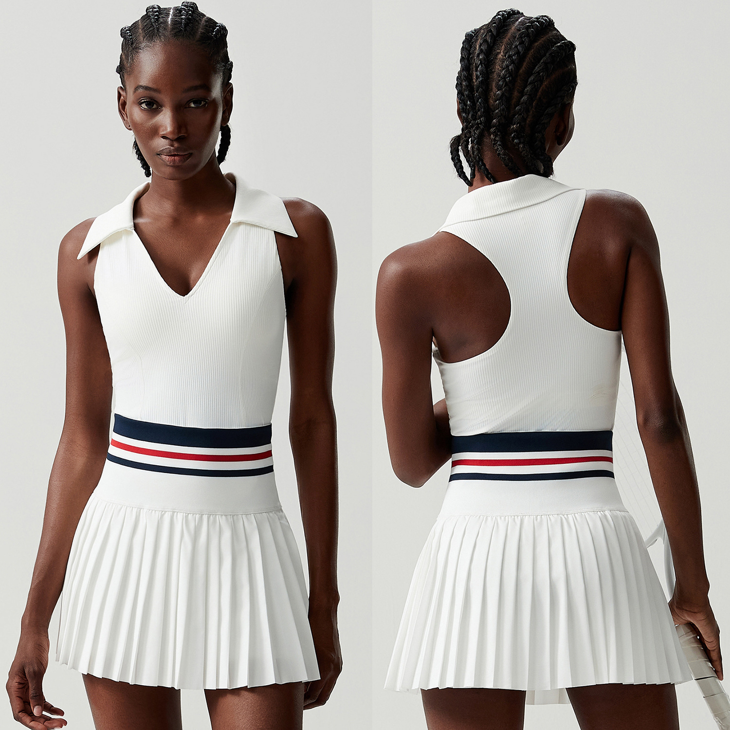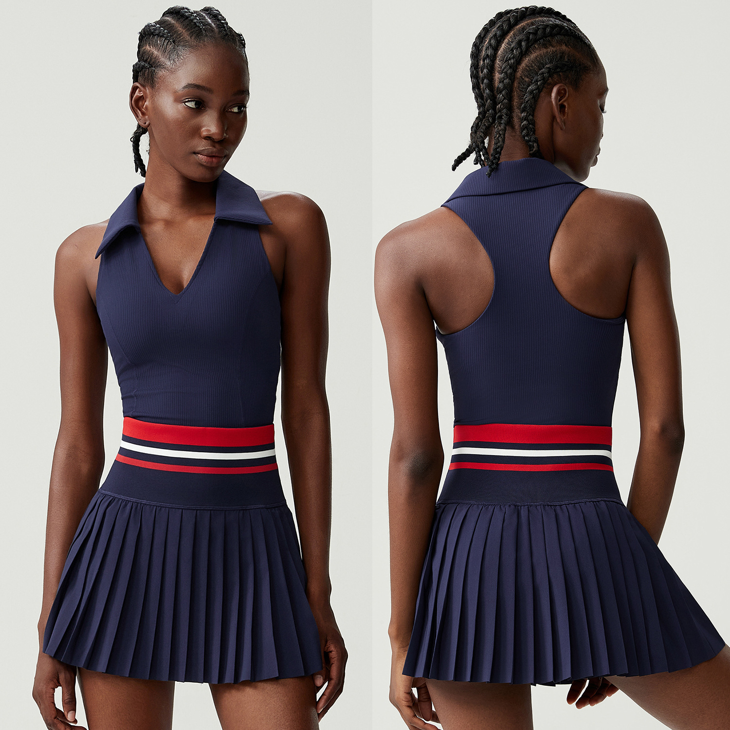 국경 간 플러스 사이즈 스포츠 피트니스 테니스 스커트 세트 여성용 안티 워킹 퀵 건조 가슴 패드 V 넥 요가 의류 투피스 세트