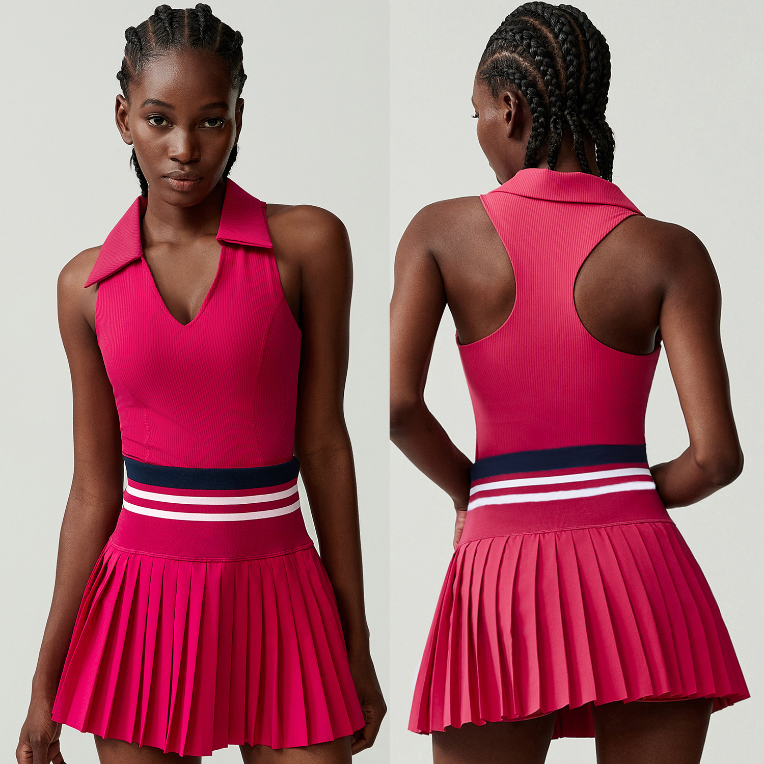 • YB421 스탠드 칼라 조끼 + SP461 테니스 스커트 투피스 세트 로젤 레드