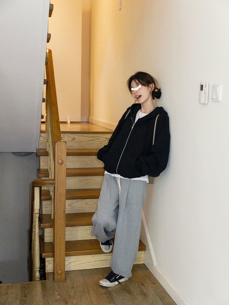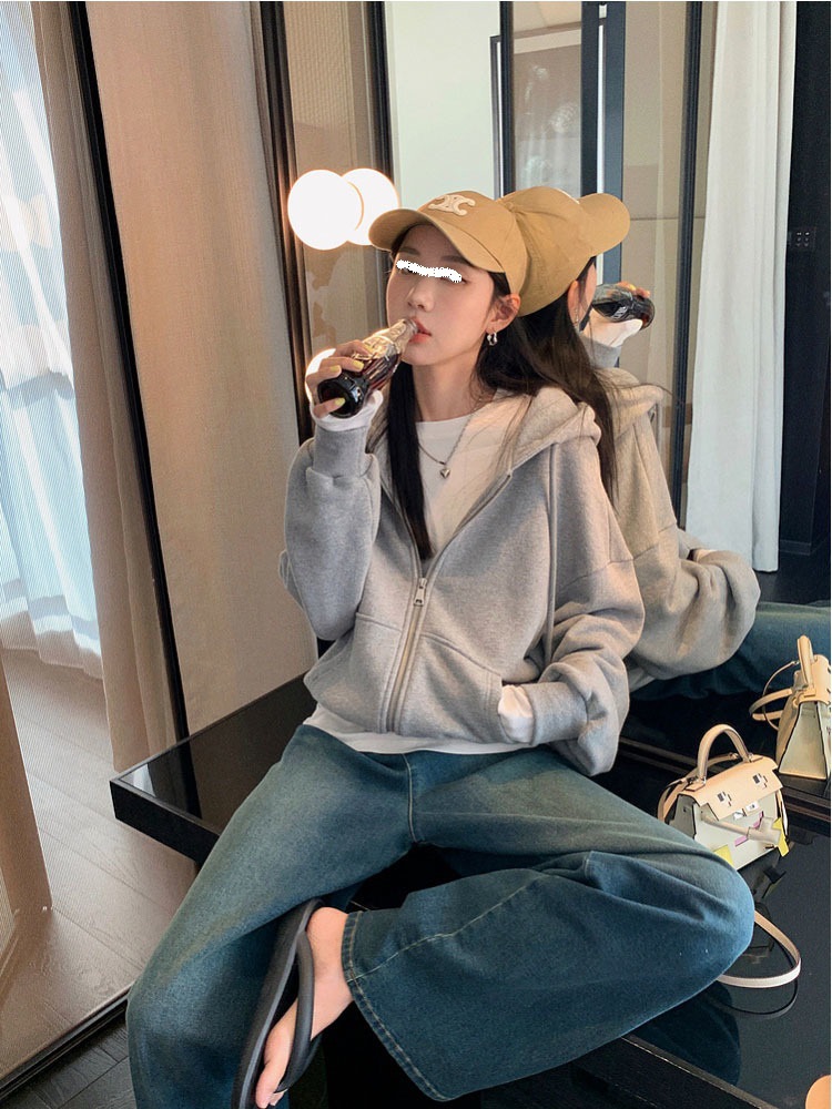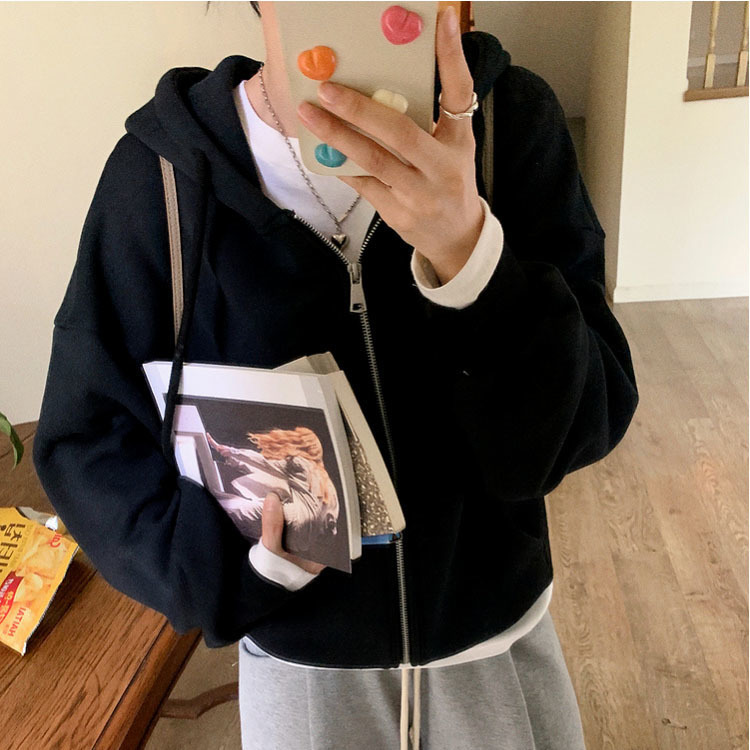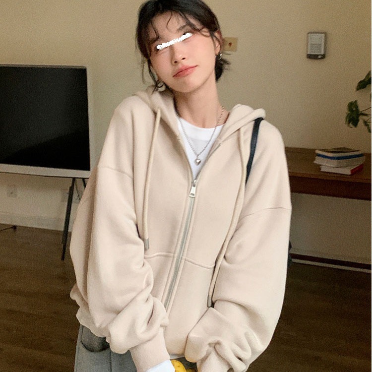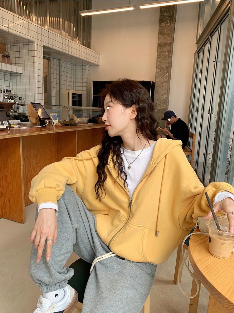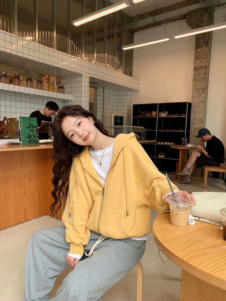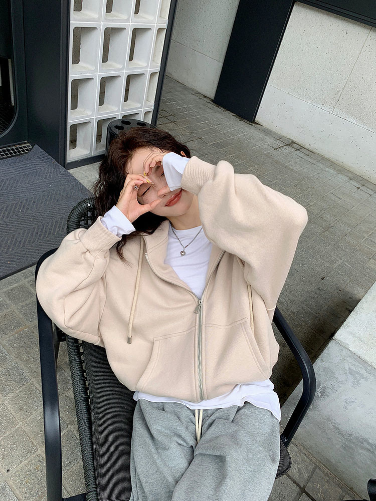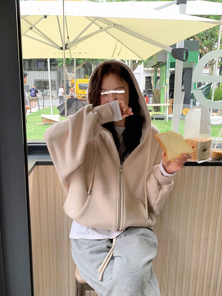 퓨어 코튼 후드 재킷 여성의 느슨한 단색 긴 소매 재킷 여성의 한국 스타일 디자인 센스 캐주얼 후드 스웨트