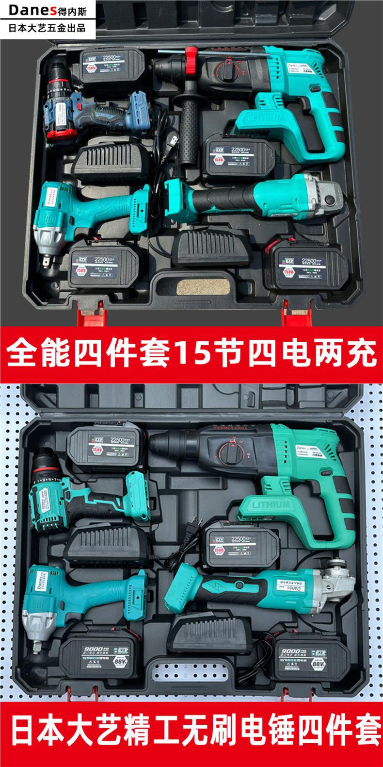 일본 Dayi Brushless 충전식 전기 해머 충격 드릴 앵글 그라인더 전기 렌치 전기 드릴 4 피스 세트 15 섹션 리튬 배터리 세트