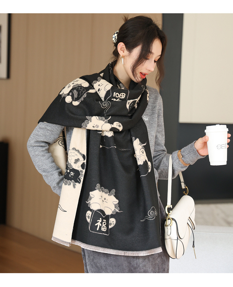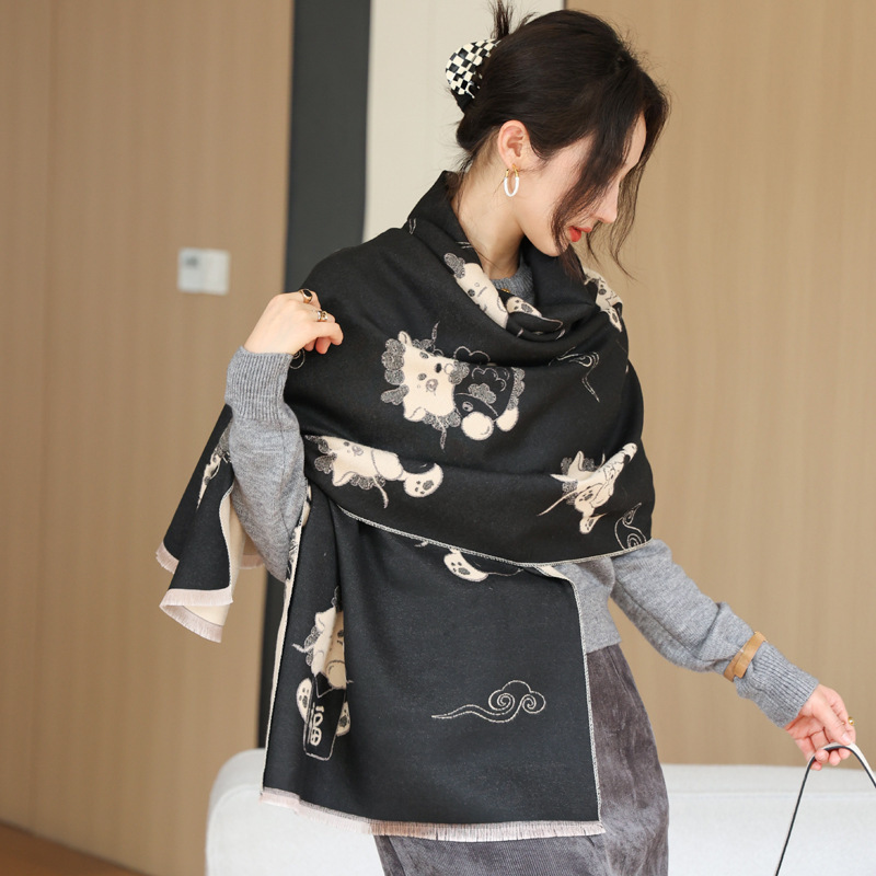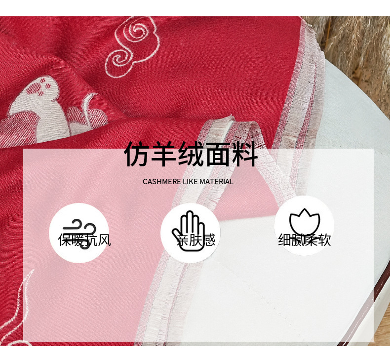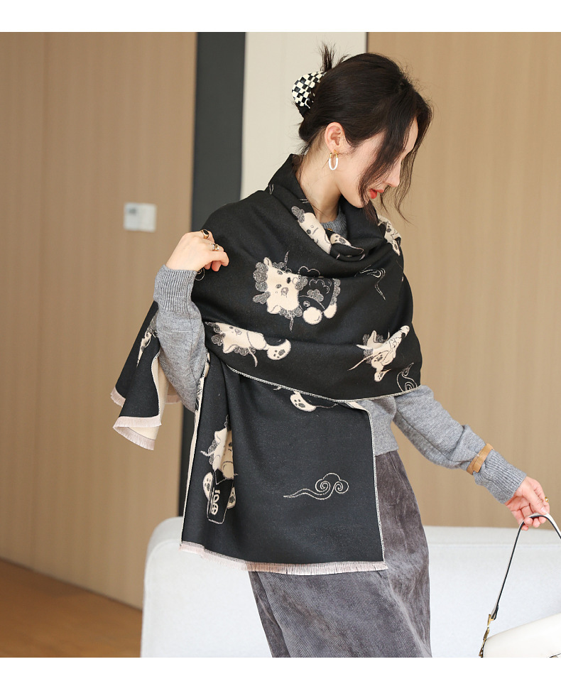 可爱猫咪重磅双面围巾女秋冬季百搭加厚保暖仿羊绒高级感披肩围脖