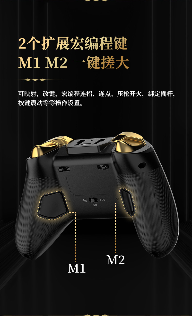 3.带宏编程背键、六轴体感陀螺仪、HD双震动马达可调节,TURBO一键连发。