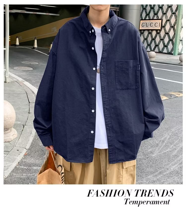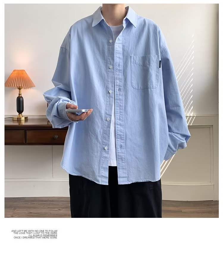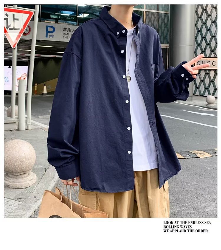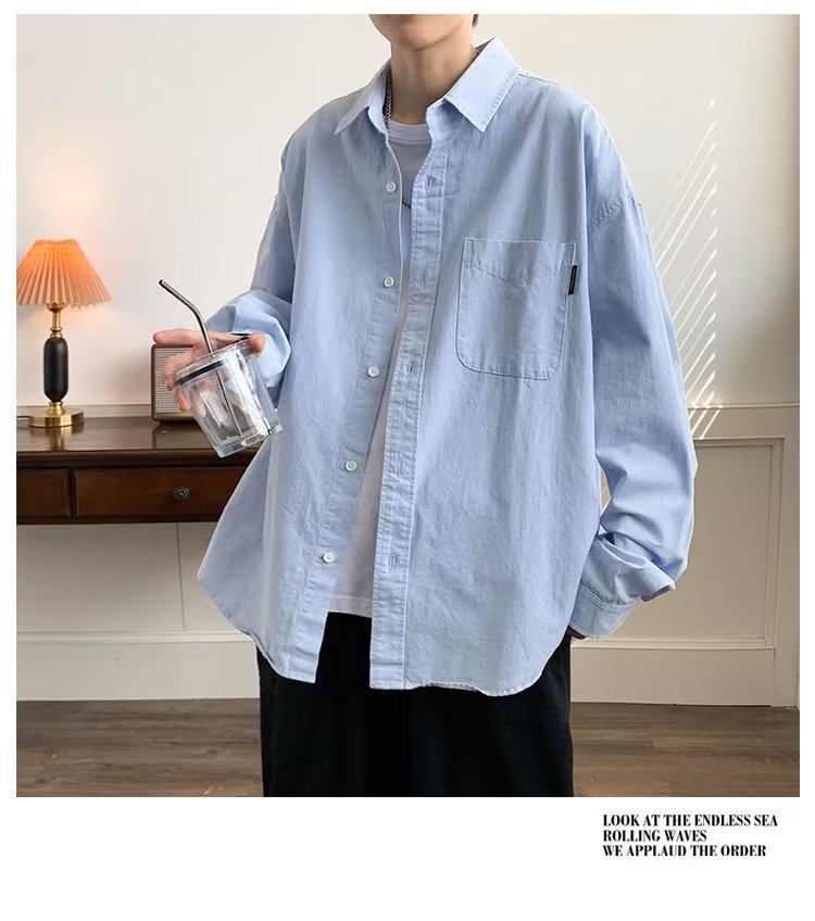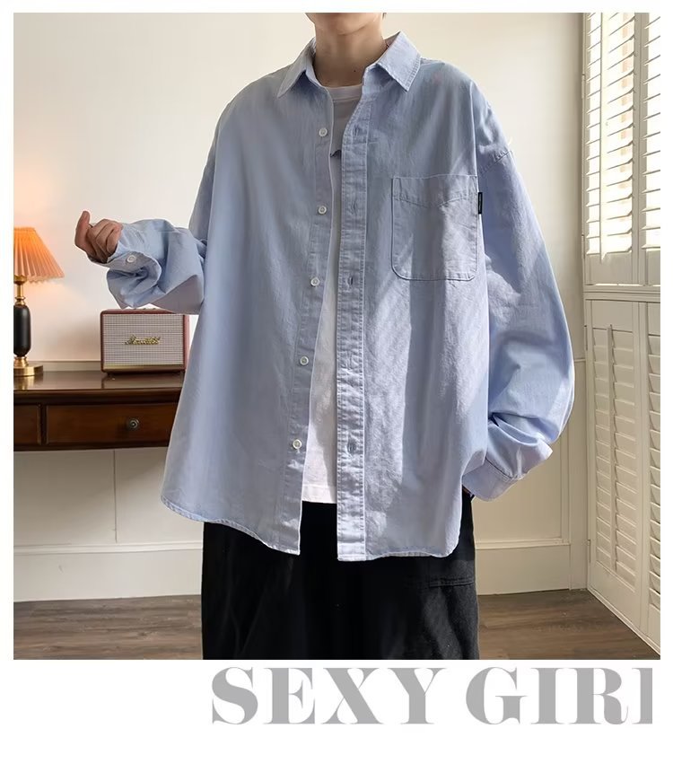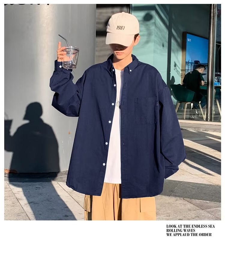 파란 긴 소매 셔츠 남자의 일본 유행 예술적 봄 유행 모든 경기 느슨한 간단한 캐주얼 셔츠 재킷스토어 가기
