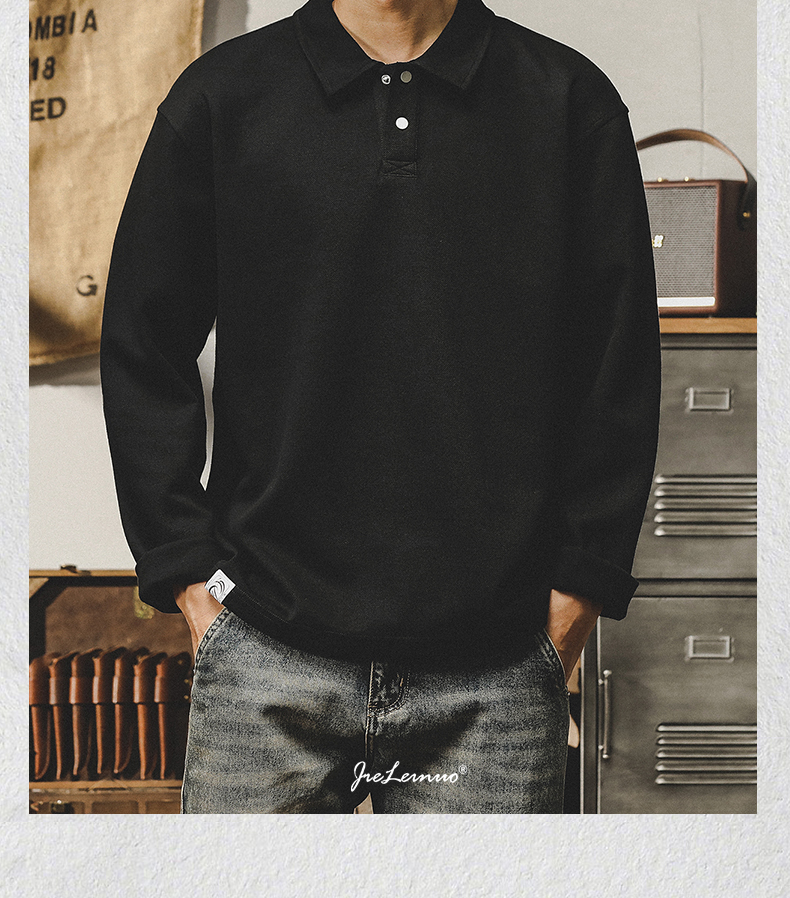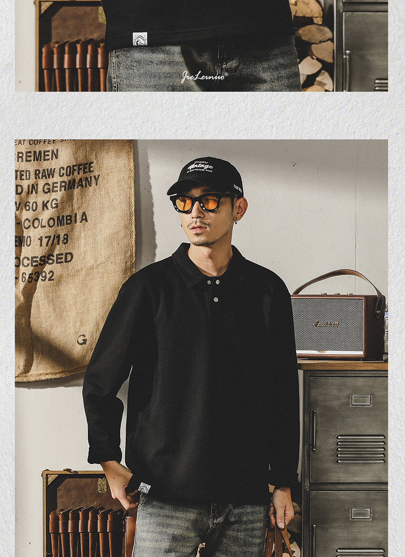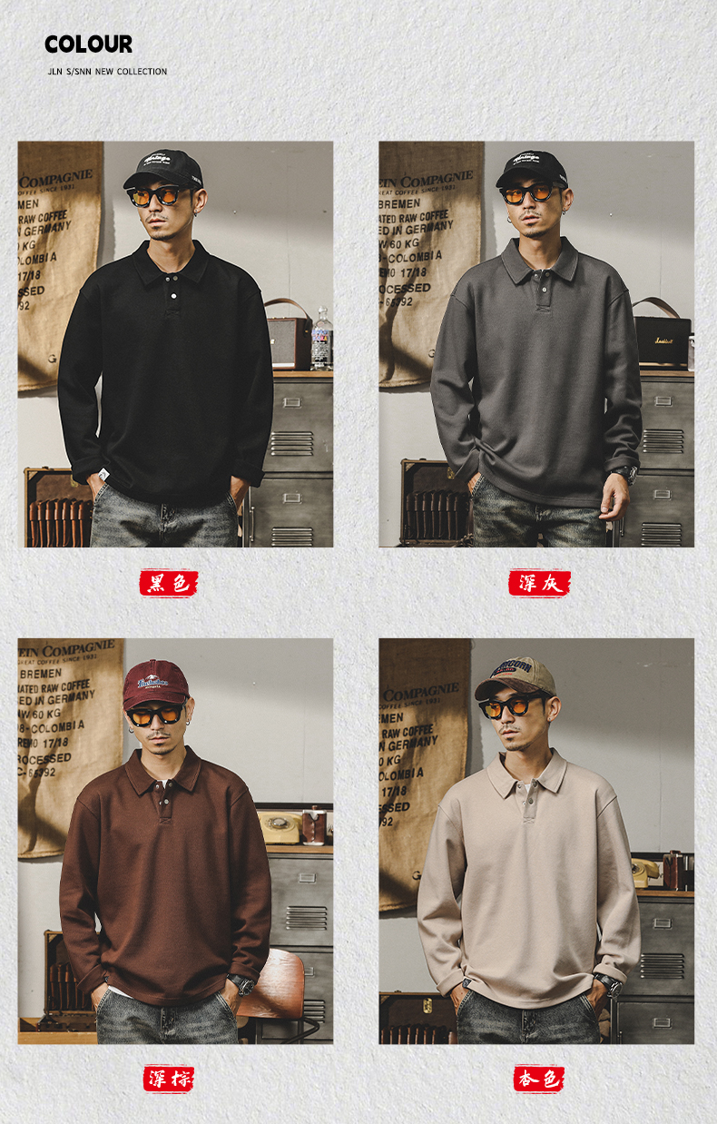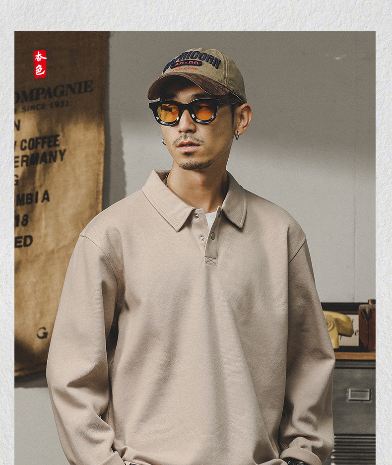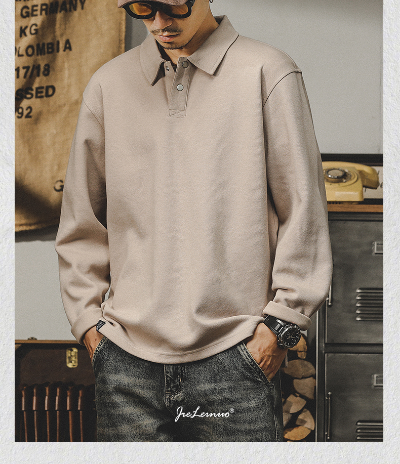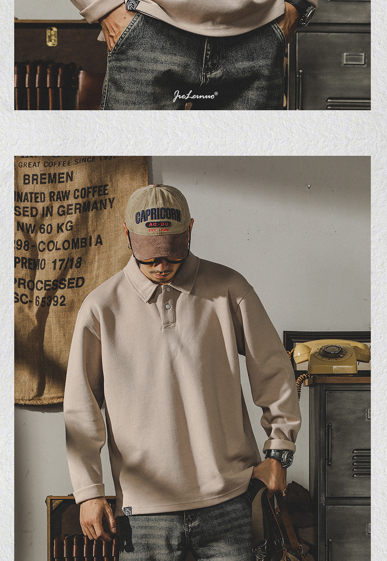 250g 무거운 진주면 POLO 셔츠 남성 긴 소매 봄과 가을 미국 복고풍 오래된 돈 바람 간단한 느슨한 티셔츠