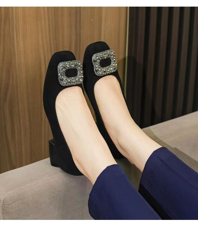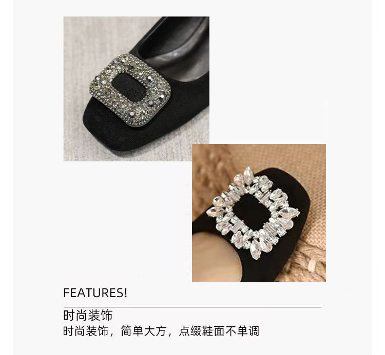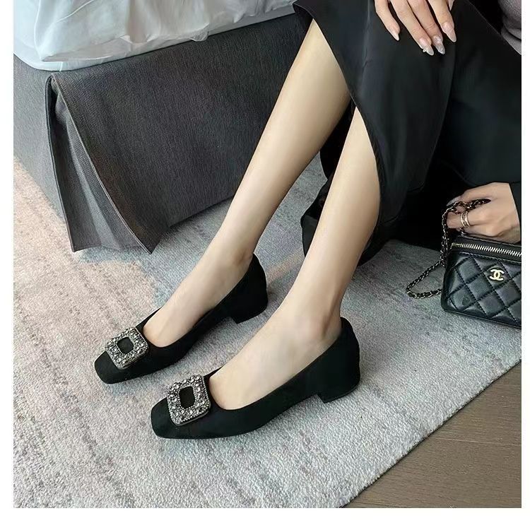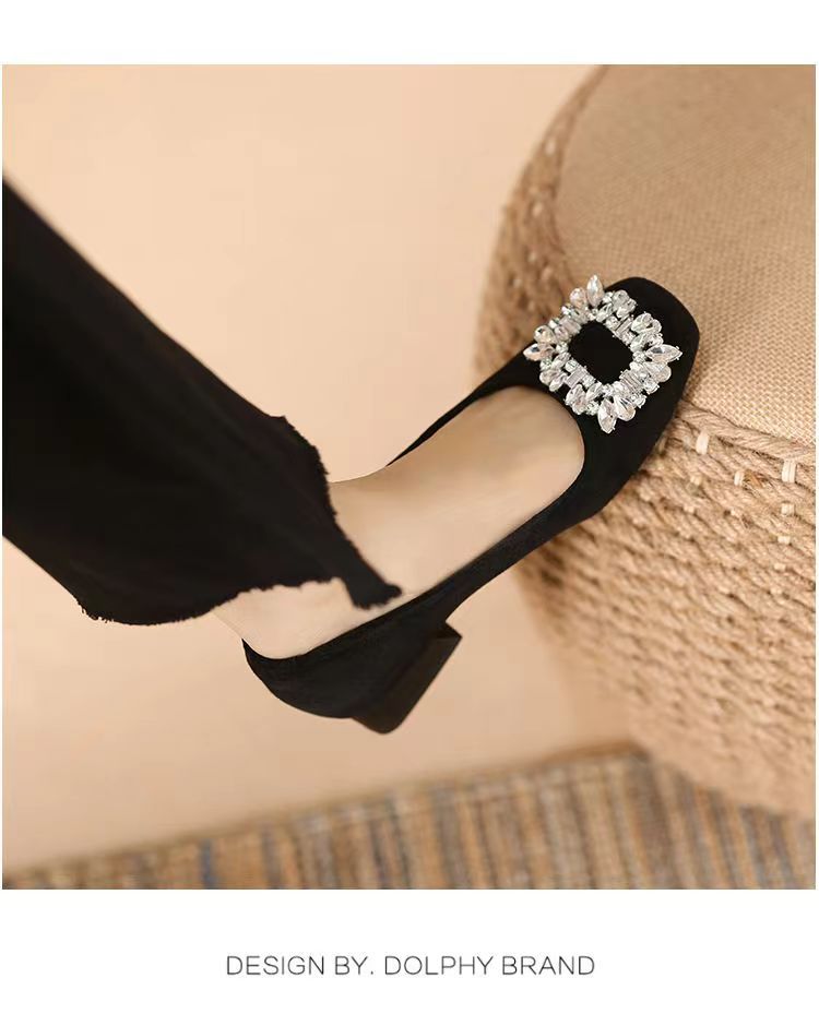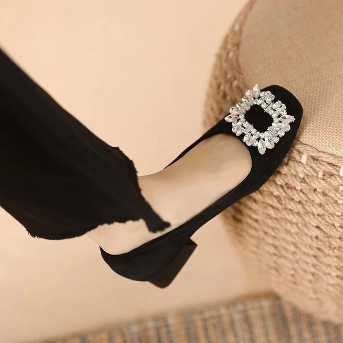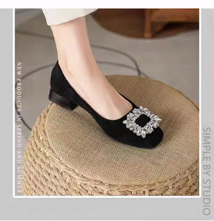 프렌치 스타일의 라인스톤 굽이 두꺼운 고급 여성용 신발 2025년 신상 여름 스퀘어토 얕은 입구 우아한 하이힐 출퇴근용 신발스토어 가기