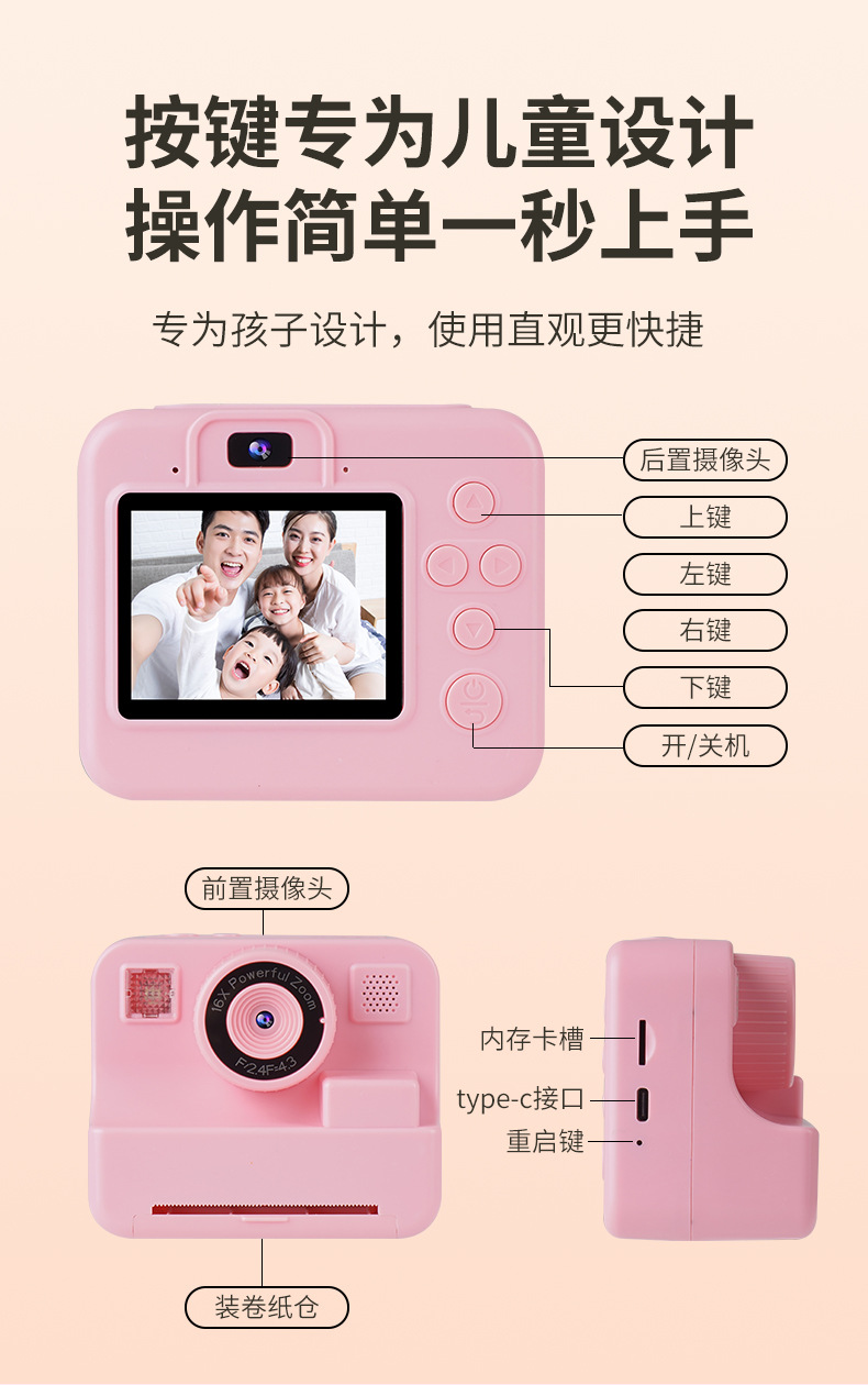 本产品儿童手机H11,主要特点是可以立拍立打印相片功能,大屏幕2.4寸,可以拍照,录像,大头贴变化,玩小游戏等功能,支持32G内存卡,配件有说明书,充电线,挂绳,天地盒子。