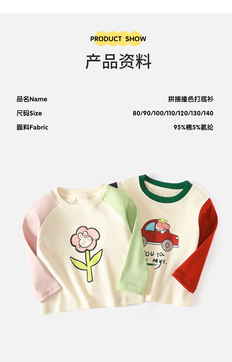 가을 소년 소녀 스티칭 대비 컬러 긴 소매 티셔츠 한국 만화 둥근 목면 상단 따뜻한 아동베이스 셔츠