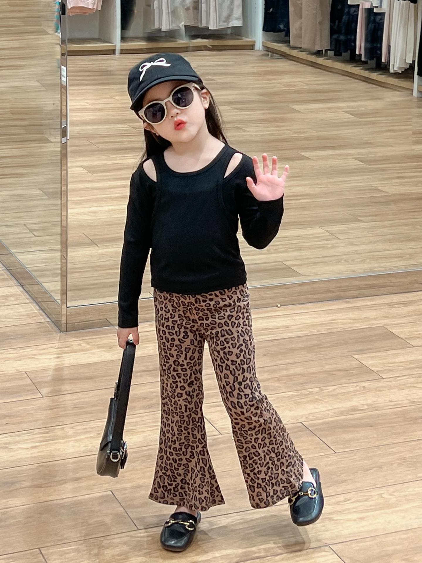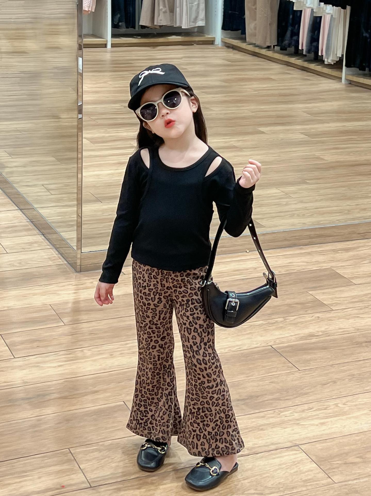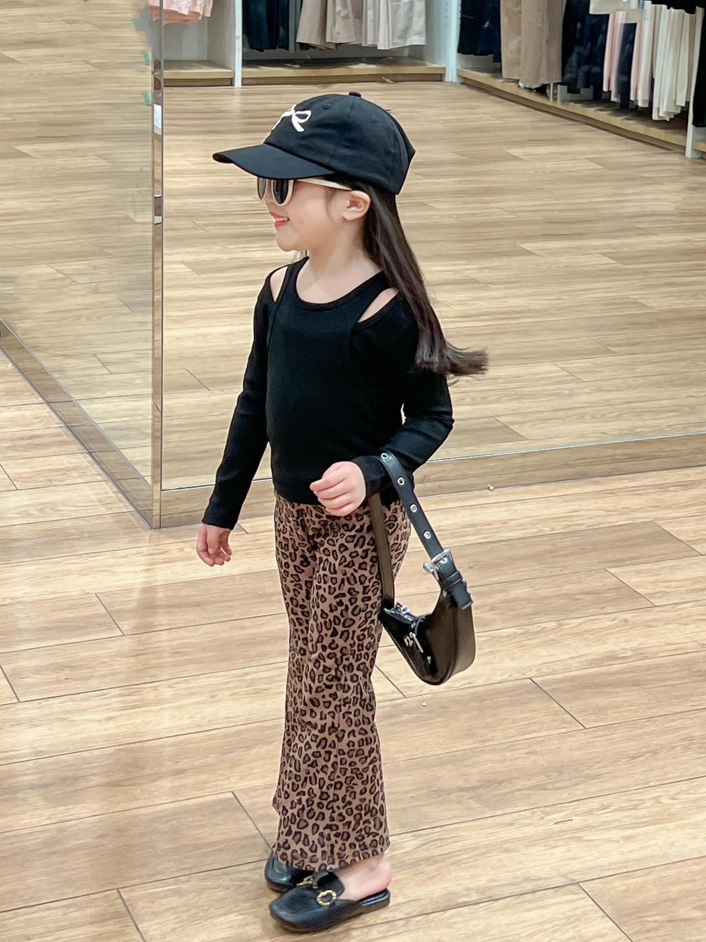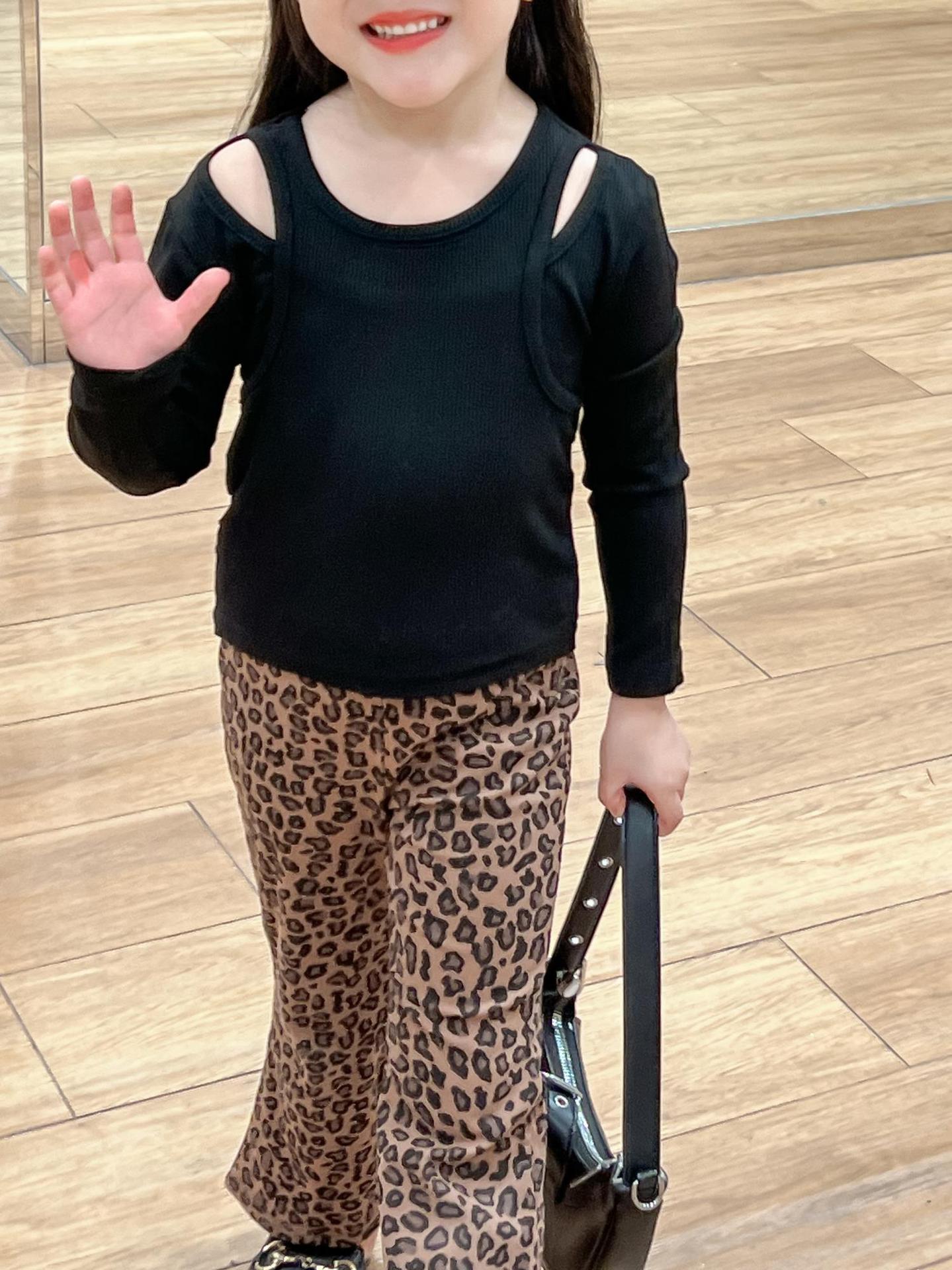 2024 가을 소녀 유럽과 미국의 세련된 블랙 오프 숄더 가짜 투피스 티셔츠 탑 레오파드 플레어 팬츠 분할스토어 가기