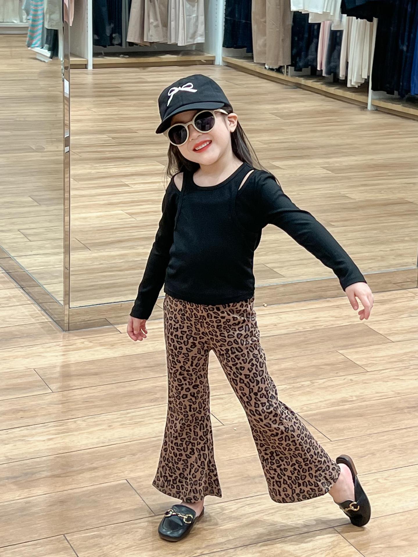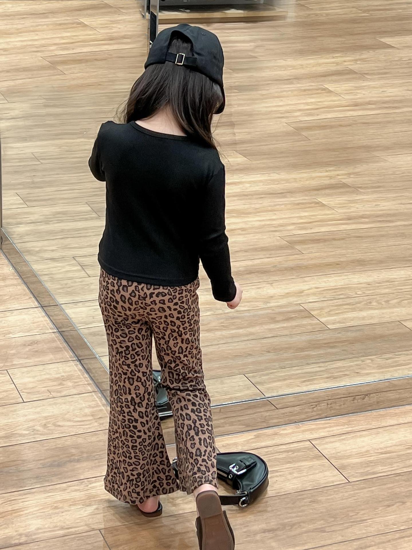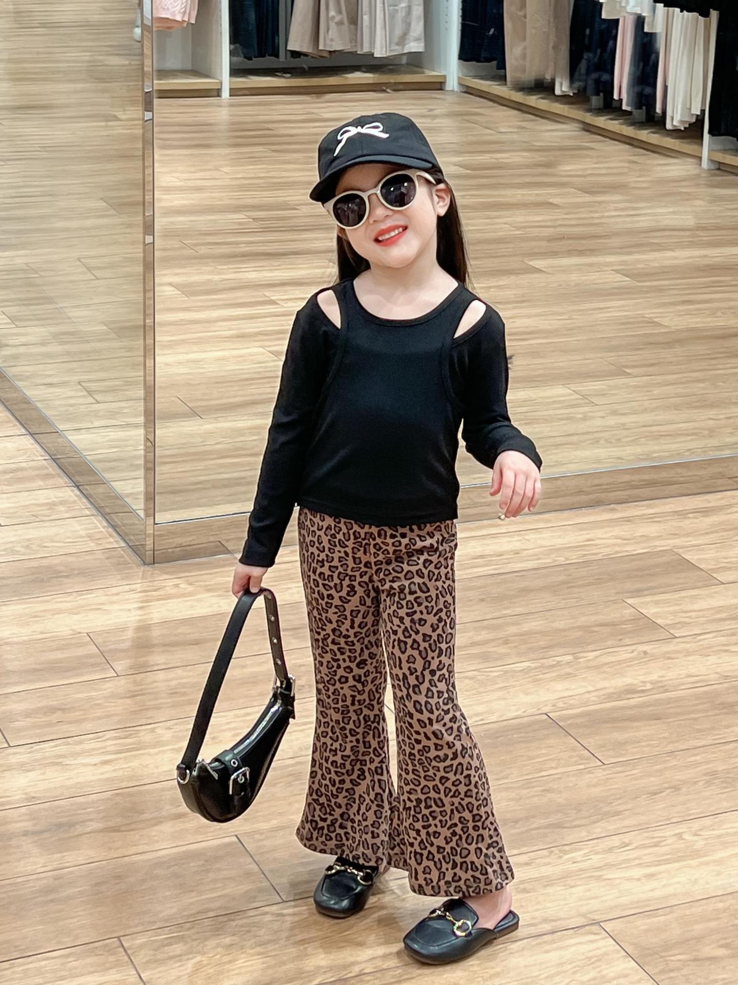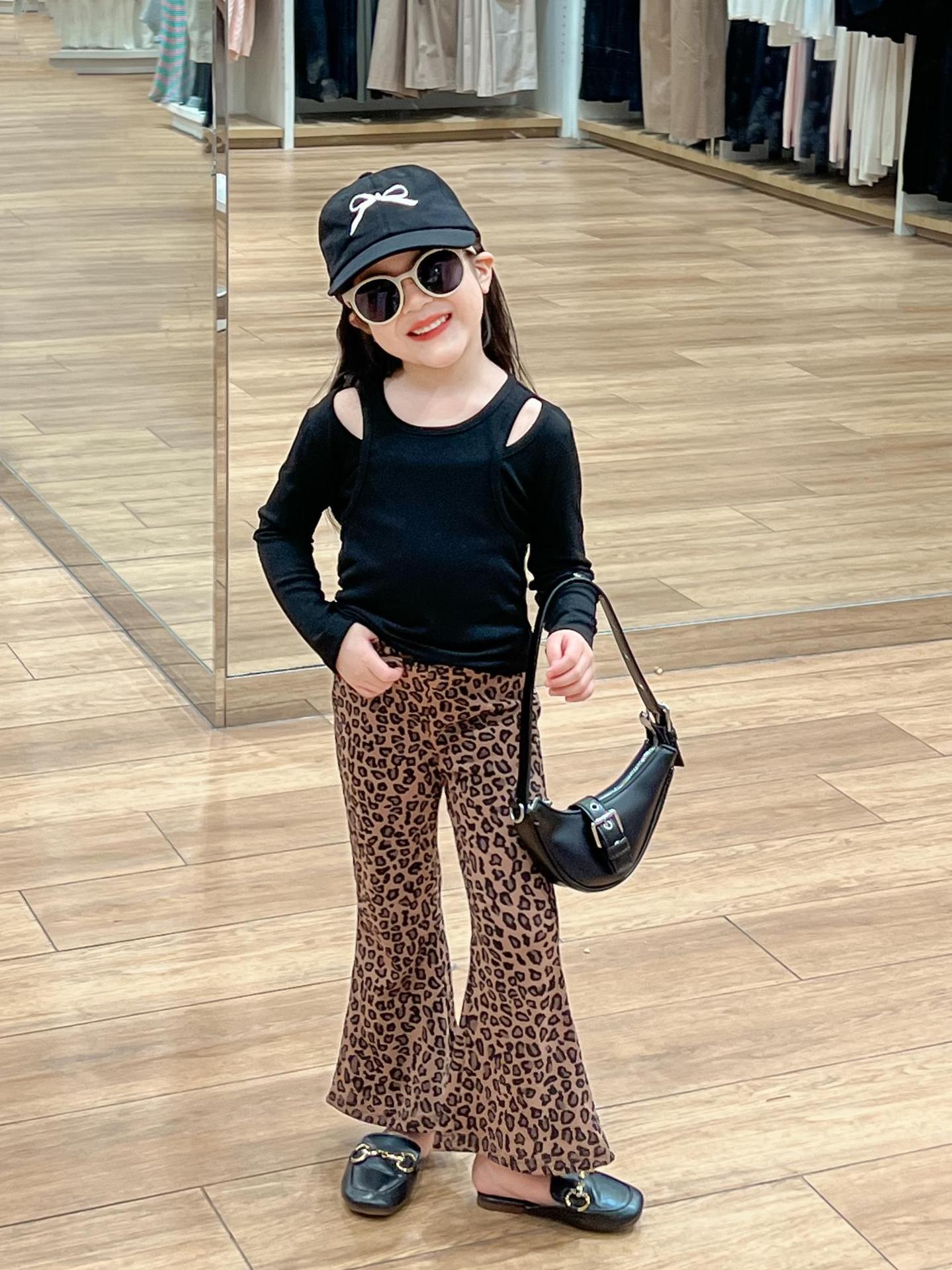 2024 가을 소녀 유럽과 미국의 세련된 블랙 오프 숄더 가짜 투피스 티셔츠 탑 레오파드 플레어 팬츠 분할스토어 가기