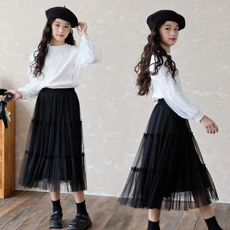 여자 치마 세트 2024 가을 새 어린이 봄과 가을 레이스 긴 소매 티셔츠 반쪽 길이 베일 스커트 투피스 세트