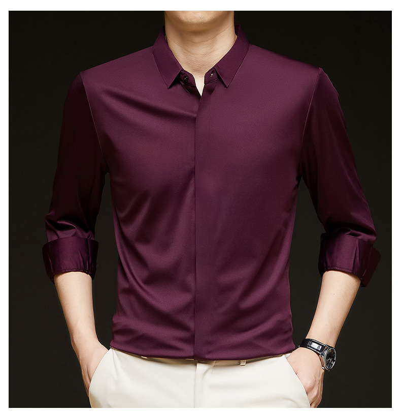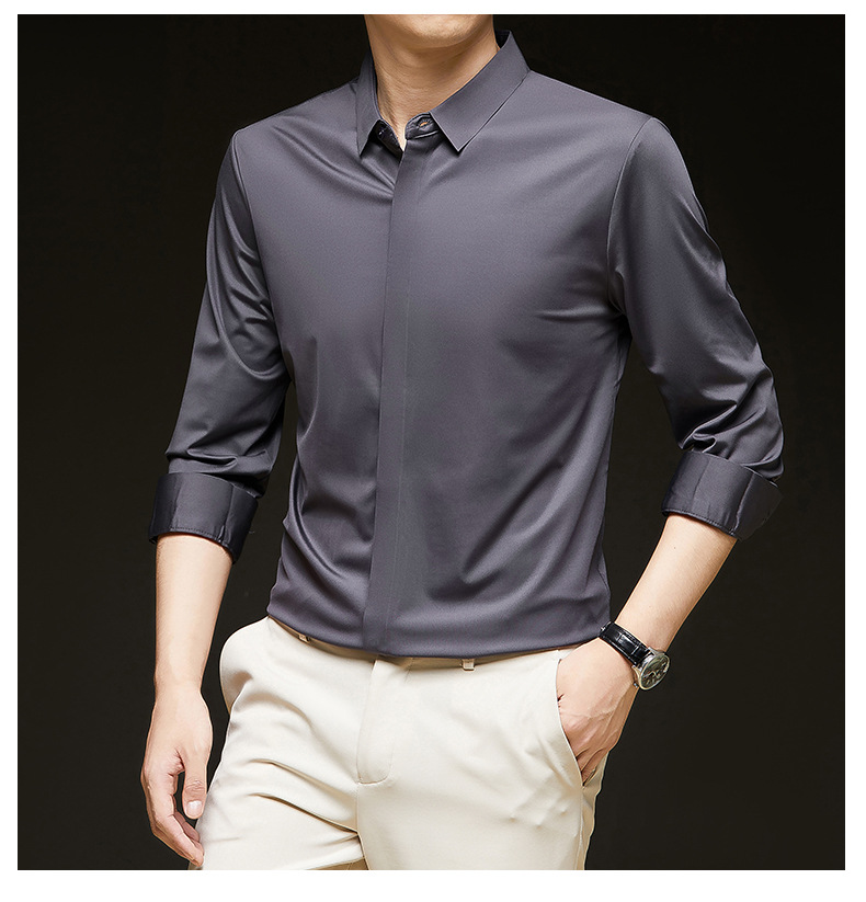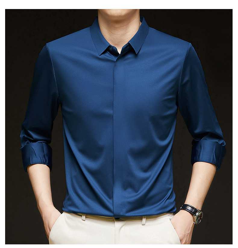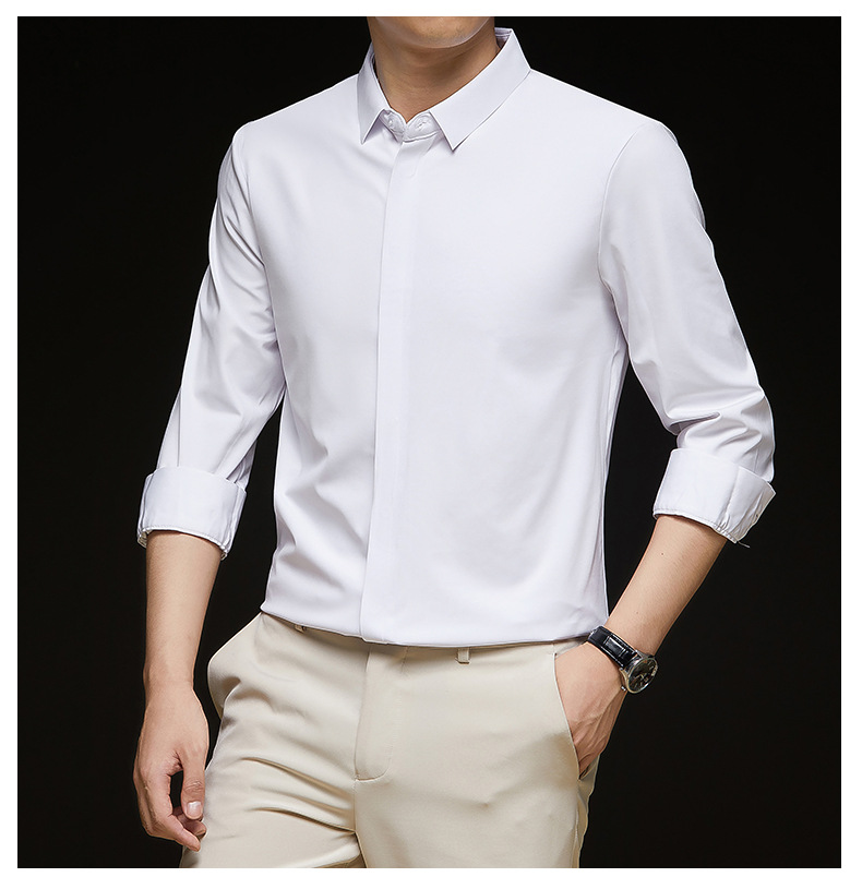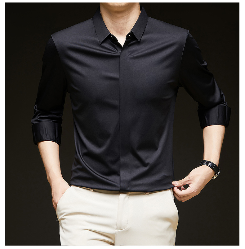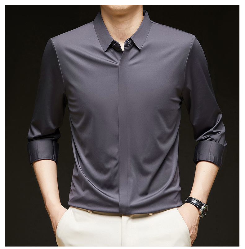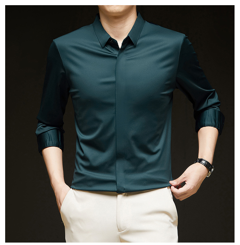남성 봄과 가을 추적없는 스트레치 긴팔 셔츠 젊고 중년의 다크 플래켓 비즈니스 캐주얼 연회베이스 간단한 셔츠