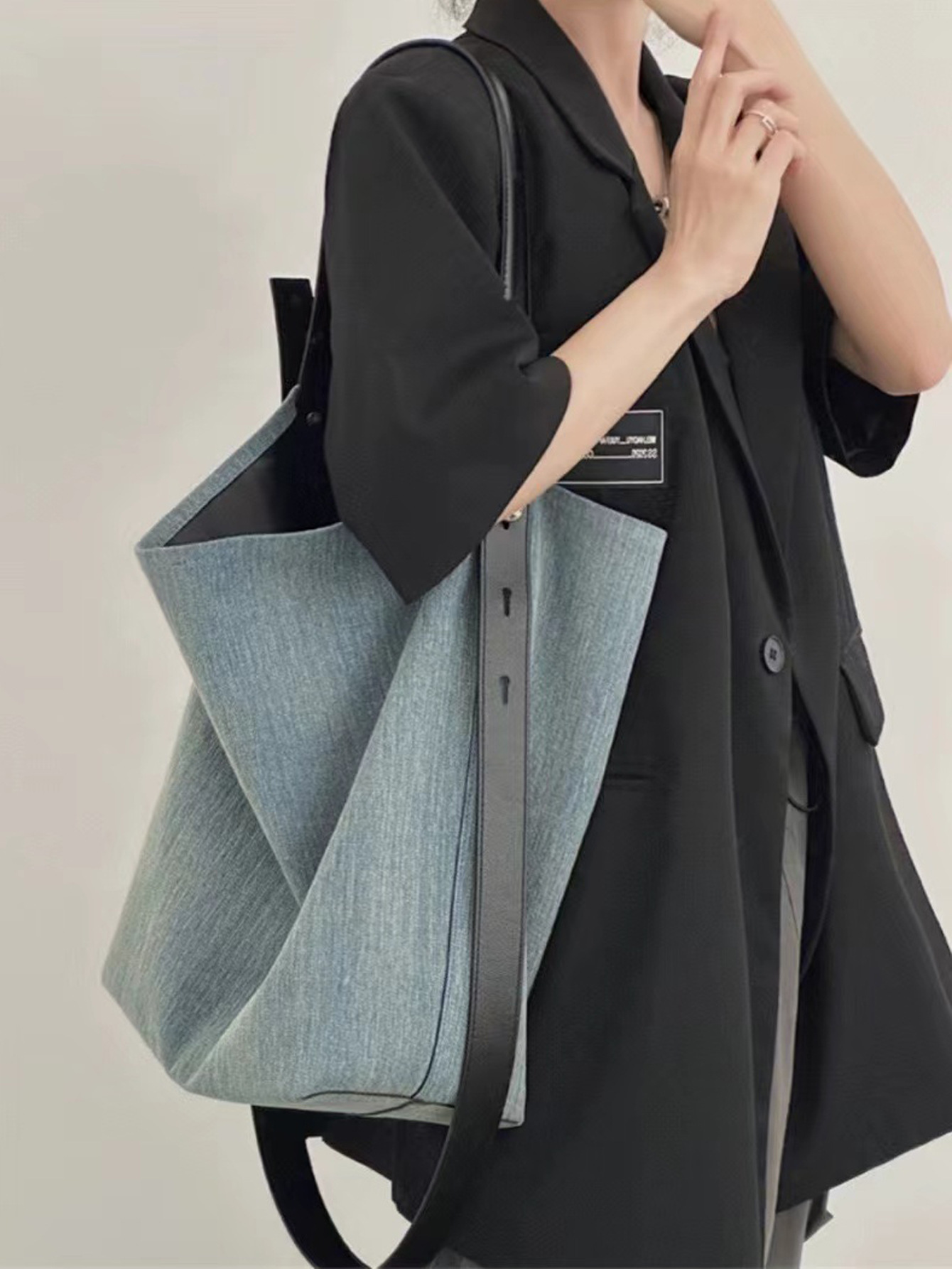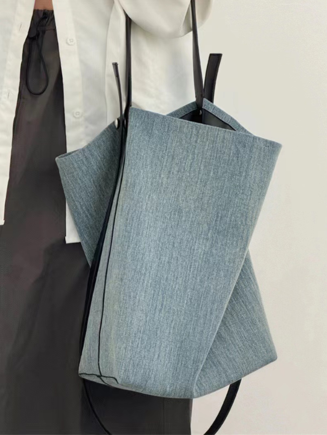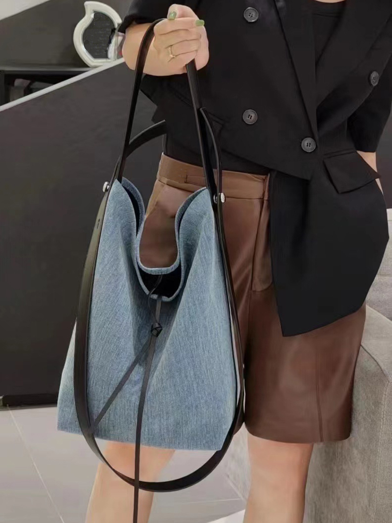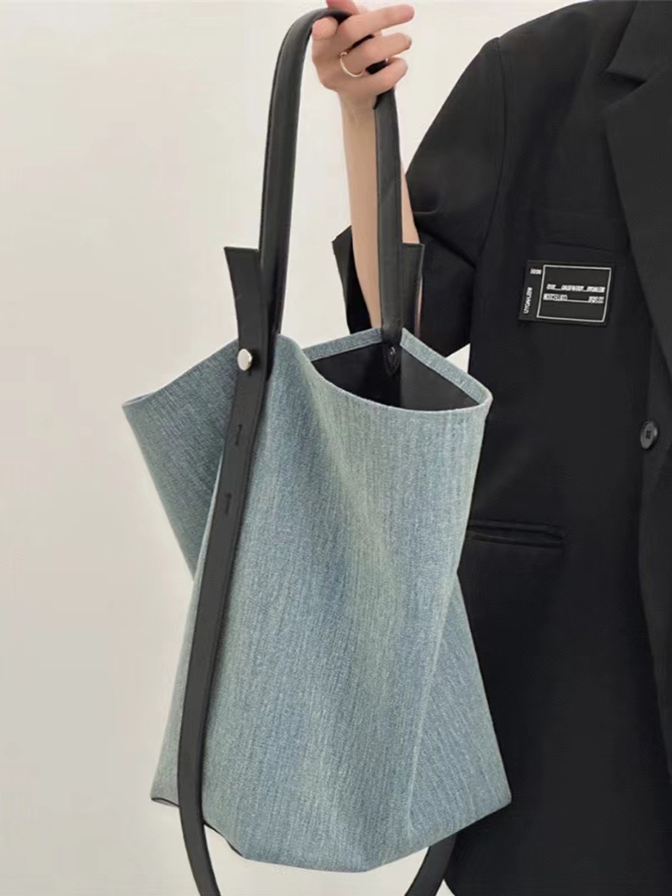 2026 봄 여름 신상 토트백 데님 패턴 PU 가죽 여성용 가방 버킷백 해외 무역 인기상품 넓은 어깨끈 배색스토어 가기
