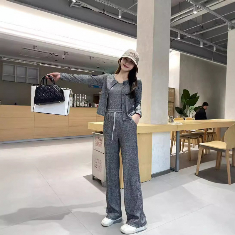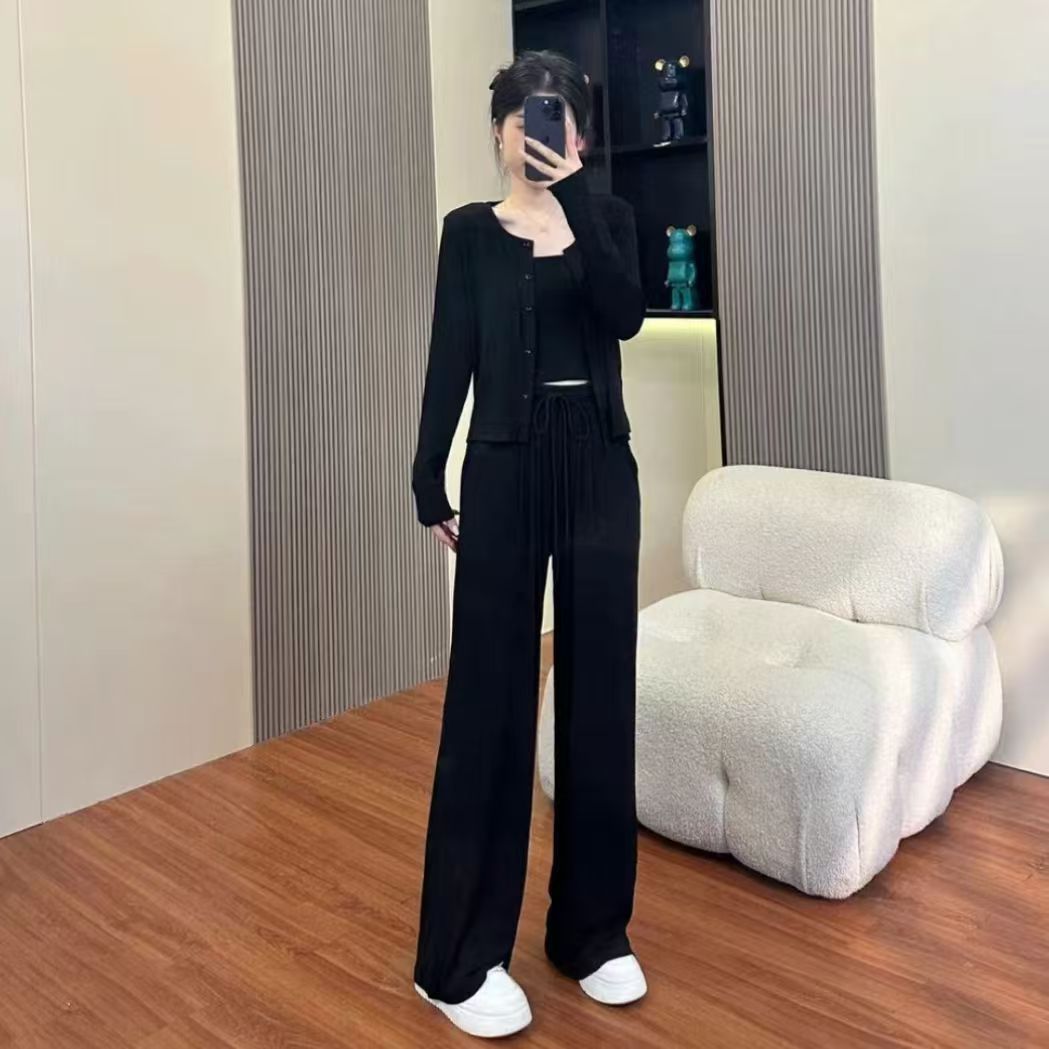 게으른 휴식 스포츠 캐주얼 세트 여자 가을 2024 새로운 느슨한 카디건 슬링 넓은 다리 바지 3 피스 세트