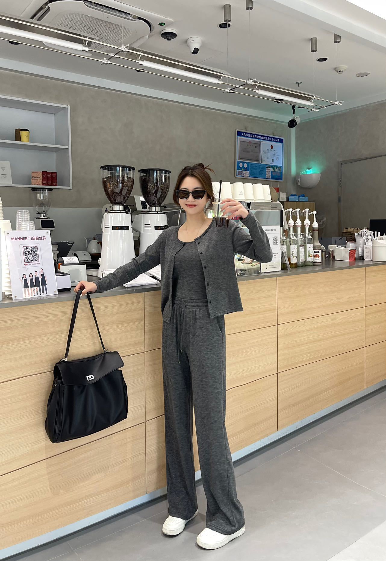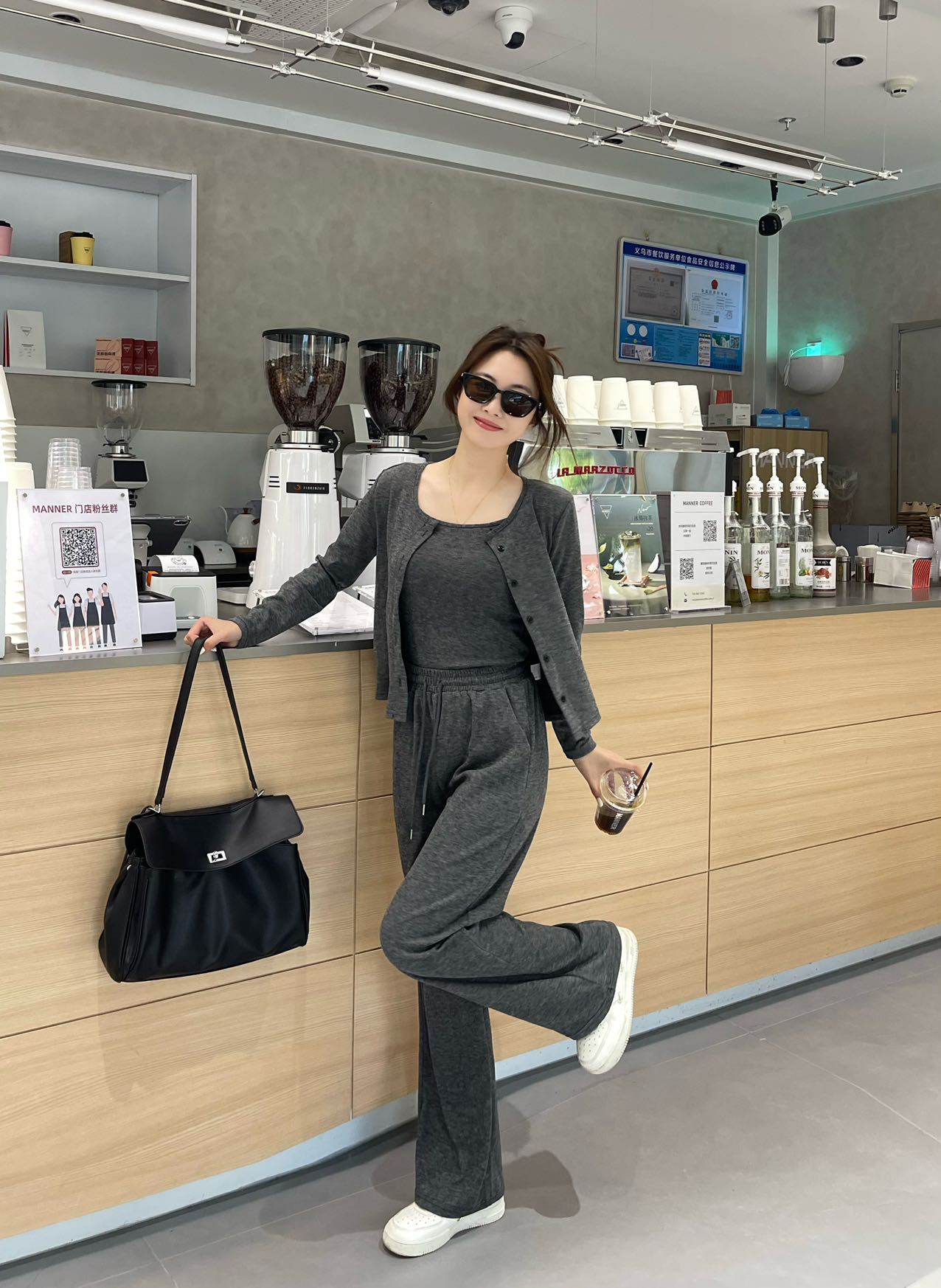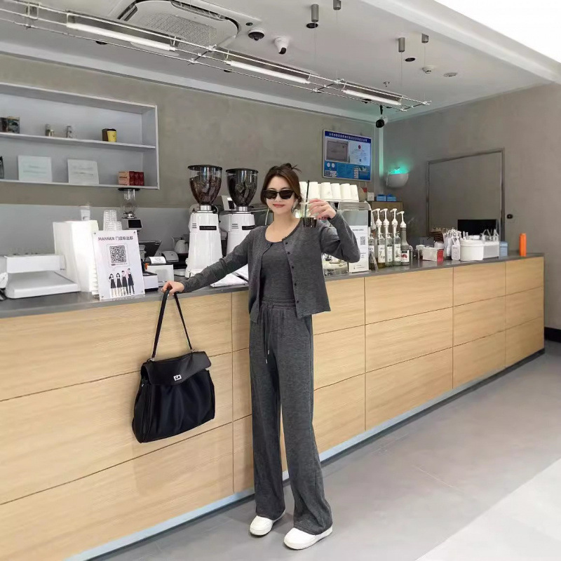 게으른 휴식 스포츠 캐주얼 세트 여자 가을 2024 새로운 느슨한 카디건 슬링 넓은 다리 바지 3 피스 세트스토어 가기