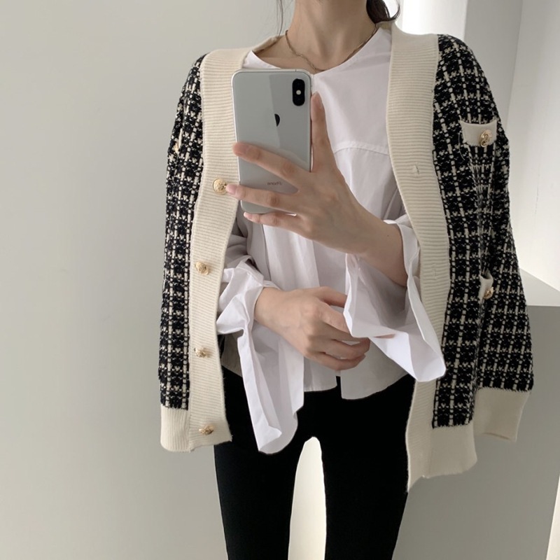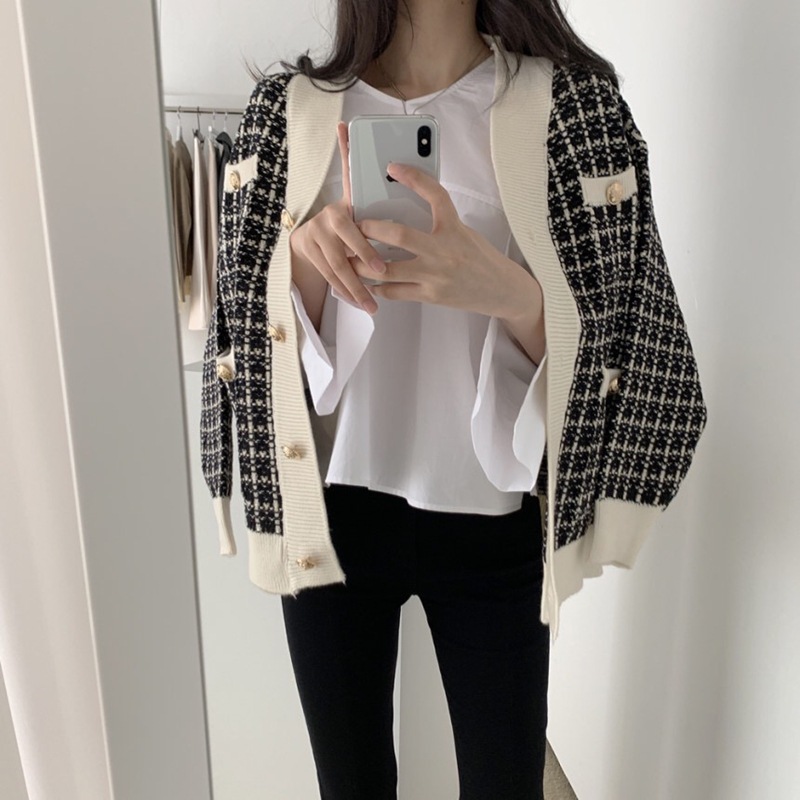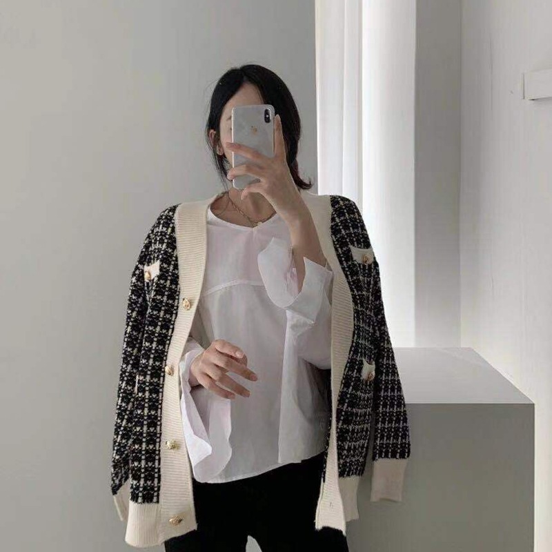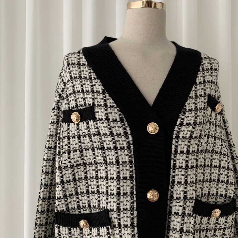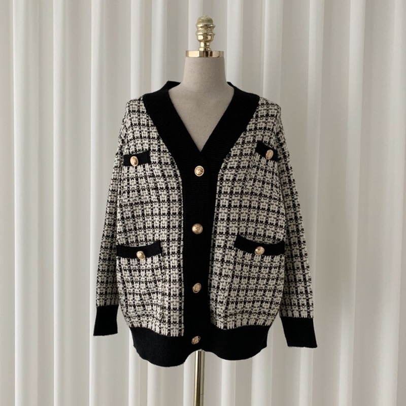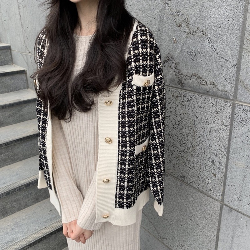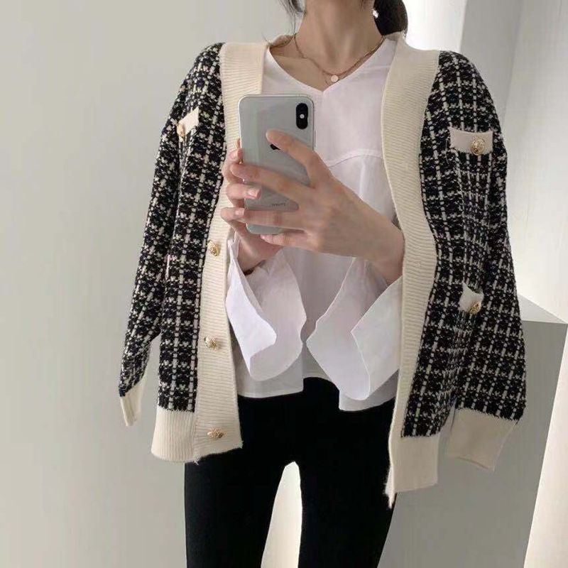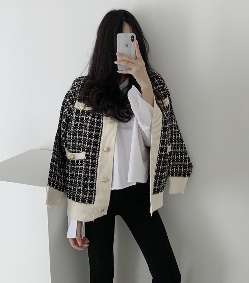플러스 사이즈 여성 의류 2024 가을 새 뚱뚱한 자매 간단한 스타일 싱글 브레스트 격자 무늬 스웨터 카디건 재킷 코트스토어 가기