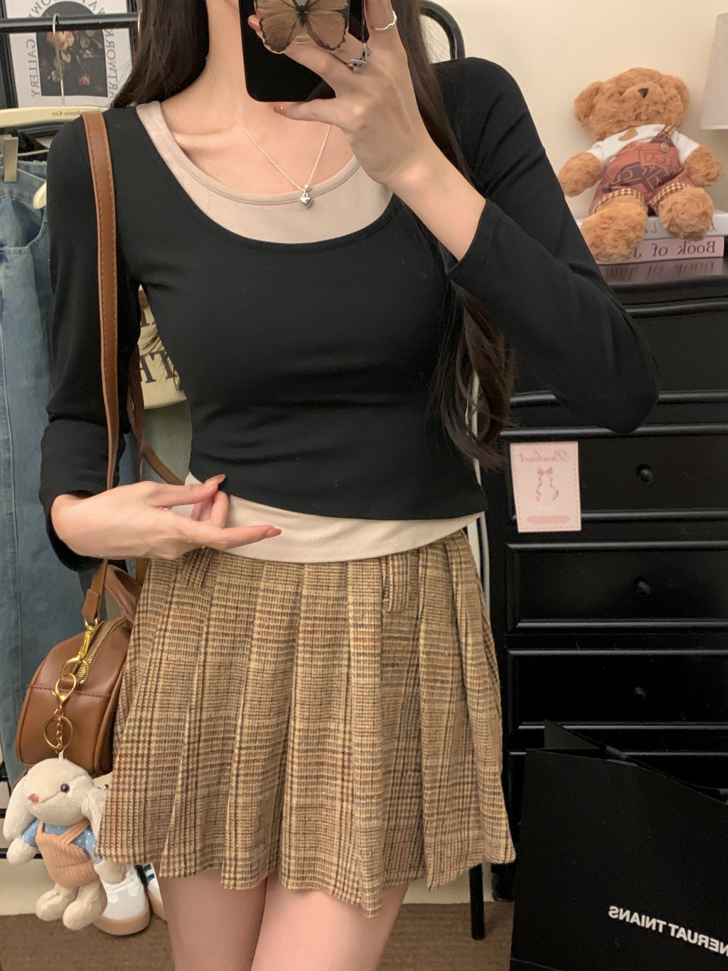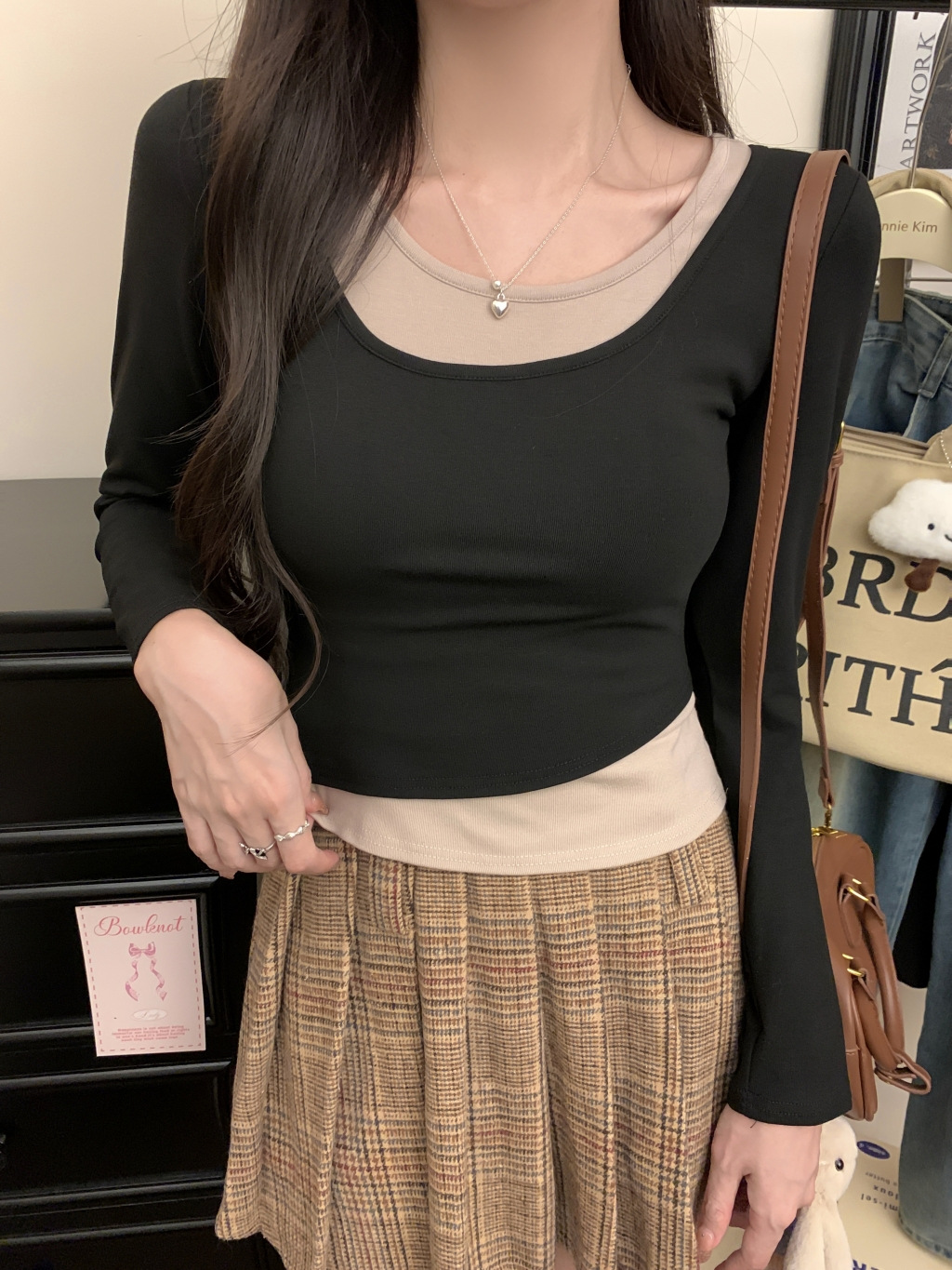 가짜 투피스 슬림 핏 티셔츠 여성용 가을과 겨울 새면 슬림 룩 통기성 베이스 셔츠 긴팔 스타일 탑 트렌디스토어 가기