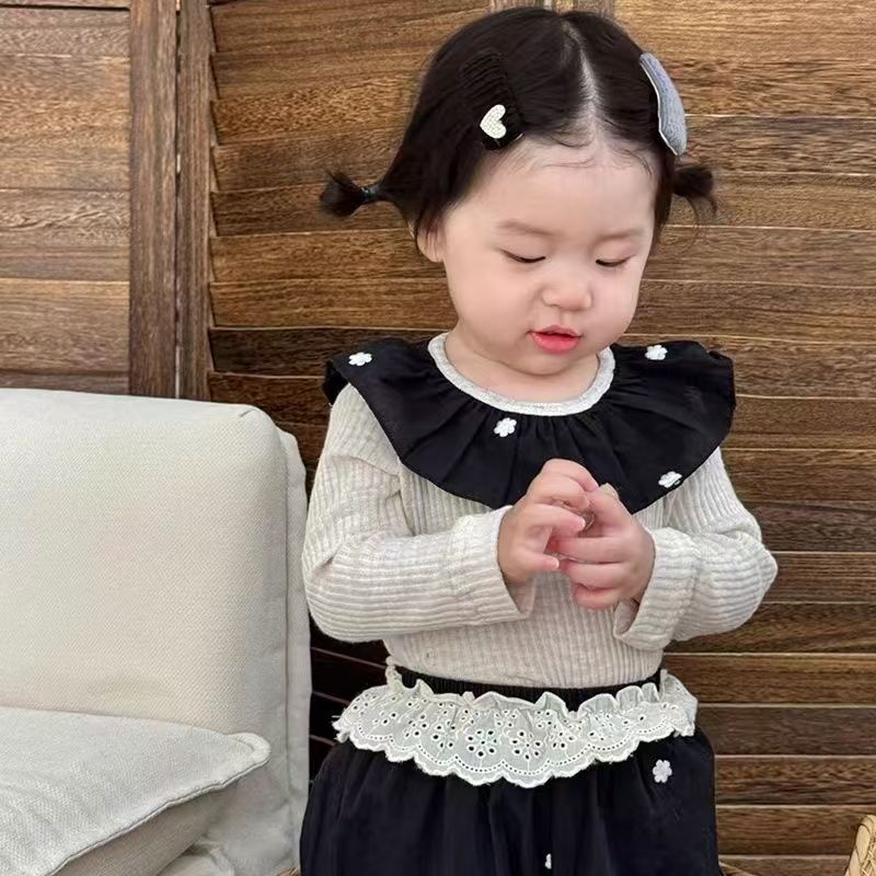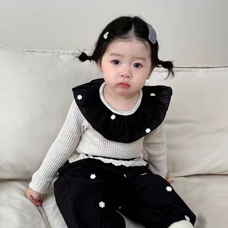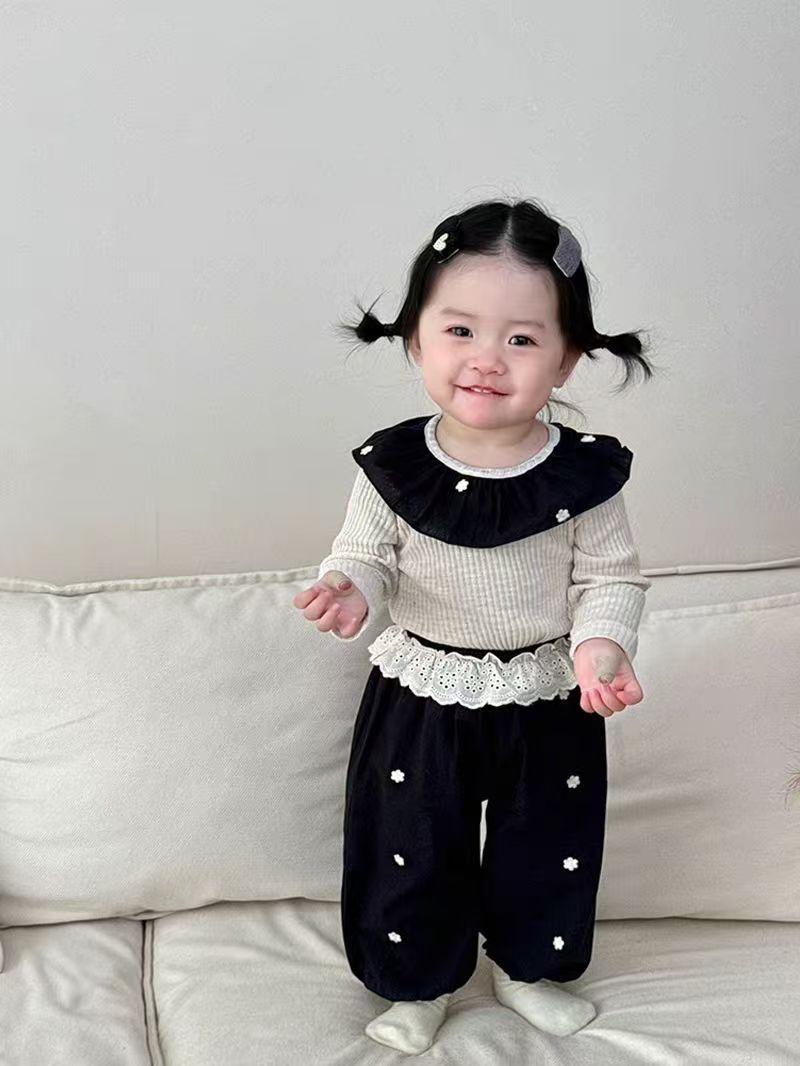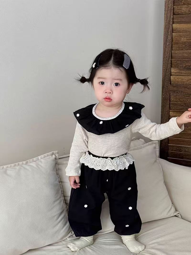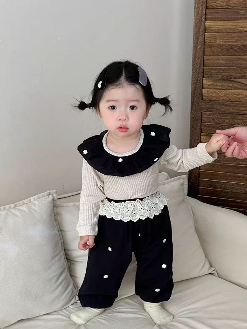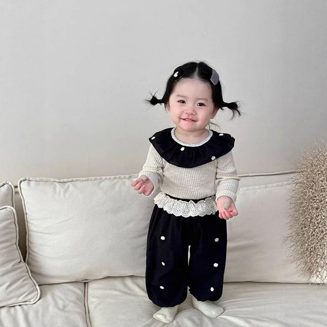 한국 가을 아기 세트 수 놓은 꽃 연꽃 목걸이 긴 소매 보틀 셔츠 여성용 레이스 바지 2 피스 세트