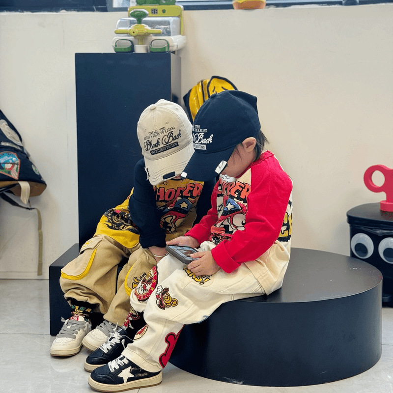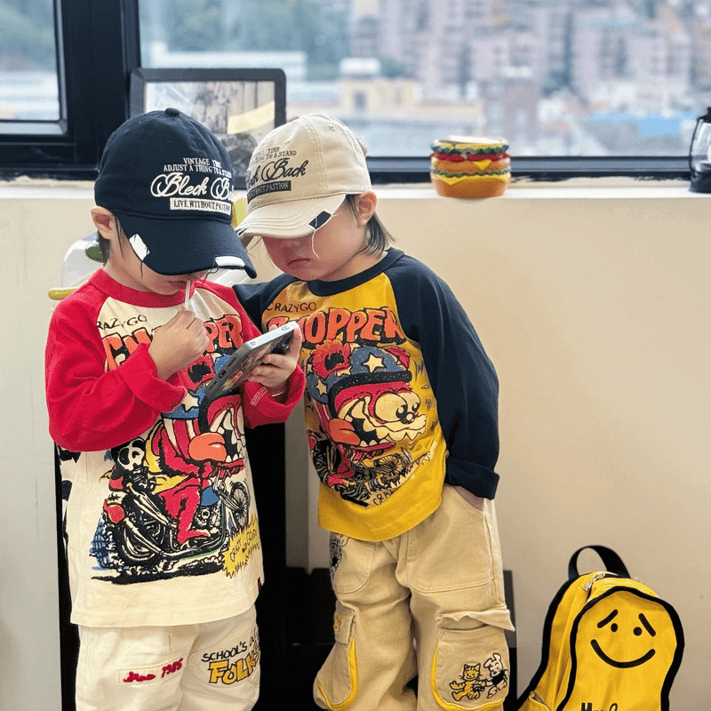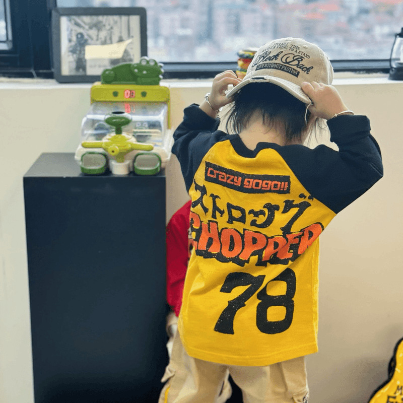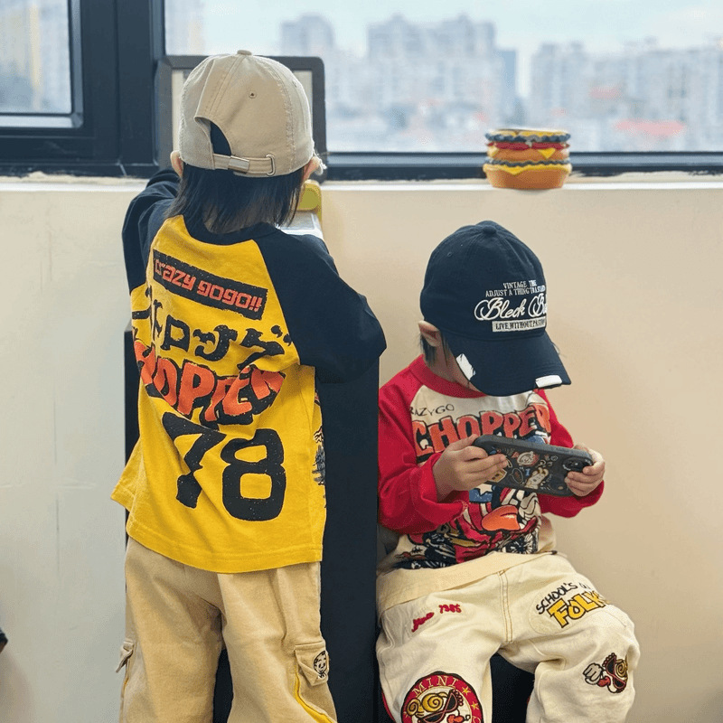 재고 소년 소녀 아기 2024 가을 새로운 컬러 오토바이 인쇄 플러그인 소매 어린이 긴 소매 티셔츠베이스 셔츠스토어 가기