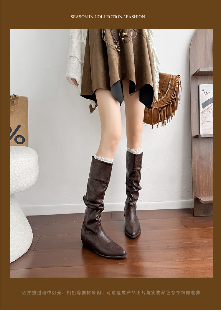 주름 스퀘어 헤드 필 부츠 영국 스타일 나이트 부츠 두꺼운 낮은 힐 부츠하지만 무릎 패션 가을 싱글 부츠 작은 모양 얇은
