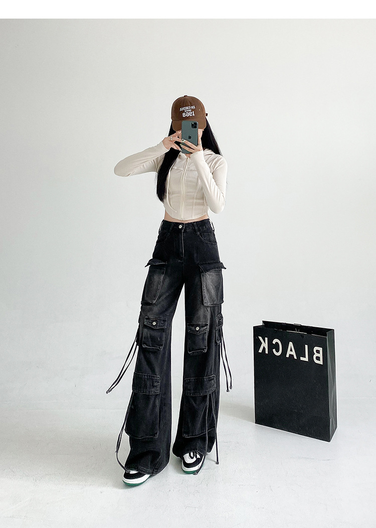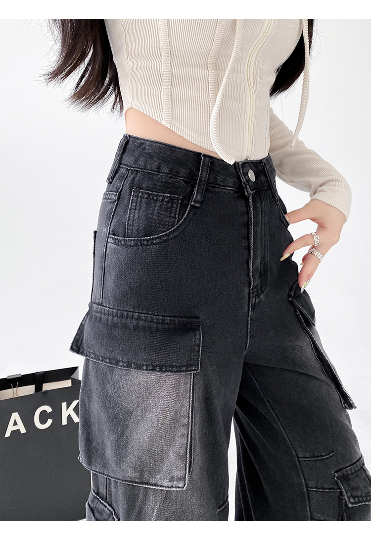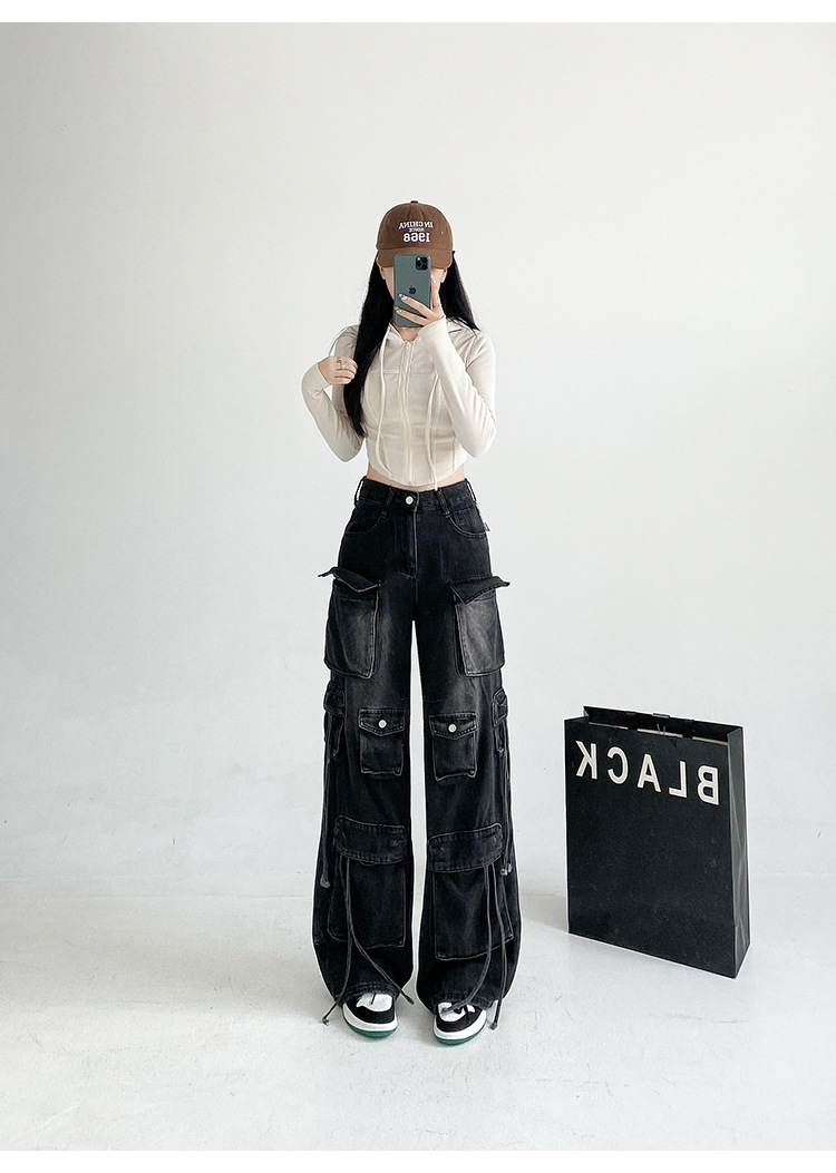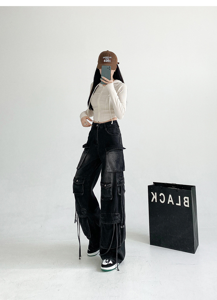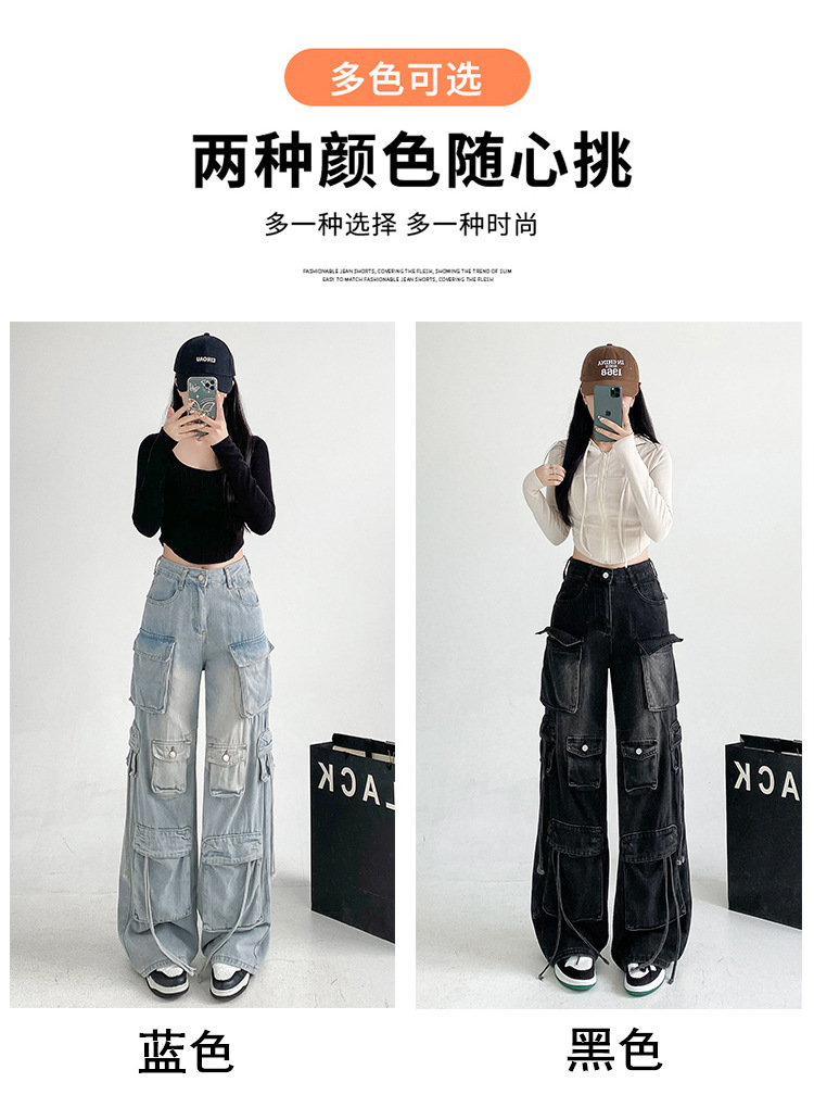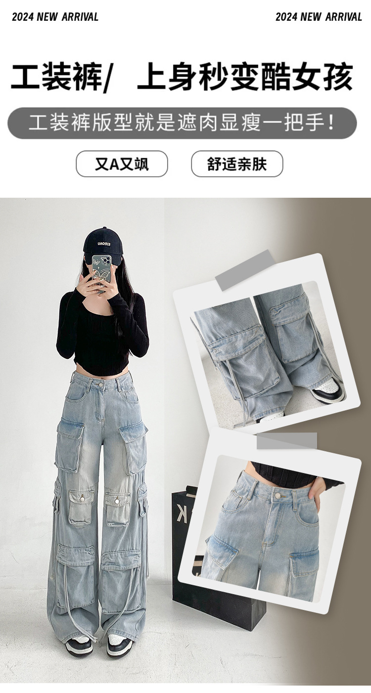 잘 생긴 멀티 포켓 캐주얼 와이드 레그 청바지 여성의 가을 2024 새로운 높은 허리 느슨한 슬리밍 스트레이트 오버볼스토어 가기