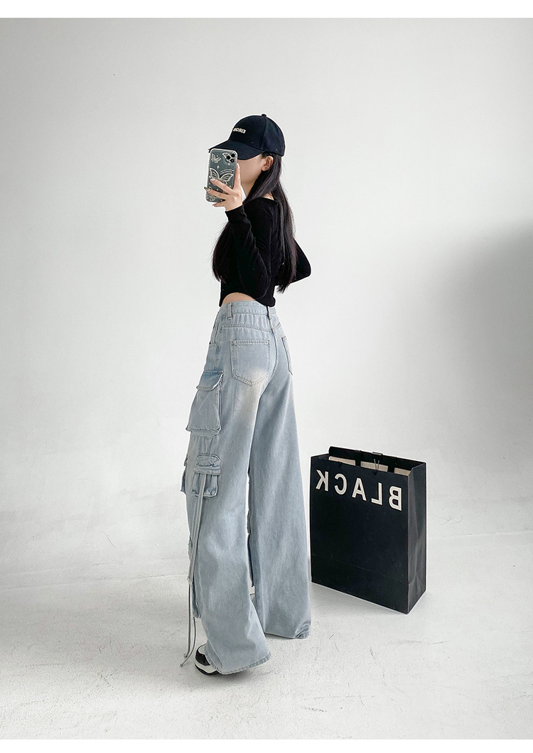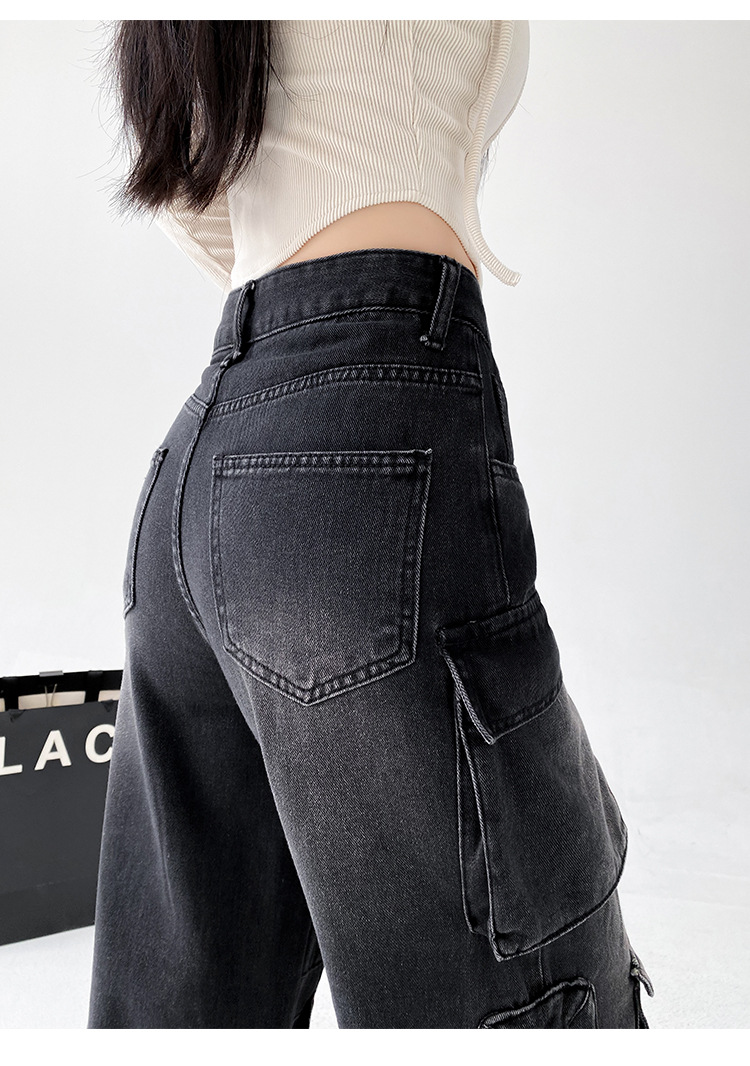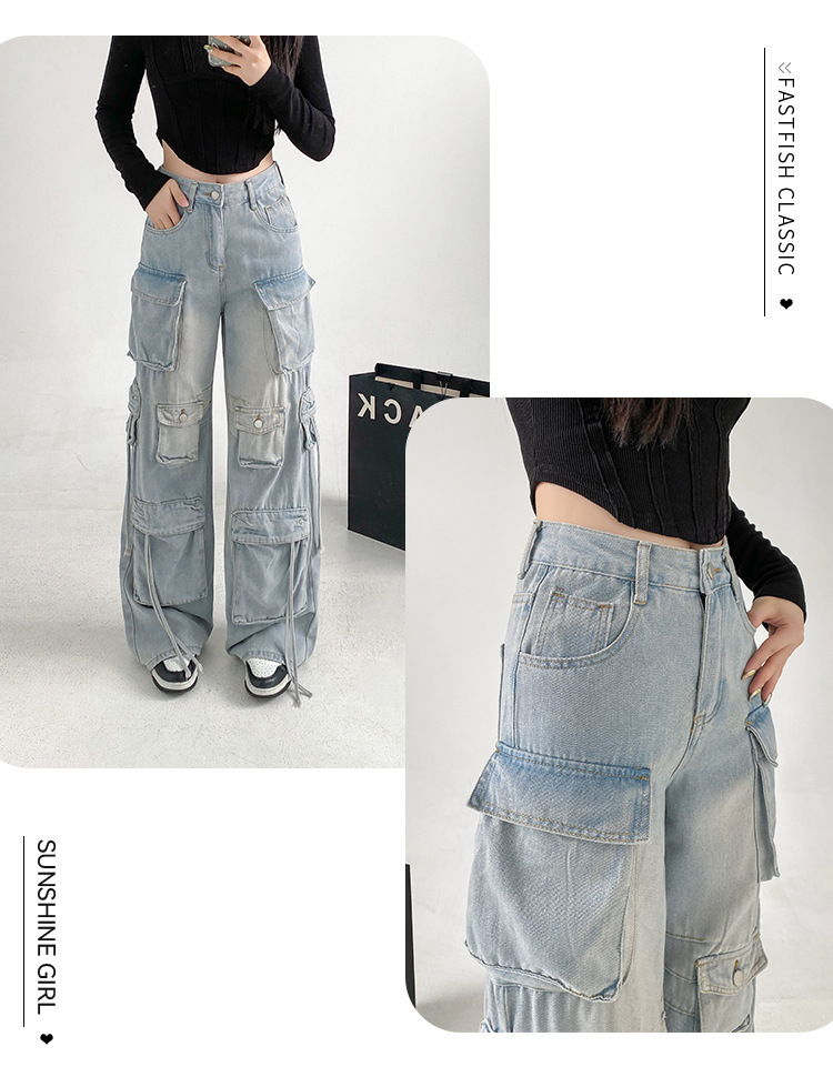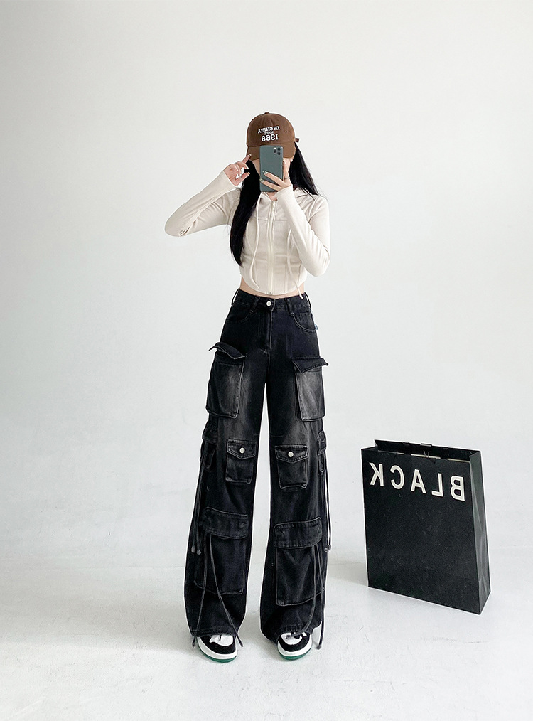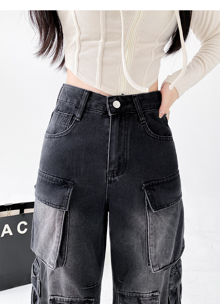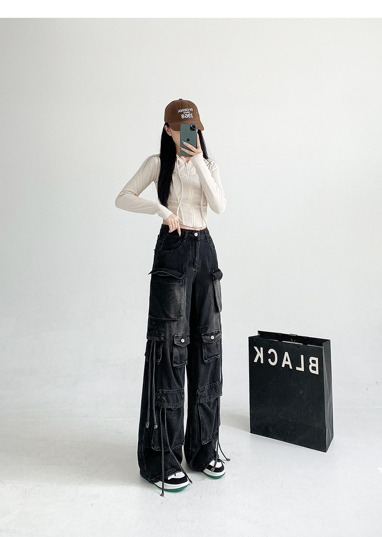 잘 생긴 멀티 포켓 캐주얼 와이드 레그 청바지 여성의 가을 2024 새로운 높은 허리 느슨한 슬리밍 스트레이트 오버볼스토어 가기