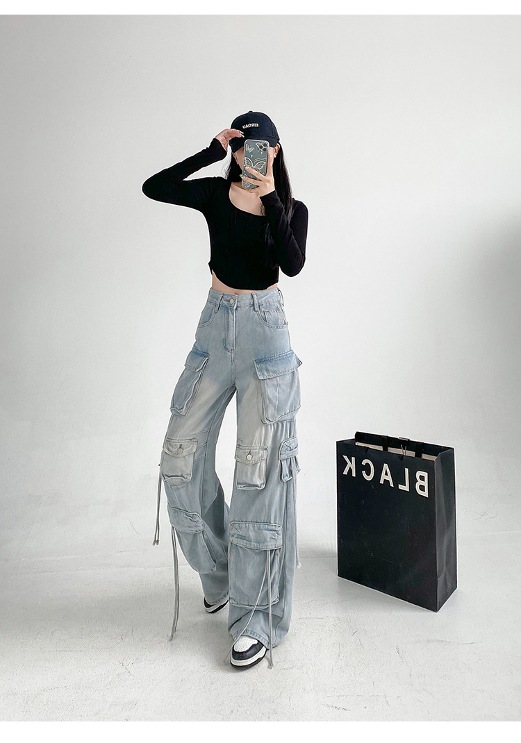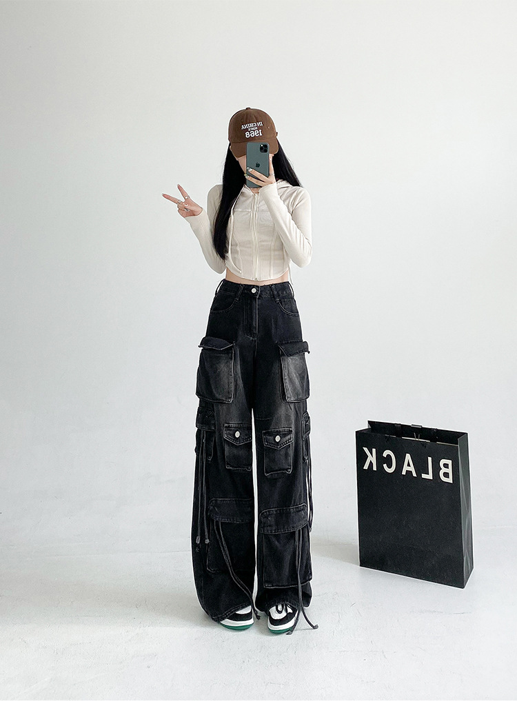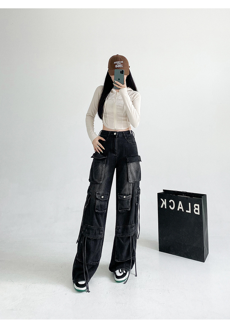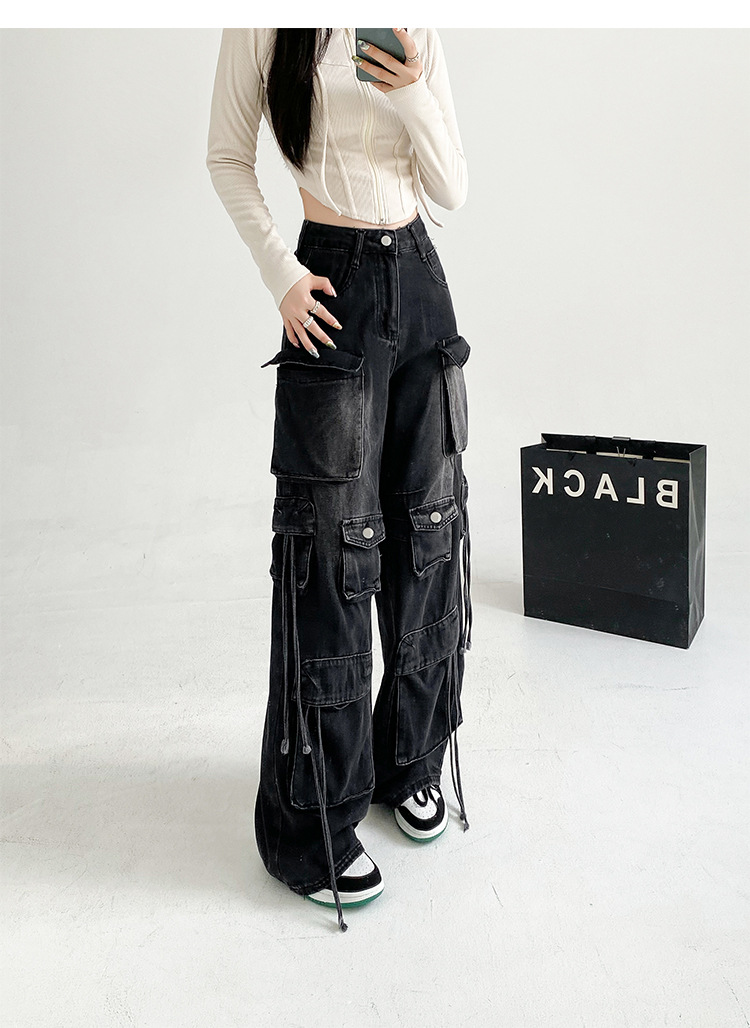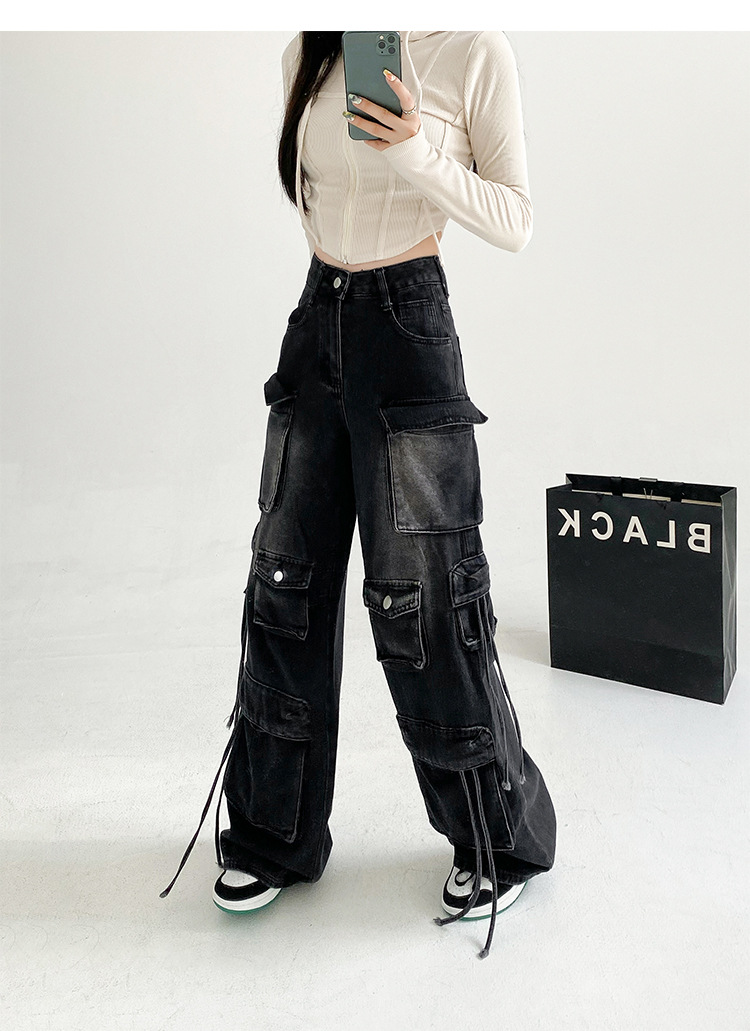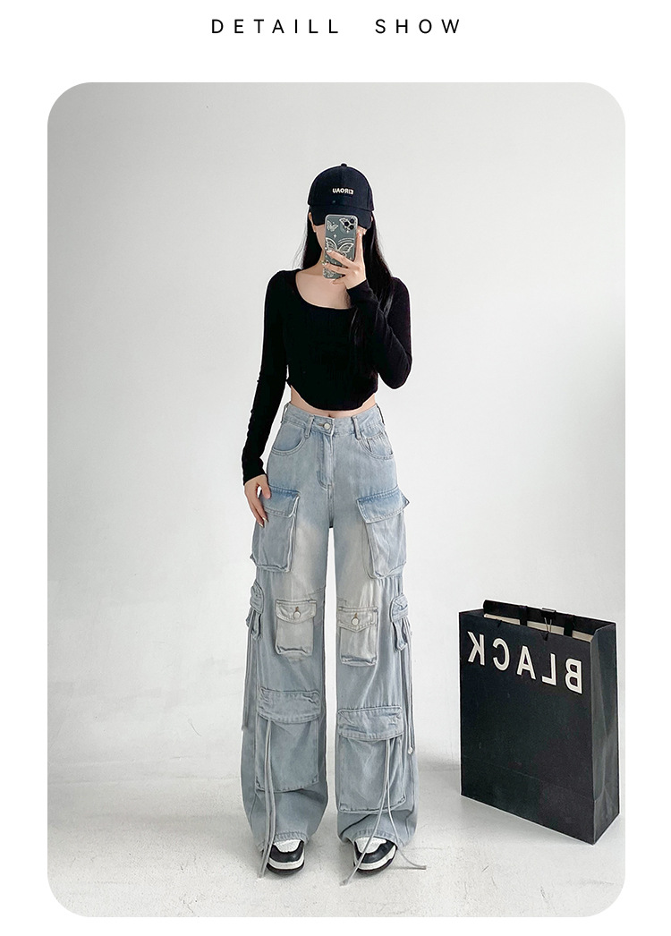 잘 생긴 멀티 포켓 캐주얼 와이드 레그 청바지 여성의 가을 2024 새로운 높은 허리 느슨한 슬리밍 스트레이트 오버볼스토어 가기