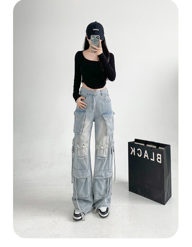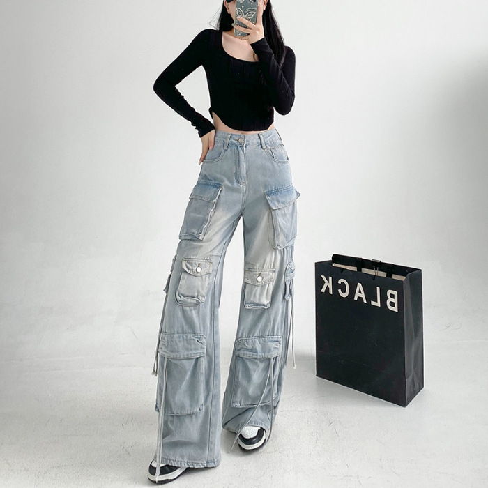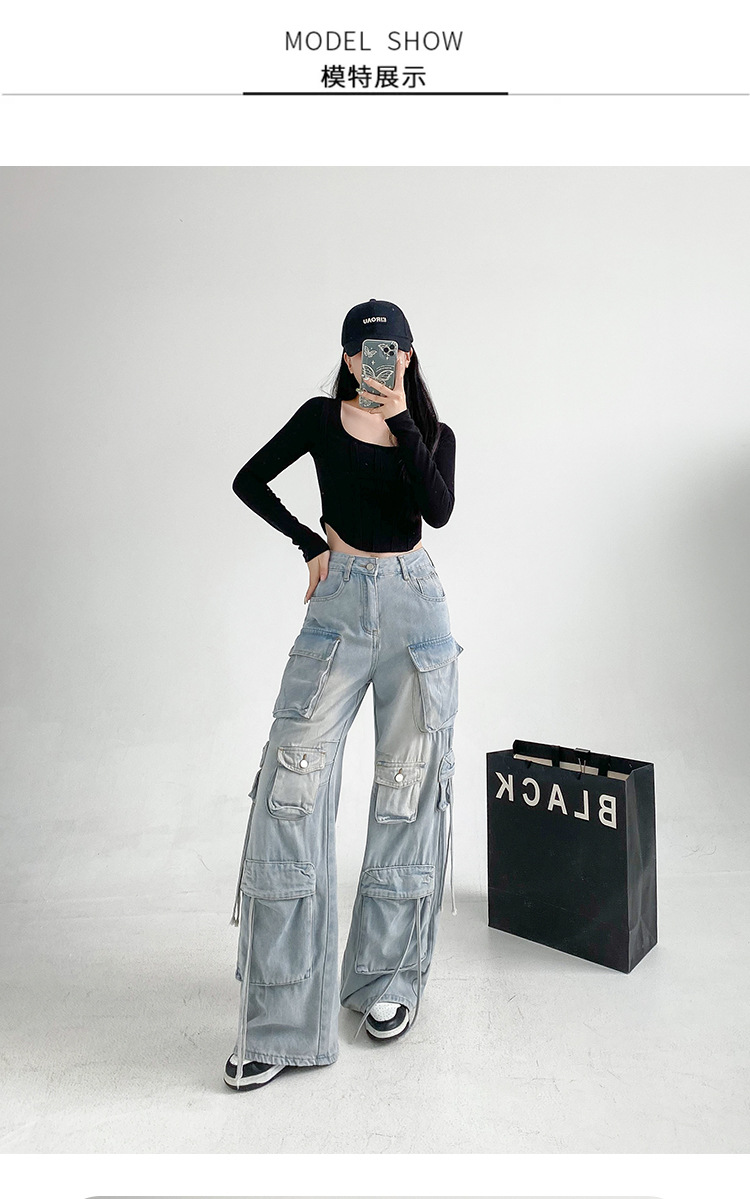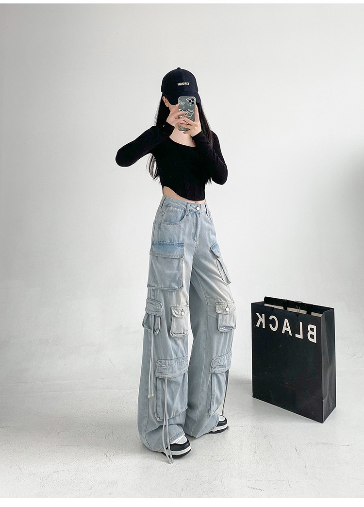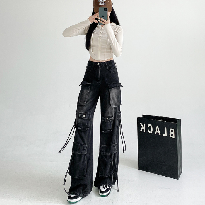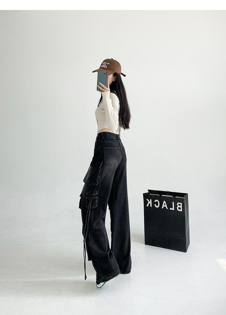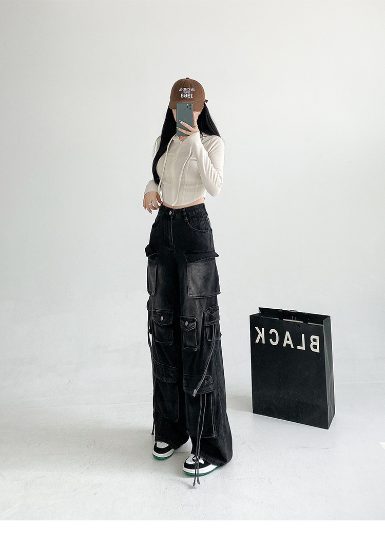 잘 생긴 멀티 포켓 캐주얼 와이드 레그 청바지 여성의 가을 2024 새로운 높은 허리 느슨한 슬리밍 스트레이트 오버볼스토어 가기