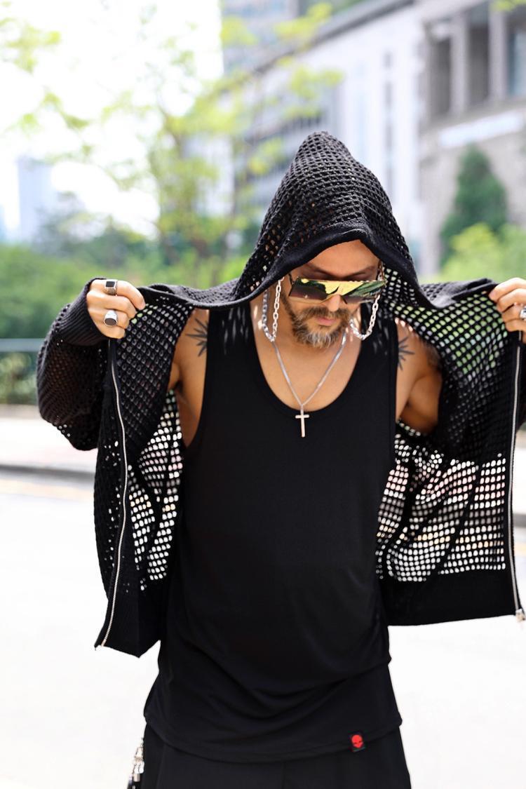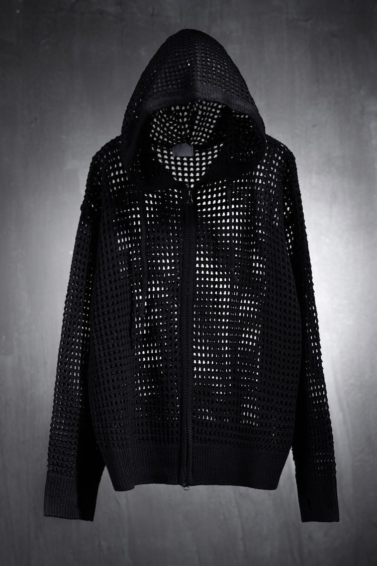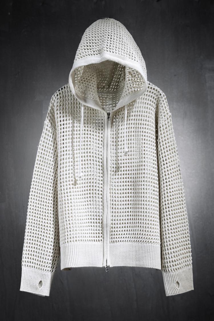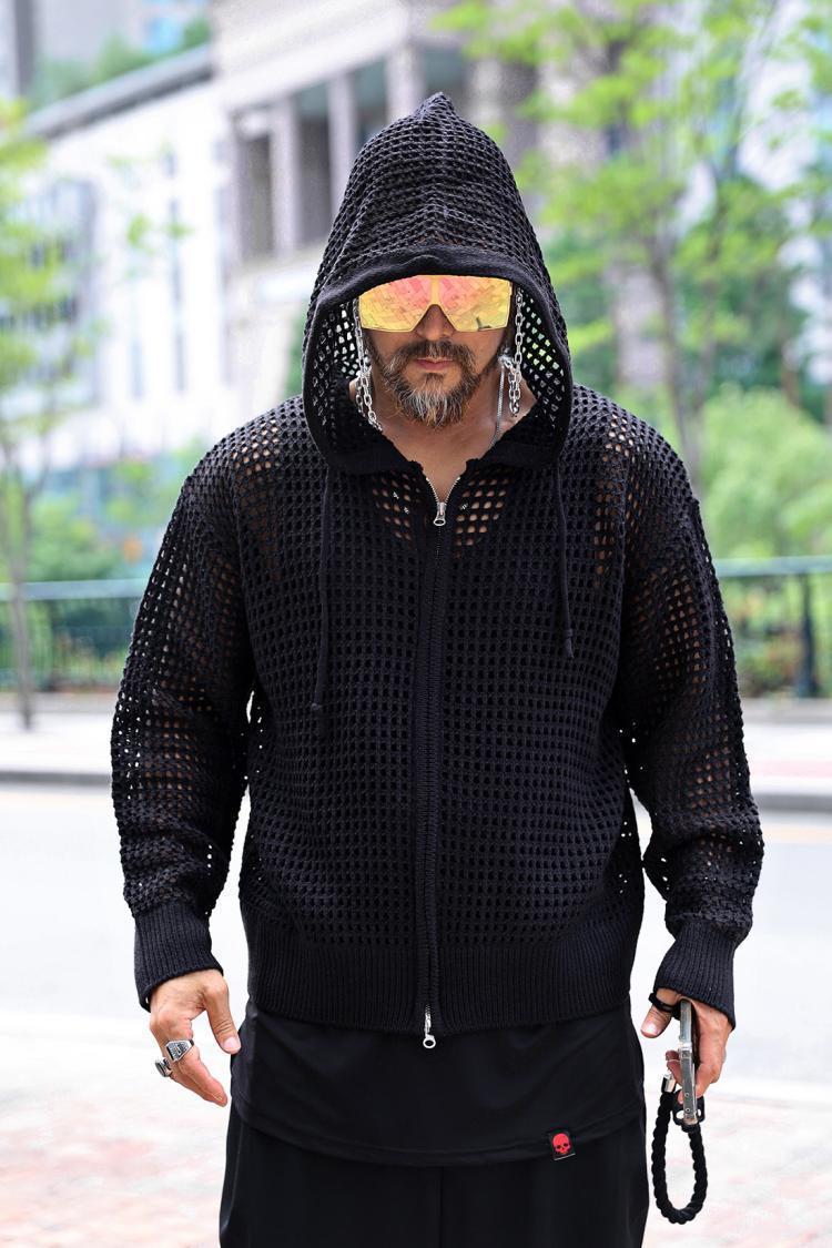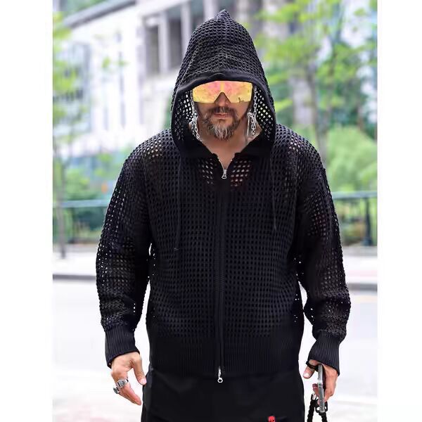 유럽 중공 후드 니트웨어 남성용 고급 메쉬 긴팔 태양 보호 의류 메쉬 울 스웨터 카디건 재킷