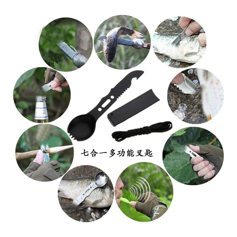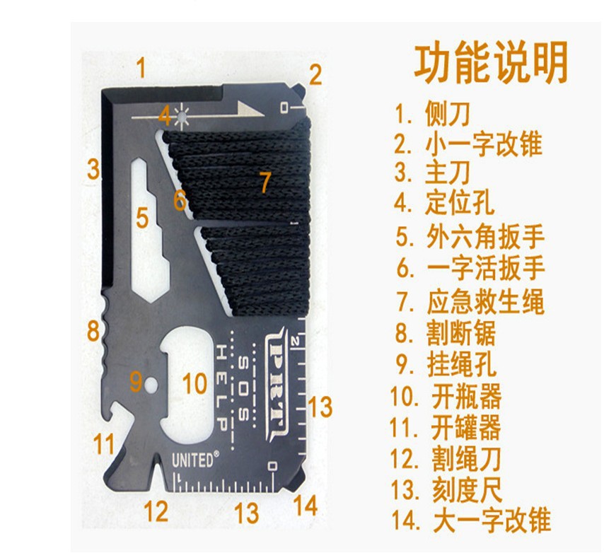 产品明细:防水盒*1,破窗笔*1,3挡电筒*1,指南针*1,螺丝刀*2,,拉锯*1,水瓶挂扣*1,大刀*1,餐具*1,手绳*1,吹火筒*1,打火棒*1,,多功能卡刀*1,登山扣*1,急救毯