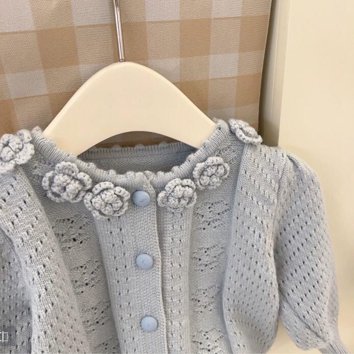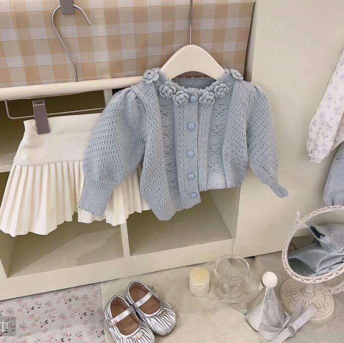 한국 스타일 소녀 2024 봄과 가을 새로운 달콤한 서양식 푸른 꽃 니트 카디건 화이트 주름 치마 투피스 세트스토어 가기