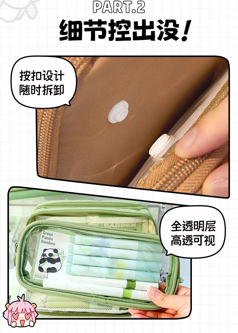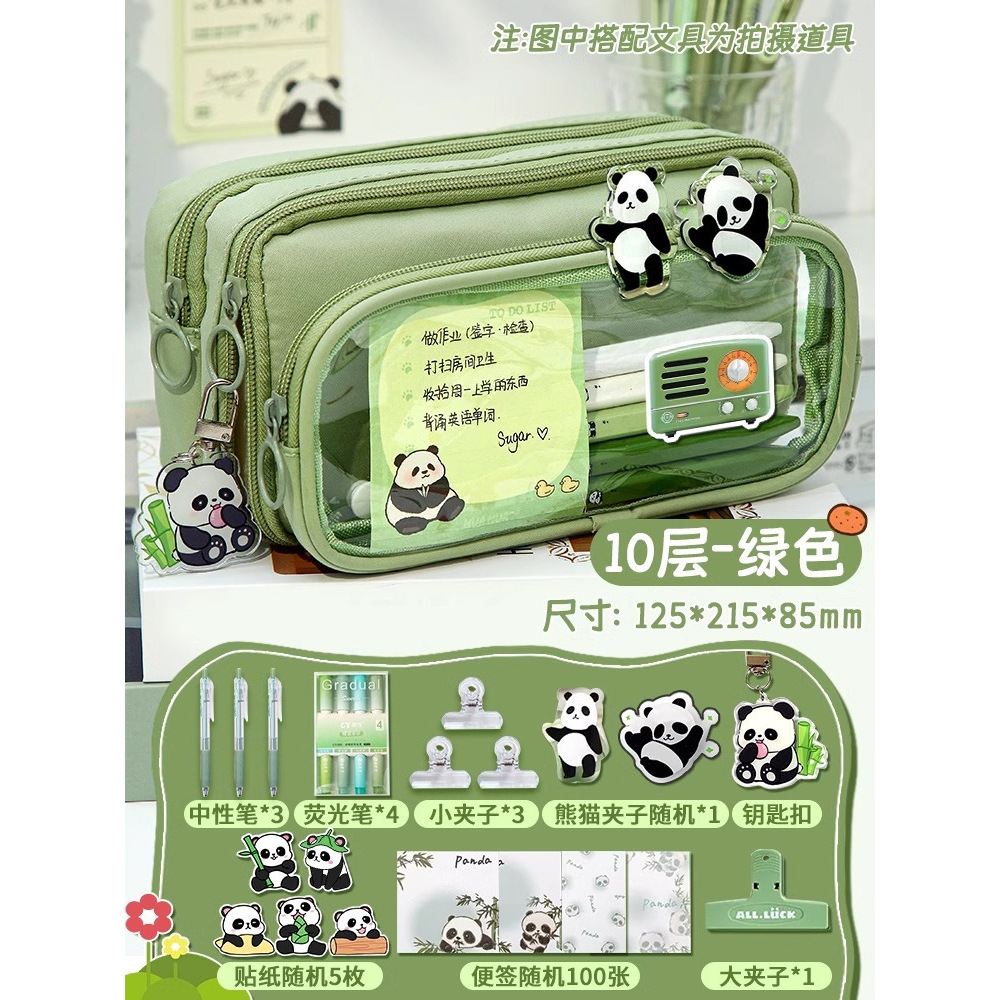 • [10겹 - 탈부착 가능한 투명 전면 포켓] 녹색 필통 + 선물 가방 + 대형 클립 1개 + 팬더 클립 + 소형 클립 5개 + 펜 5개 + 형광펜 4개 + 수정테이프 3개 + 책 1개