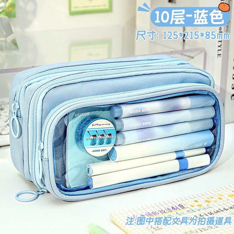 • [10겹 - 탈부착 가능한 투명 전면 포켓] 파란색 필통 + 스티커 5개 + 노트 50개