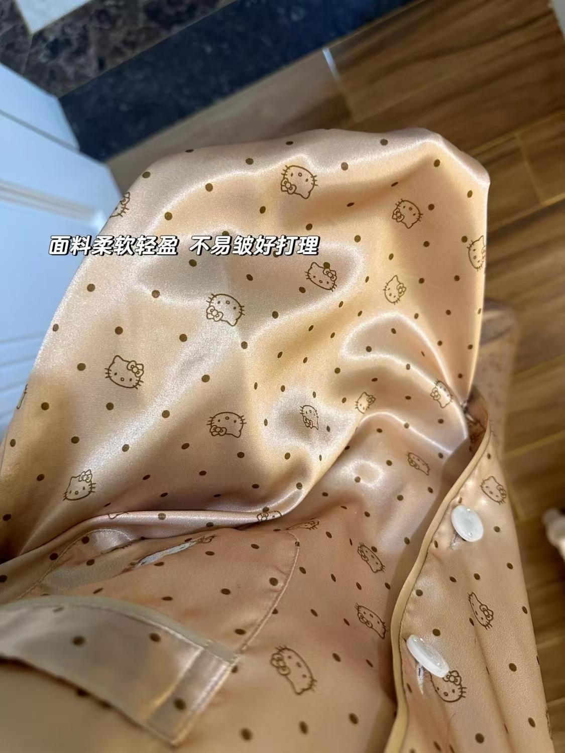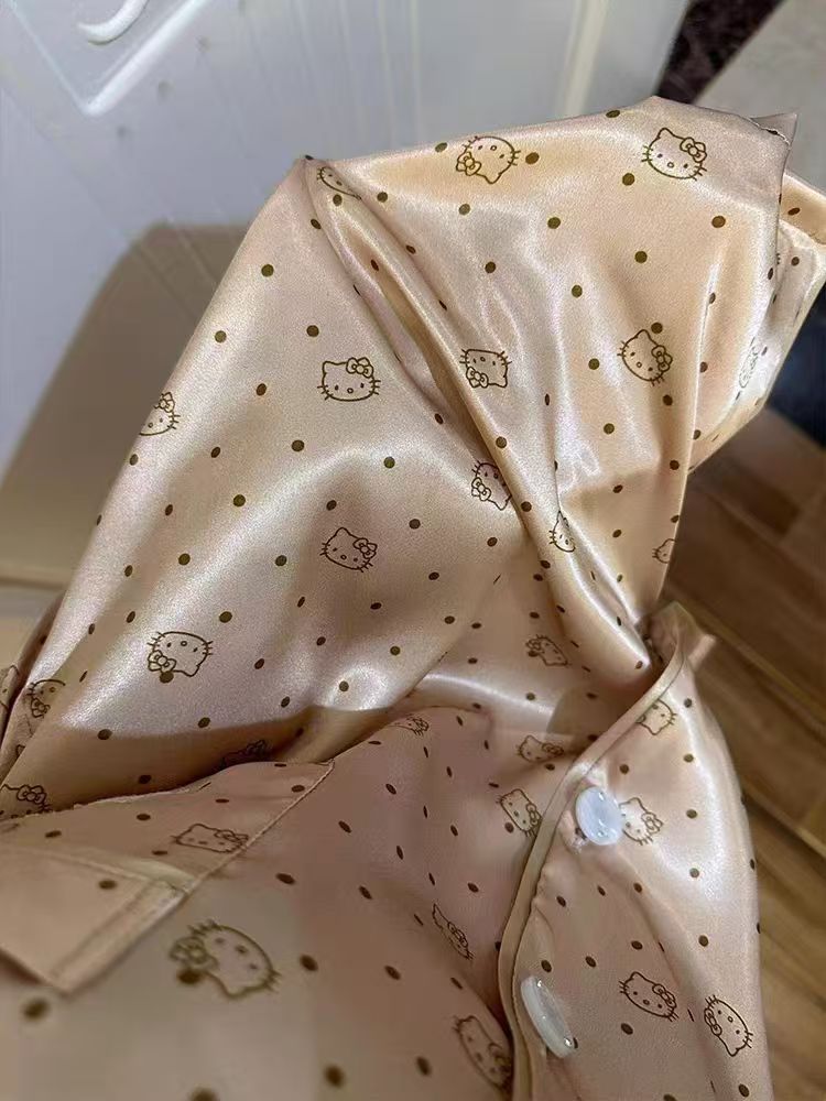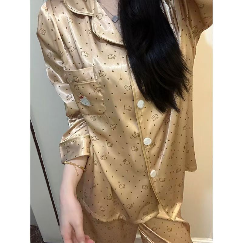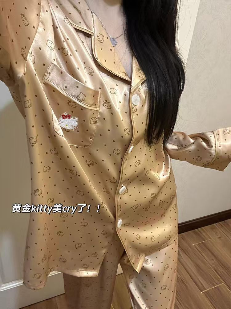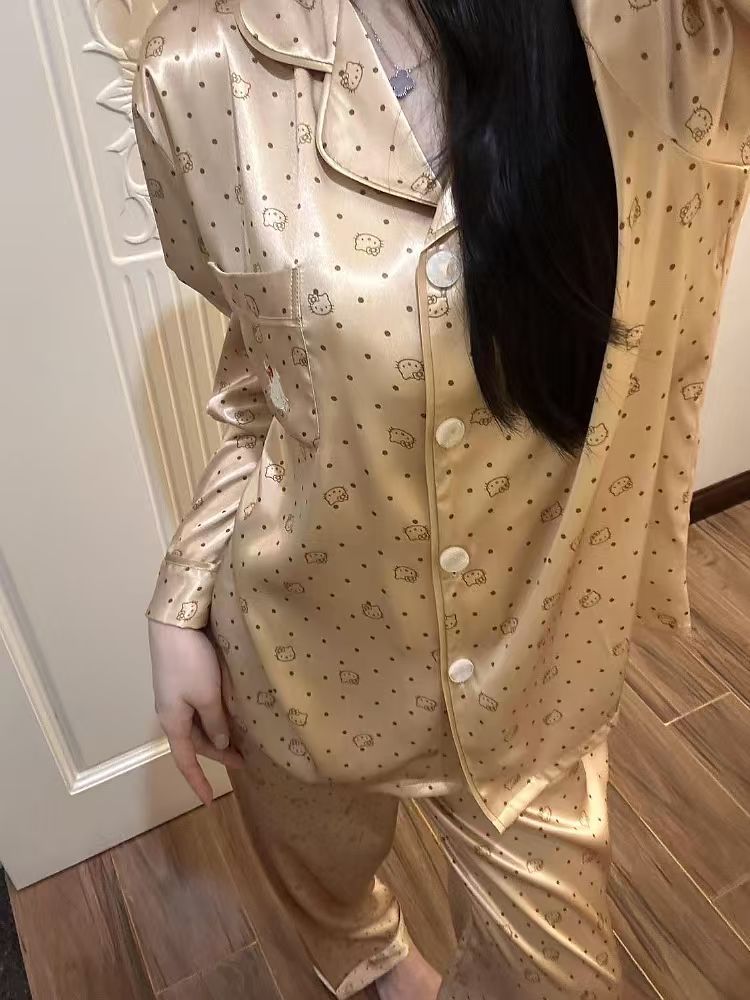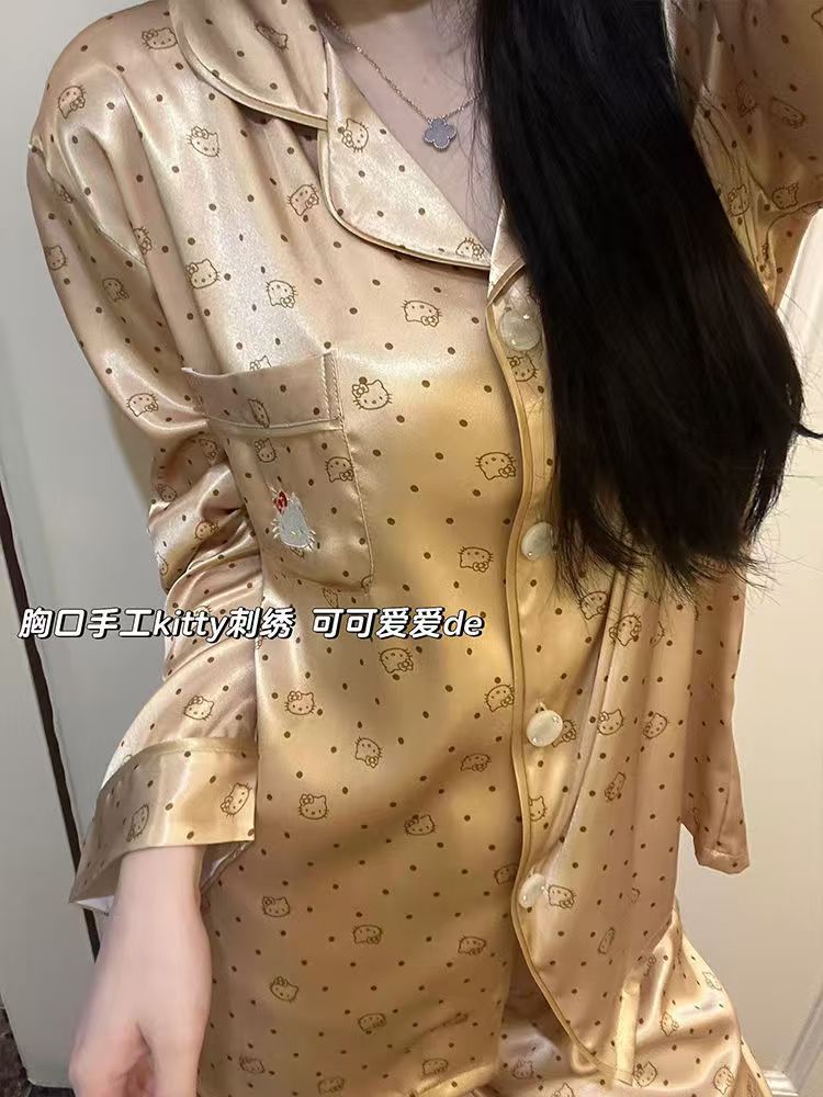 아이스 실크 잠옷 여성의 봄과 가을 대외 무역 도매 인쇄 귀여운 헬로 키티 긴 소매 광택 숙녀 홈 의류 세트스토어 가기