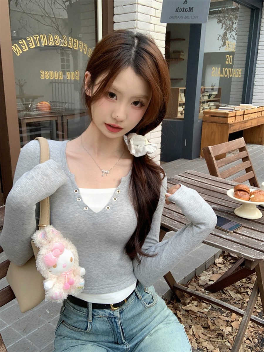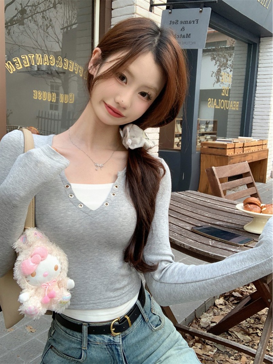 퓨어 스파이스 걸스 V 넥 가짜 투피스 타이트 긴팔 티셔츠 여성용 컬러 매칭베이스 셔츠 디자인 섹시한 슬림 쇼트 탑스토어 가기