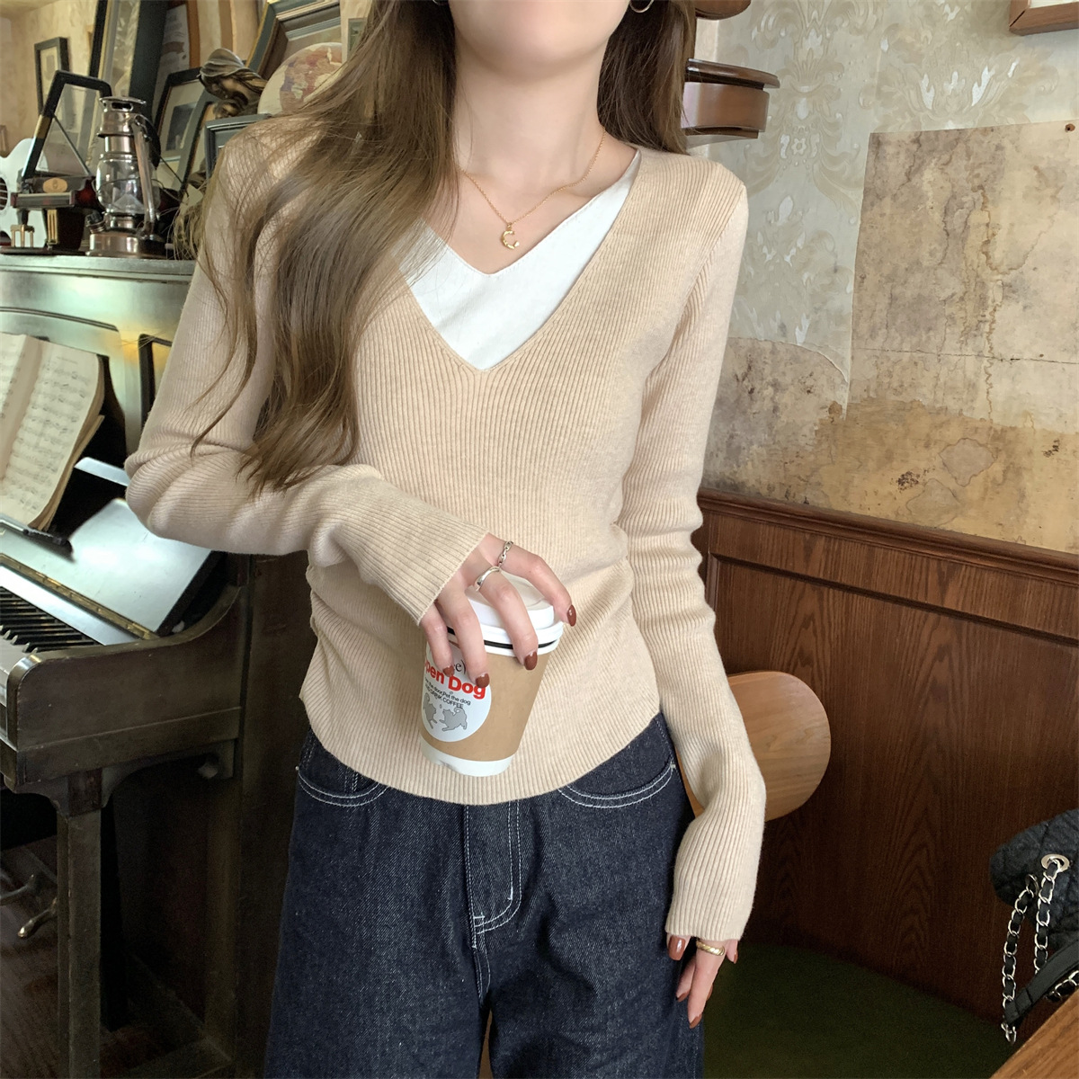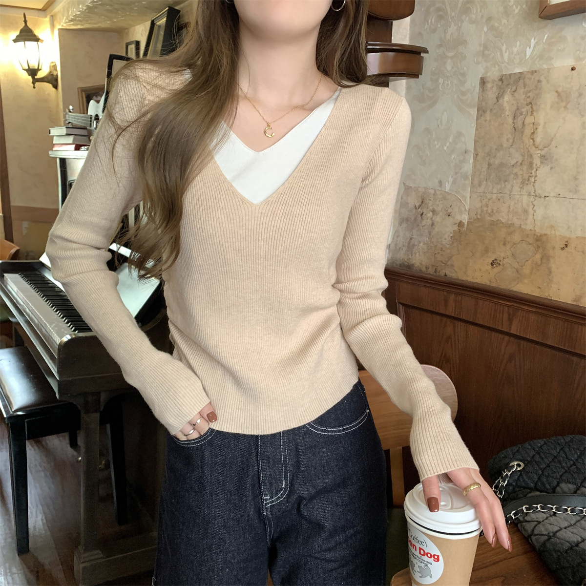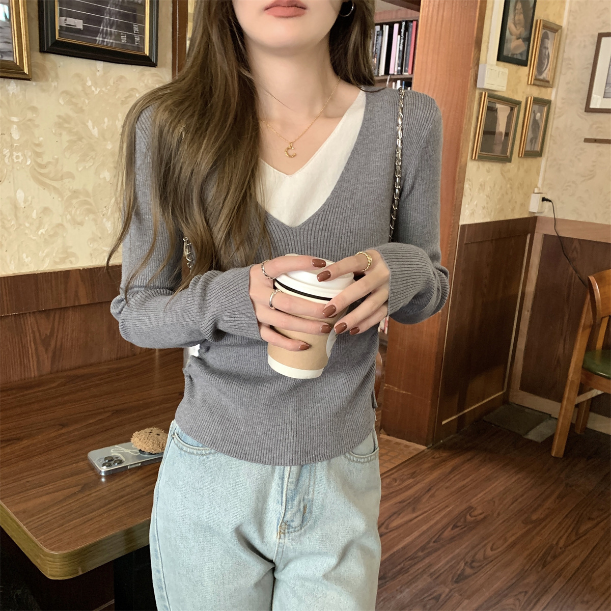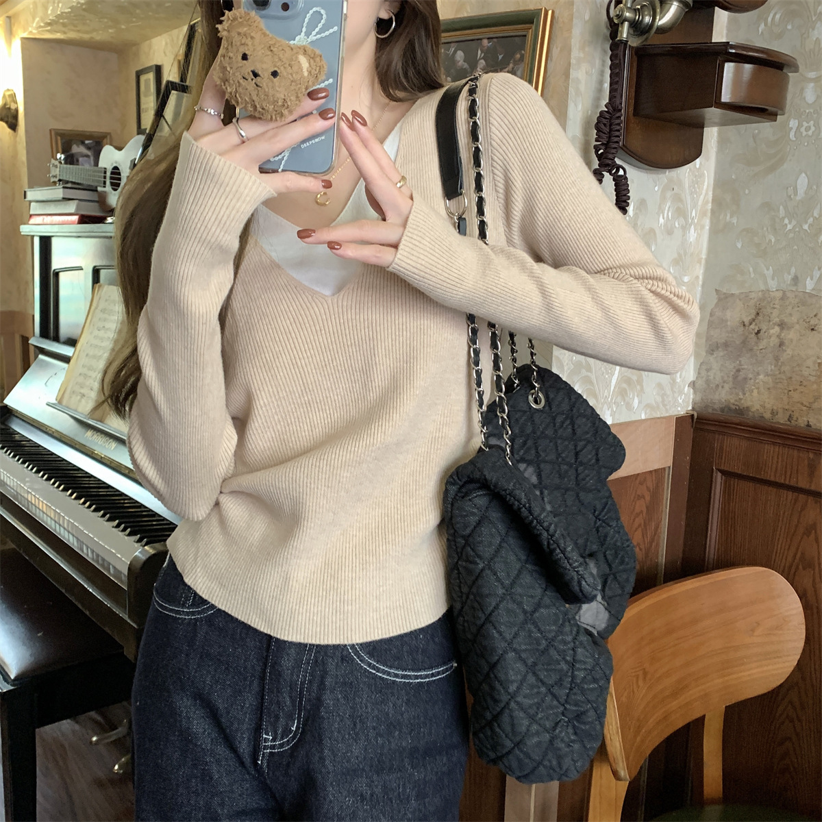 디자인 센스 V 넥 가짜 투피스 스티칭 니트웨어 스웨터 여성의 2024 가을 한국 슬림 핏 내부 캐주얼 탑
