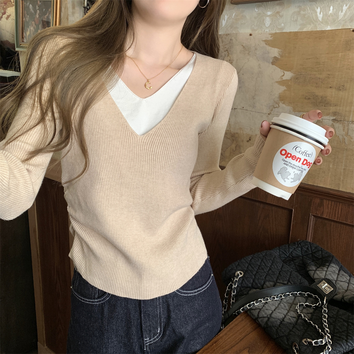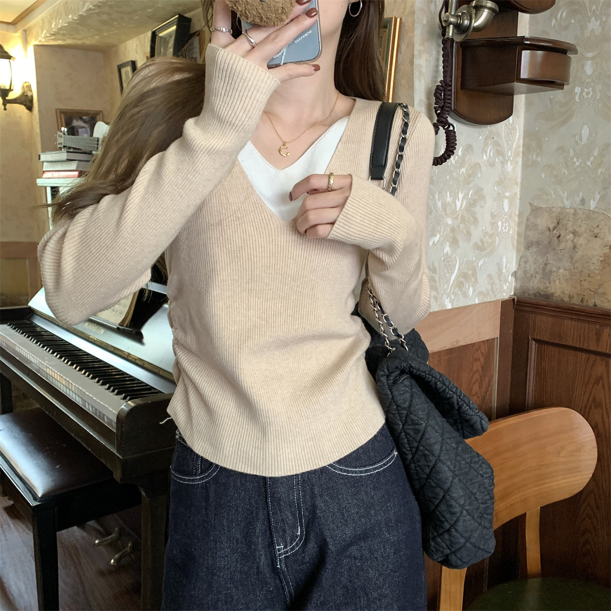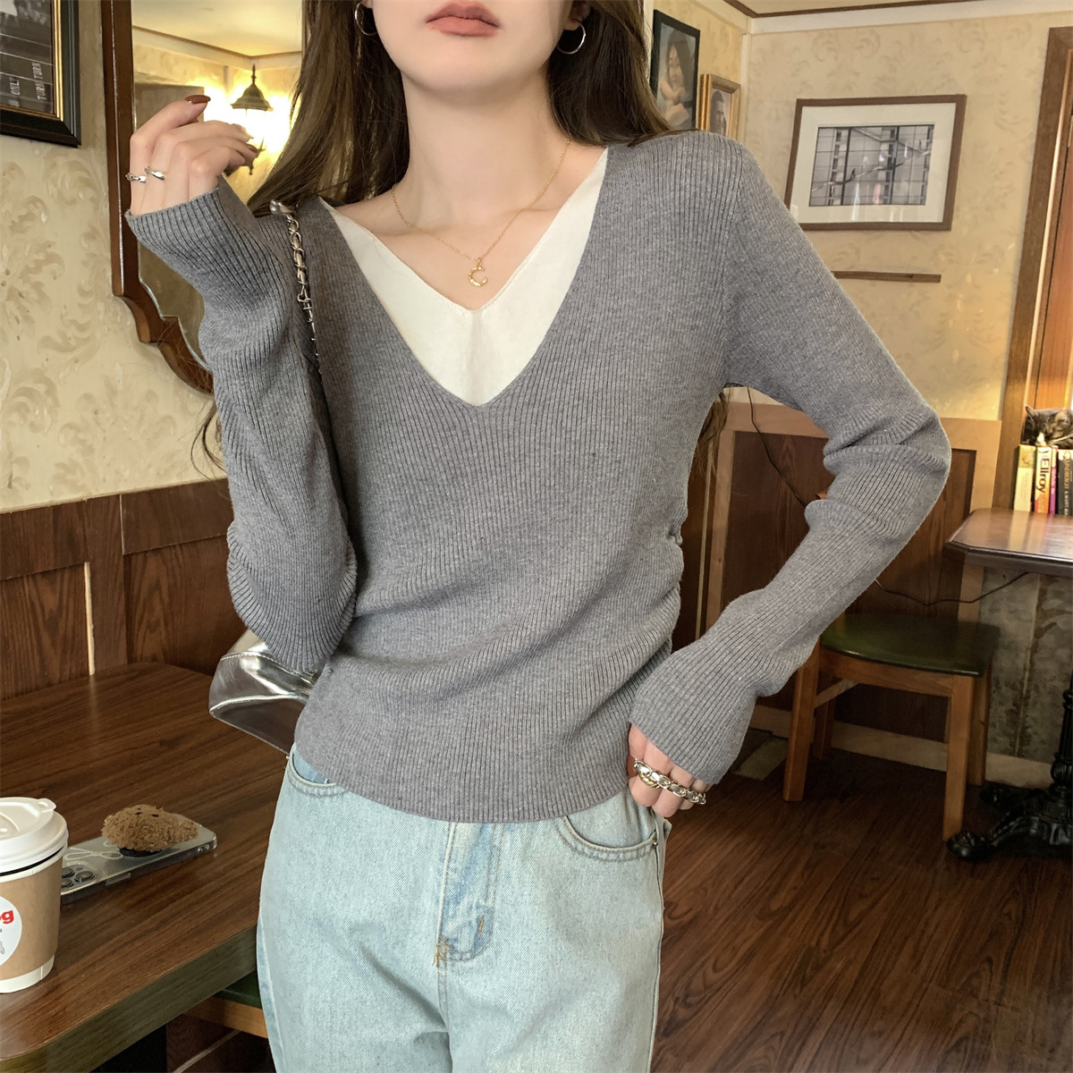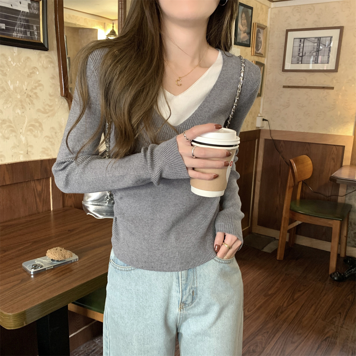 디자인 센스 V 넥 가짜 투피스 스티칭 니트웨어 스웨터 여성의 2024 가을 한국 슬림 핏 내부 캐주얼 탑