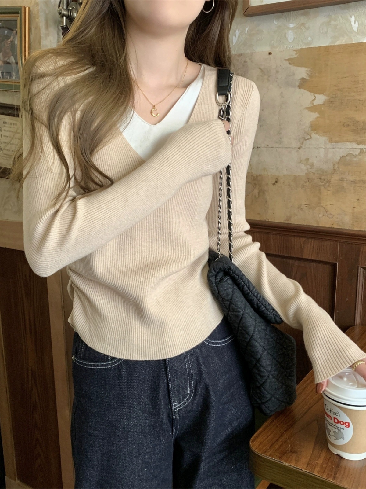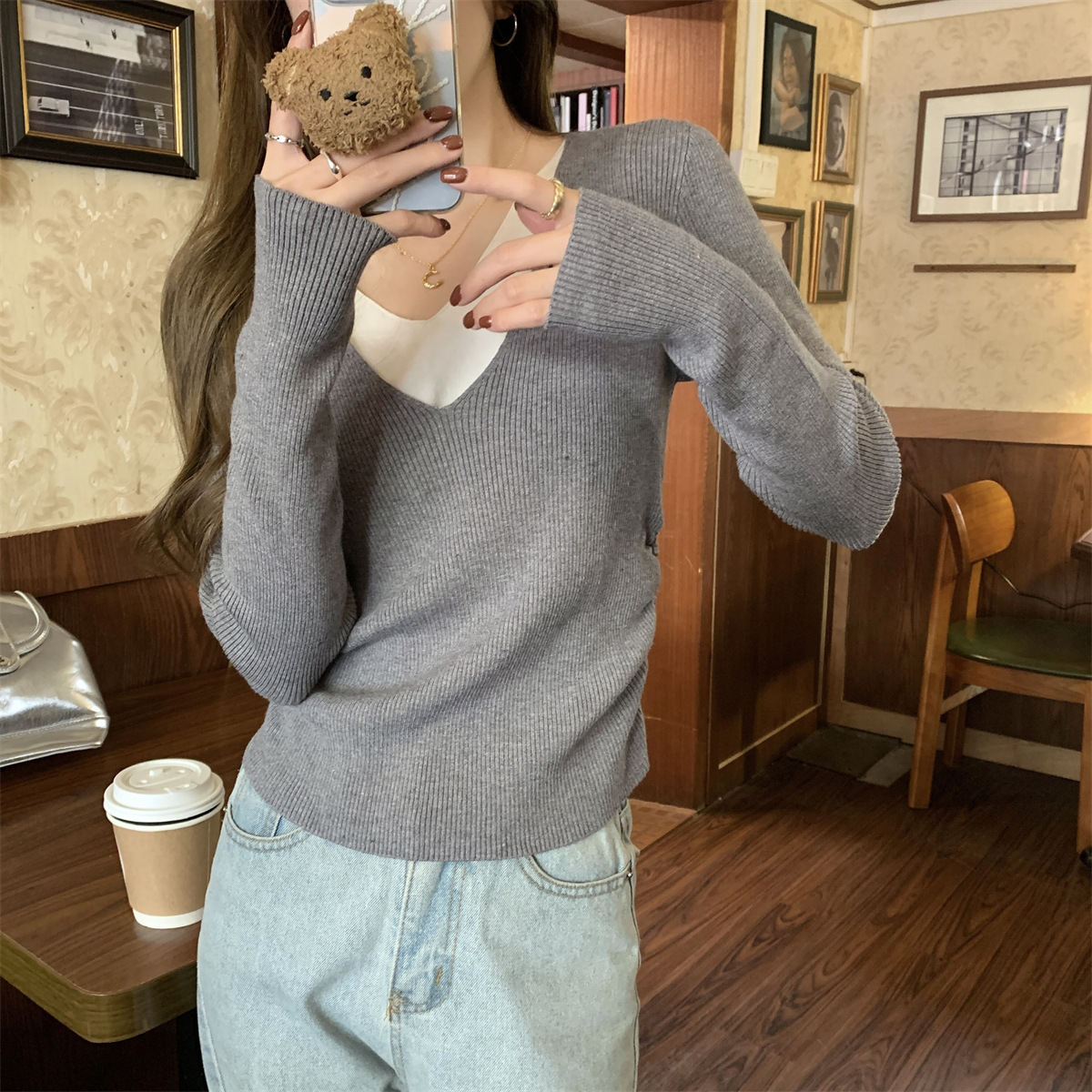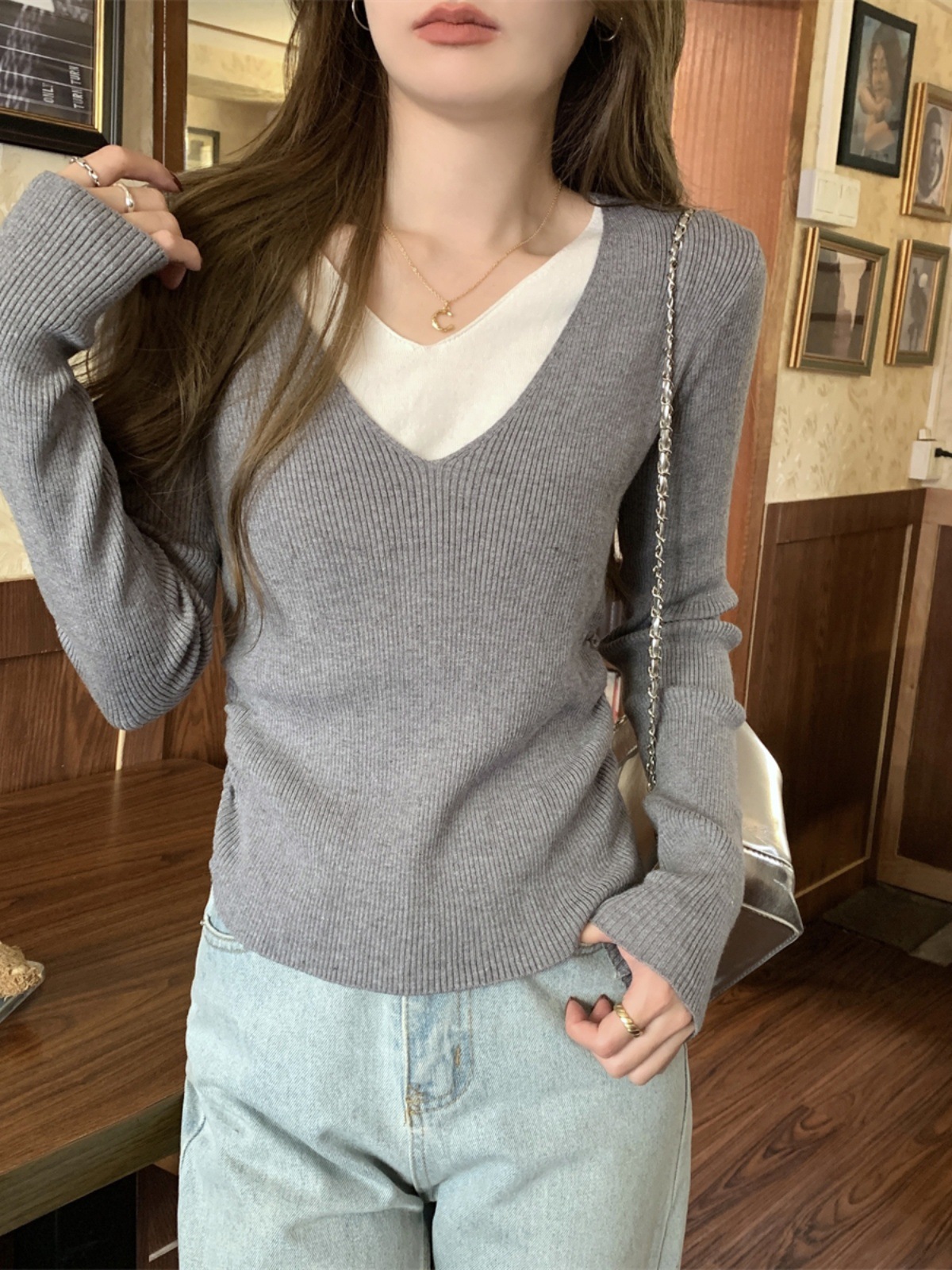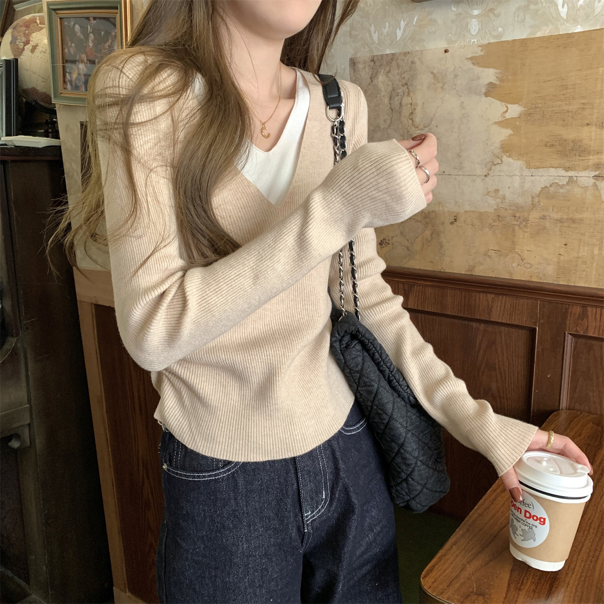 디자인 센스 V 넥 가짜 투피스 스티칭 니트웨어 스웨터 여성의 2024 가을 한국 슬림 핏 내부 캐주얼 탑