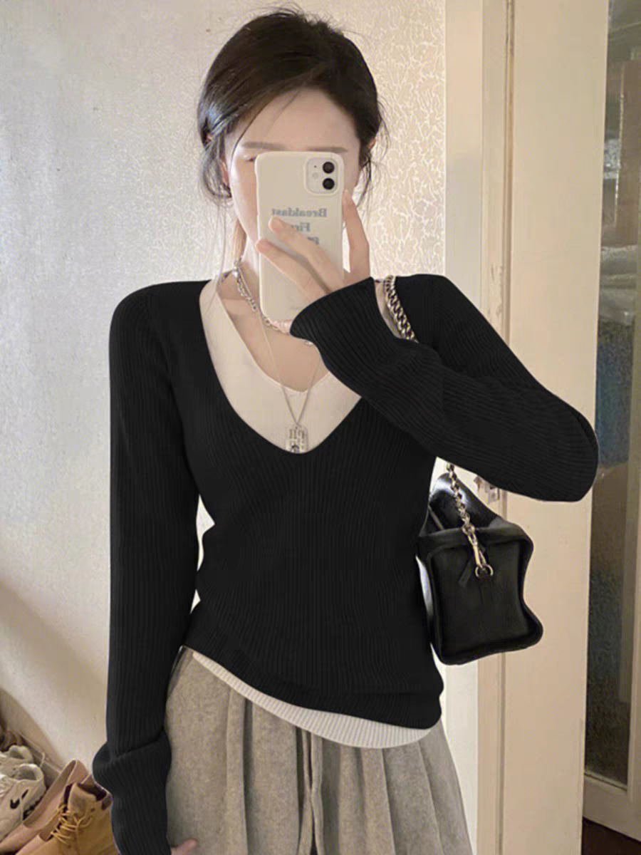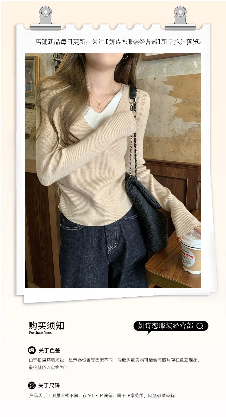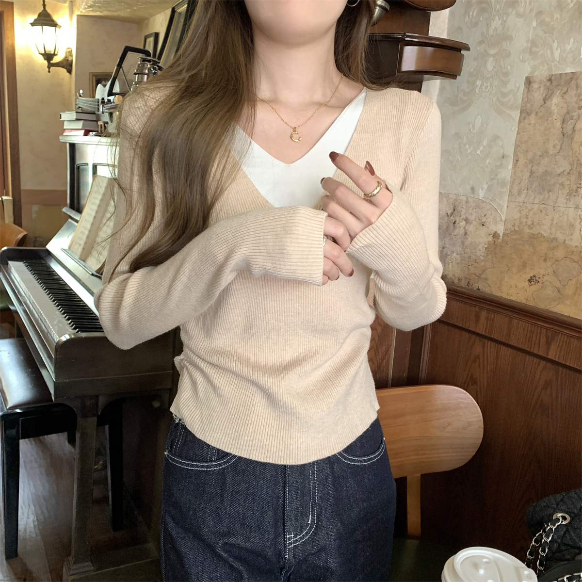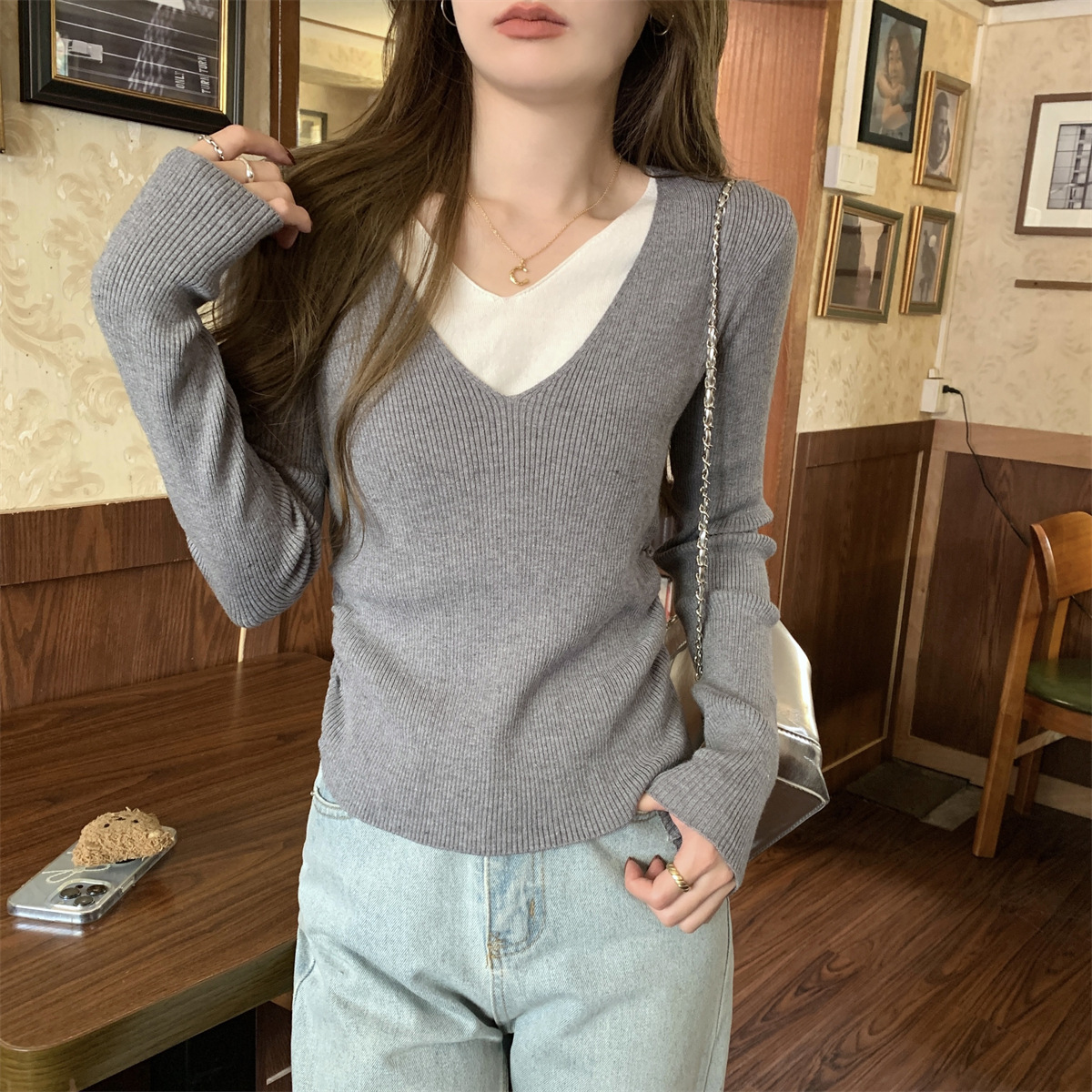 디자인 센스 V 넥 가짜 투피스 스티칭 니트웨어 스웨터 여성의 2024 가을 한국 슬림 핏 내부 캐주얼 탑