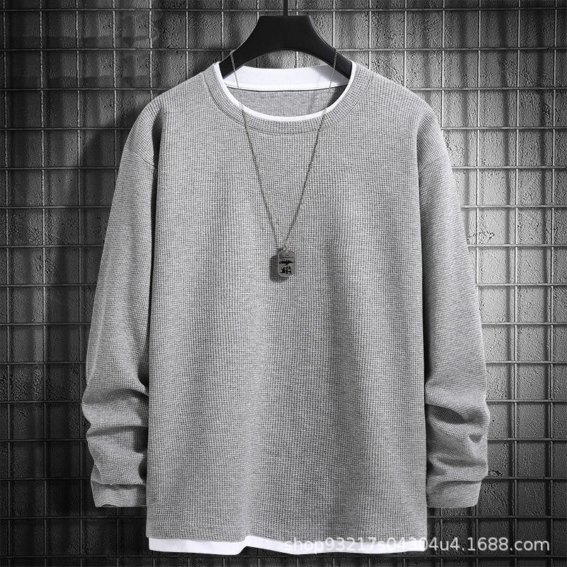 가짜 2 피스 와플 봄과 가을 무거운 크루 넥 긴팔 티셔츠 남자 단색 올매치 플러스 사이즈 남성베이스 셔츠 트렌디